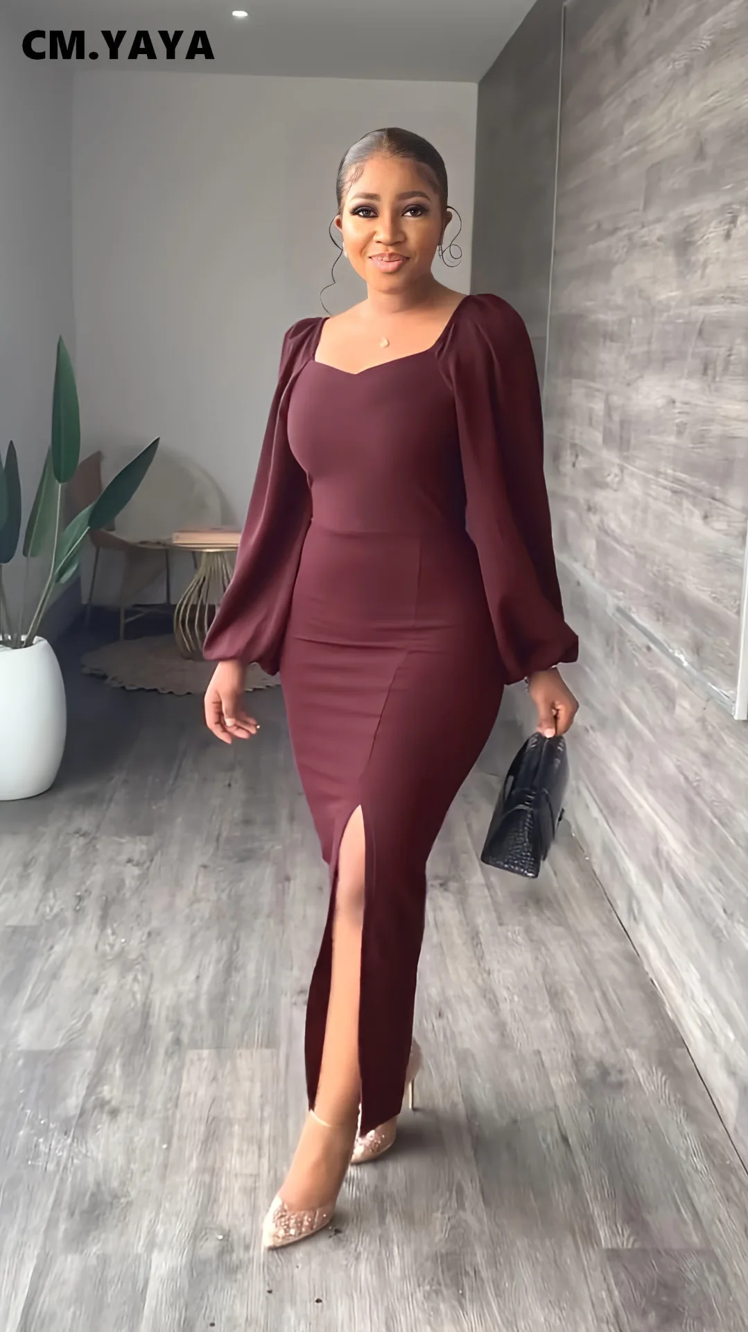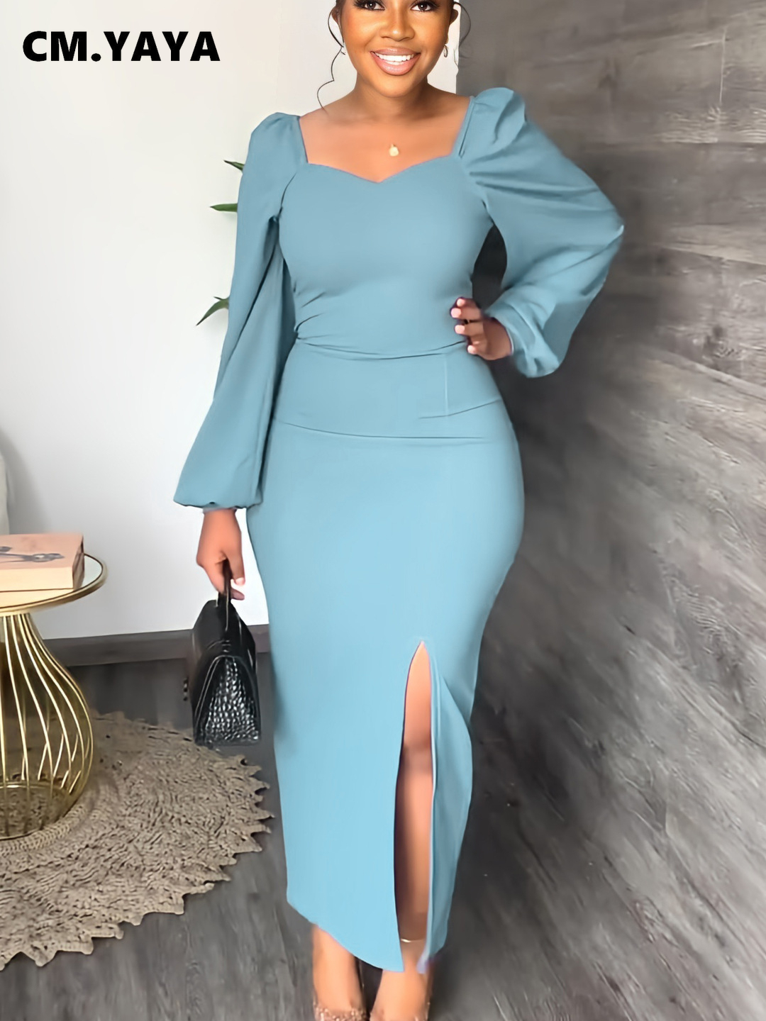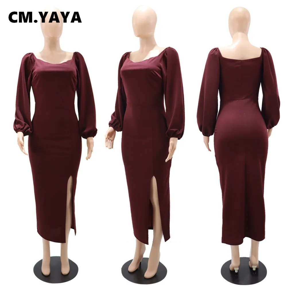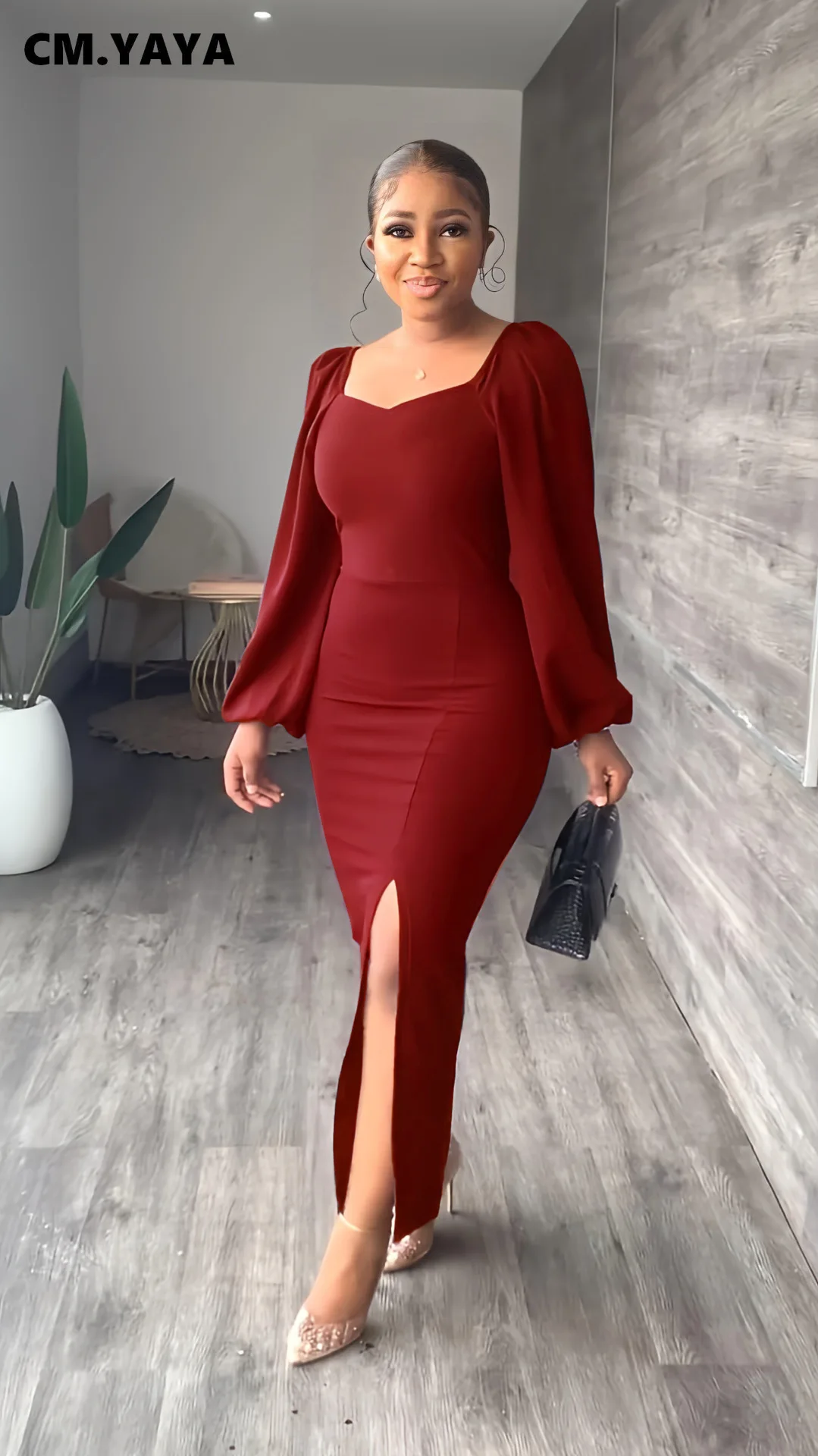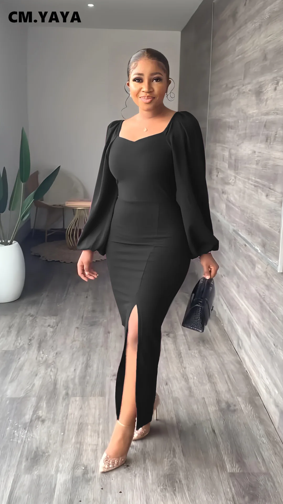 CM.YAYA Elegant Women Puff Long Sleeve Sweetheart Neck Side Split Bodycon Maxi Long Dress 2022 Club Sexy Party Dresses Vestidos