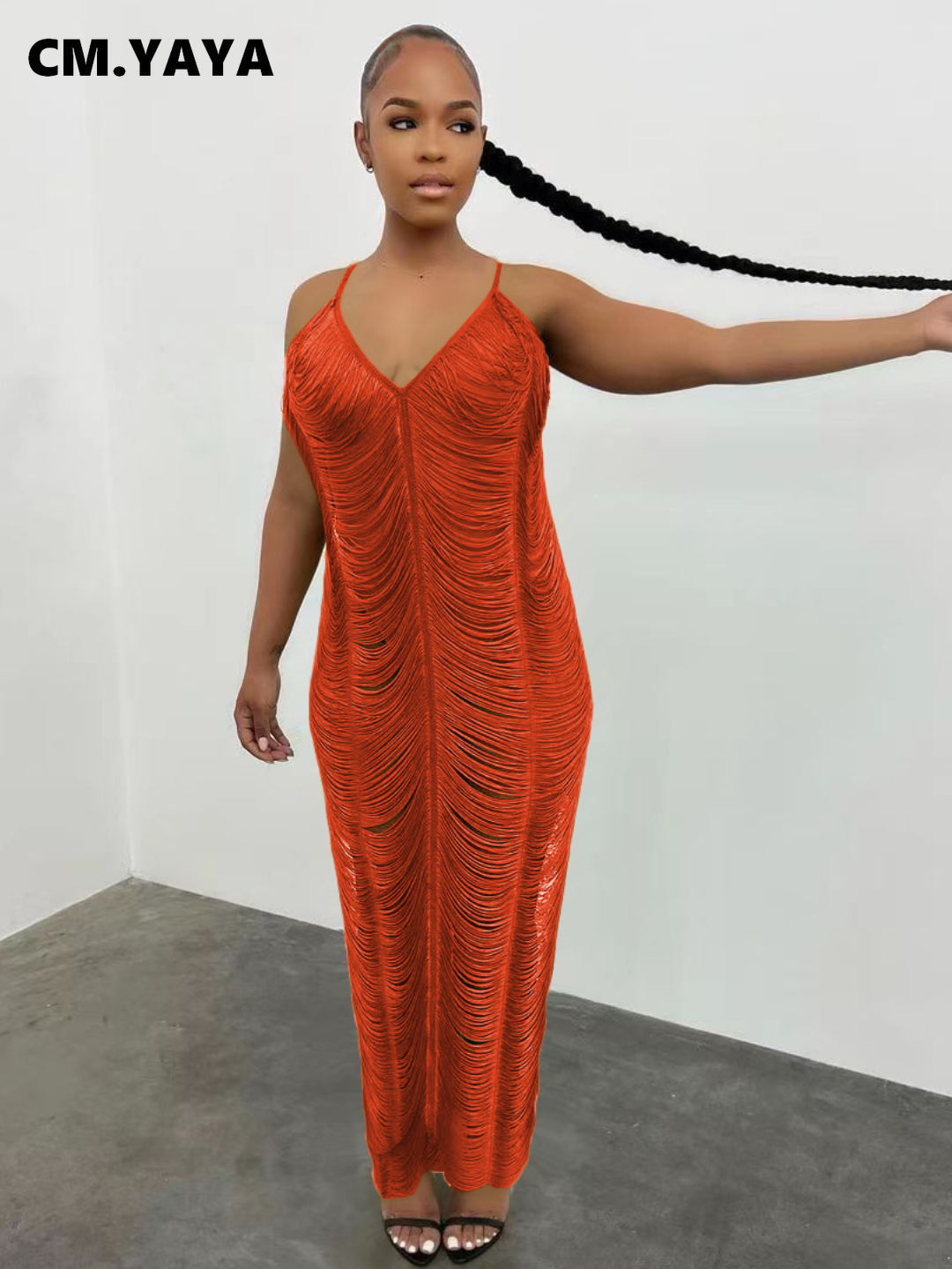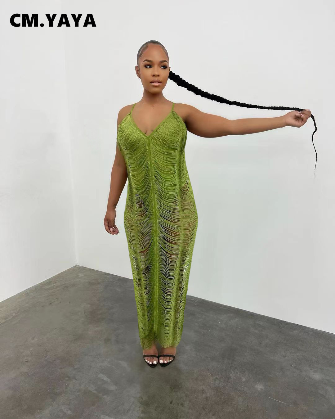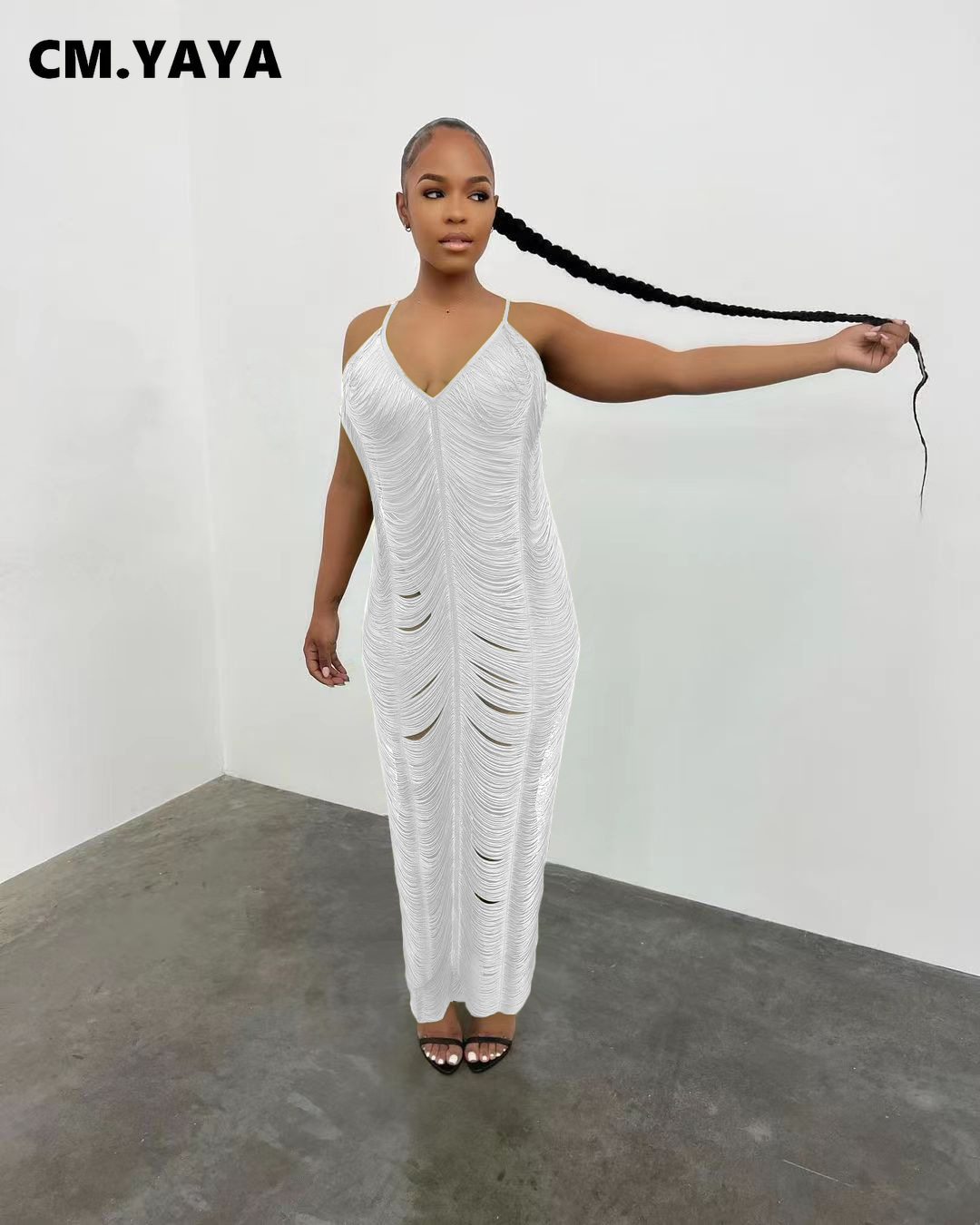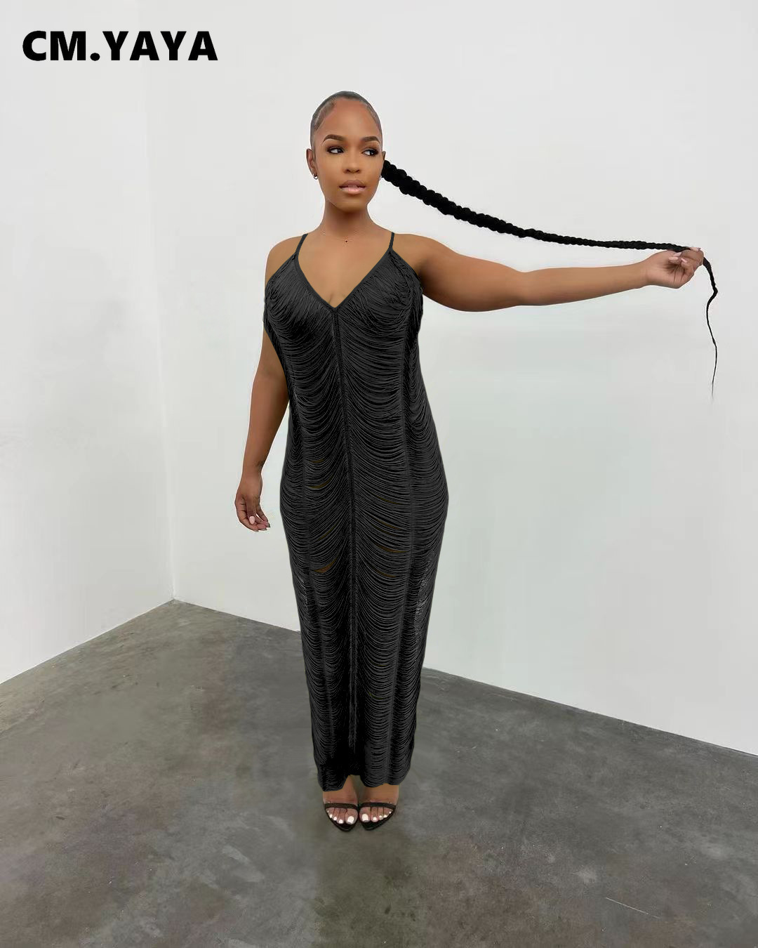 CM.YAYA Elegant Women Tassel Spaghetti Strap V-neck Knit Ribbed Maxi Long Dress 2022 Summer Beach Holiday Dresses Vestidos