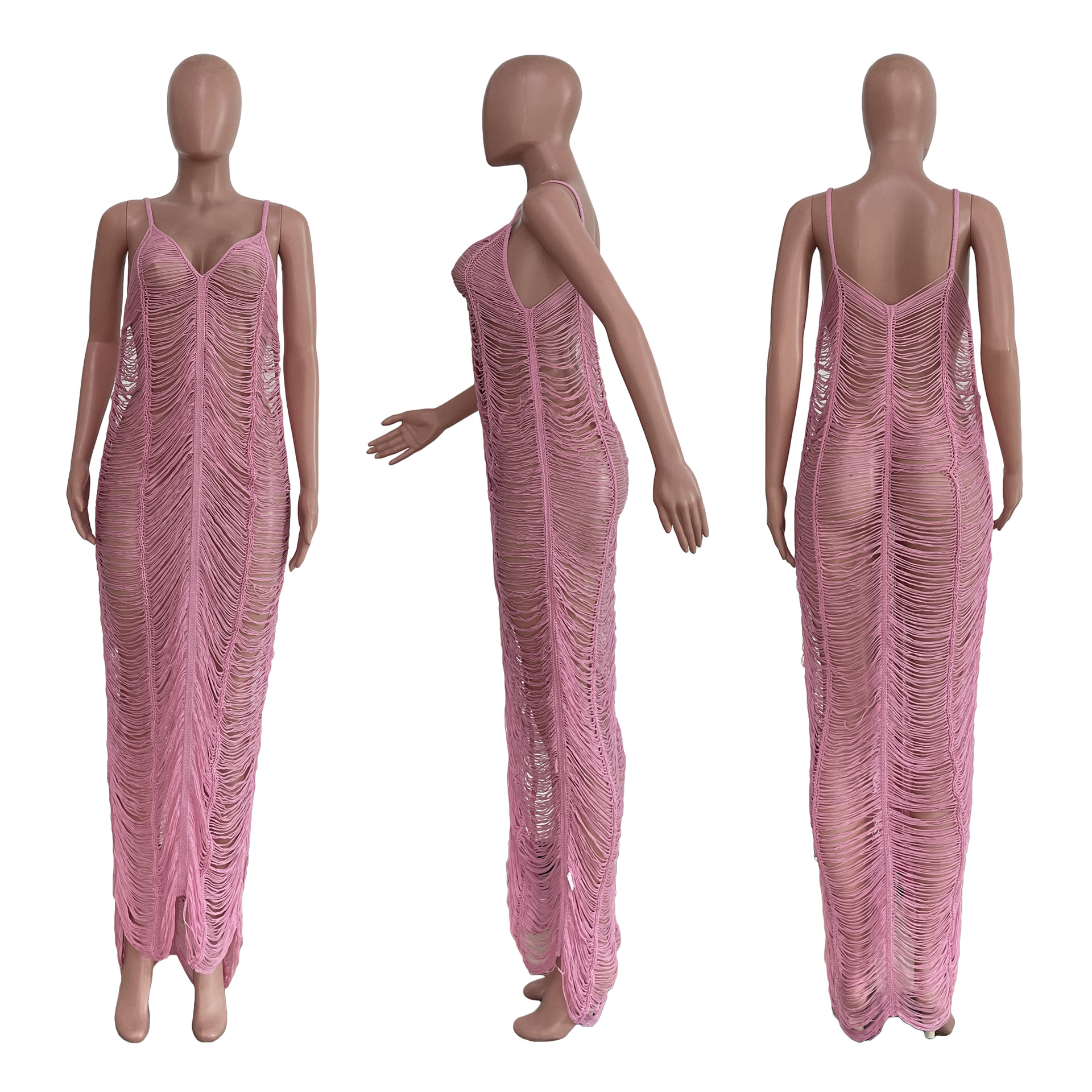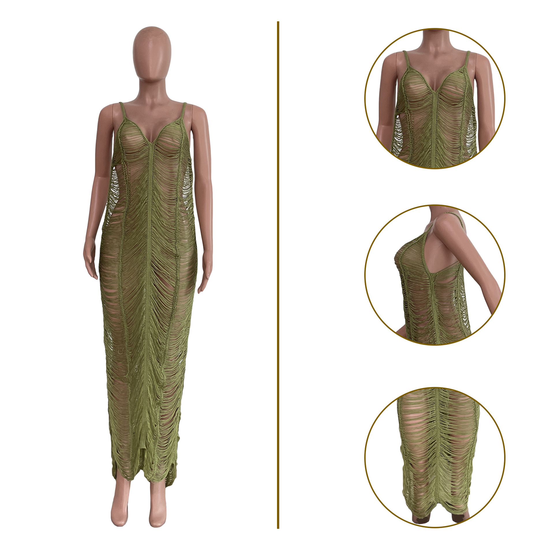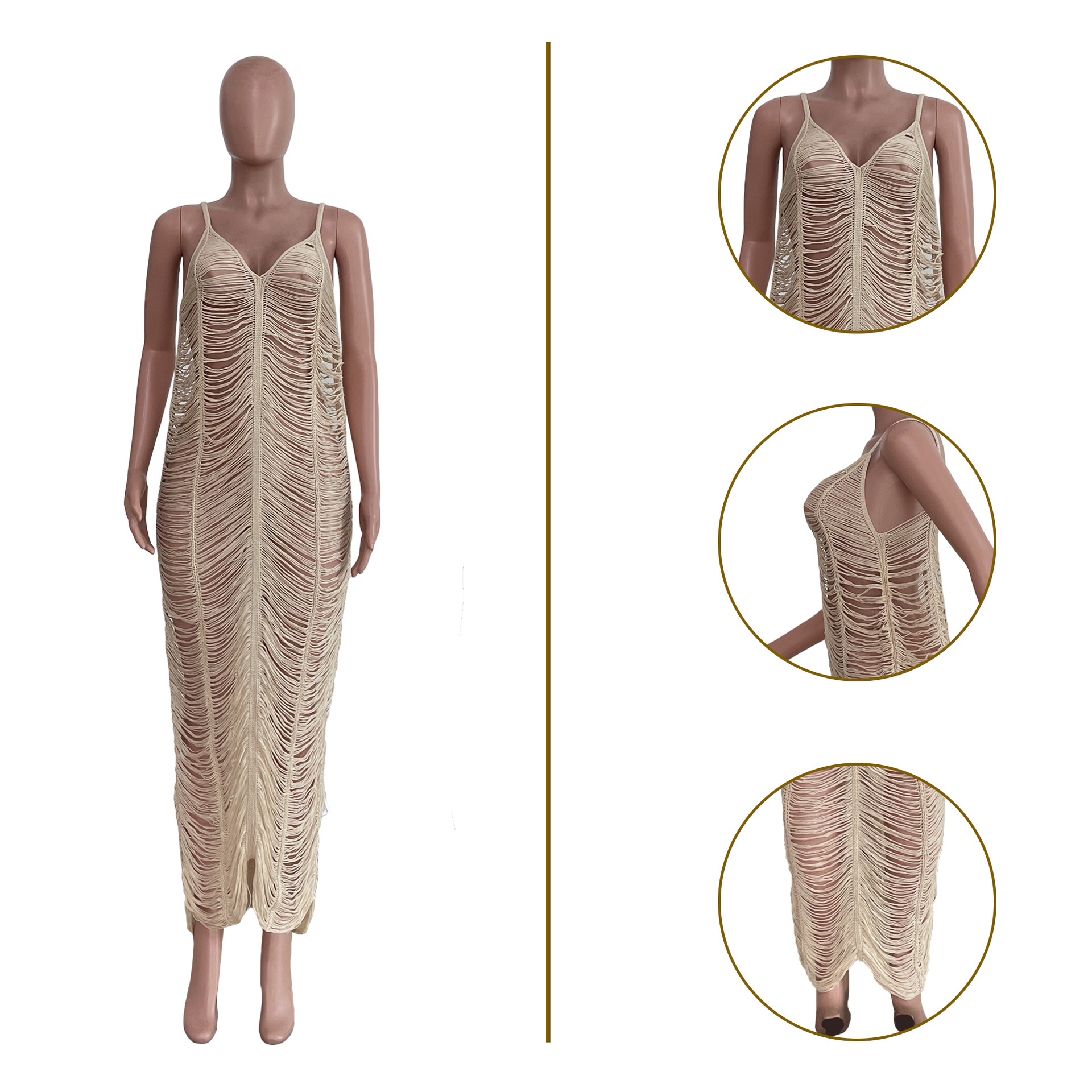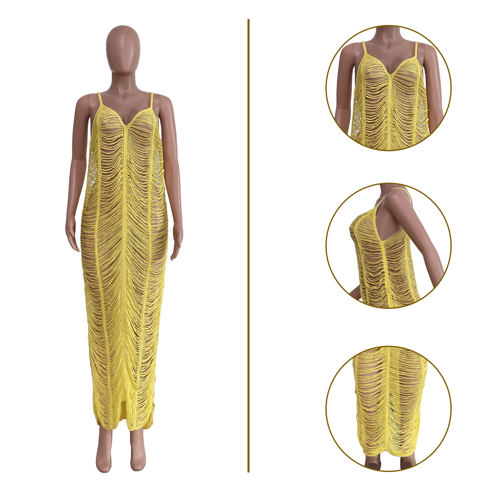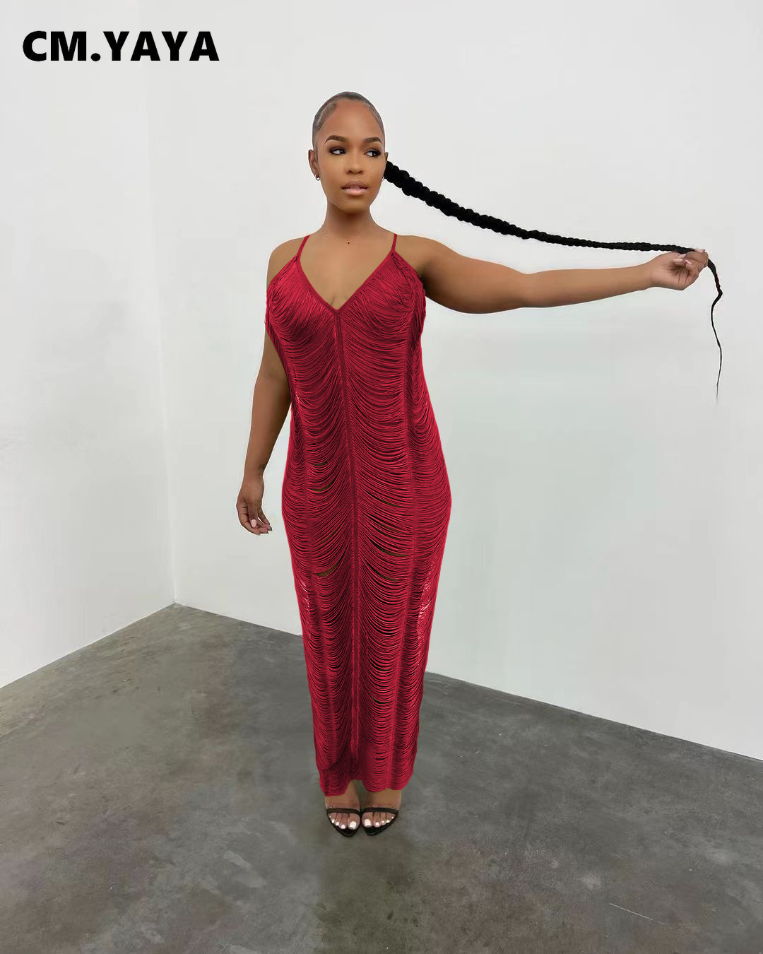 CM.YAYA Elegant Women Tassel Spaghetti Strap V-neck Knit Ribbed Maxi Long Dress 2022 Summer Beach Holiday Dresses Vestidos