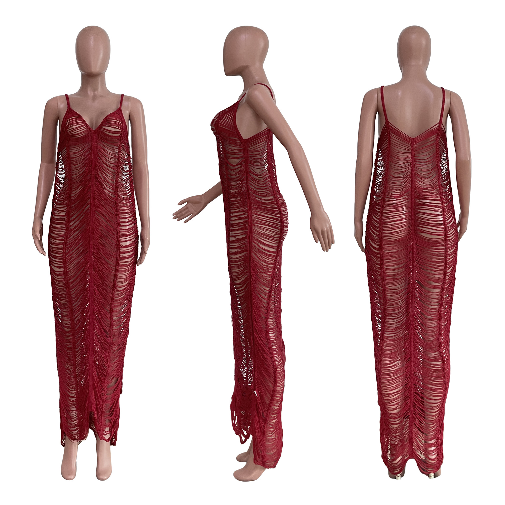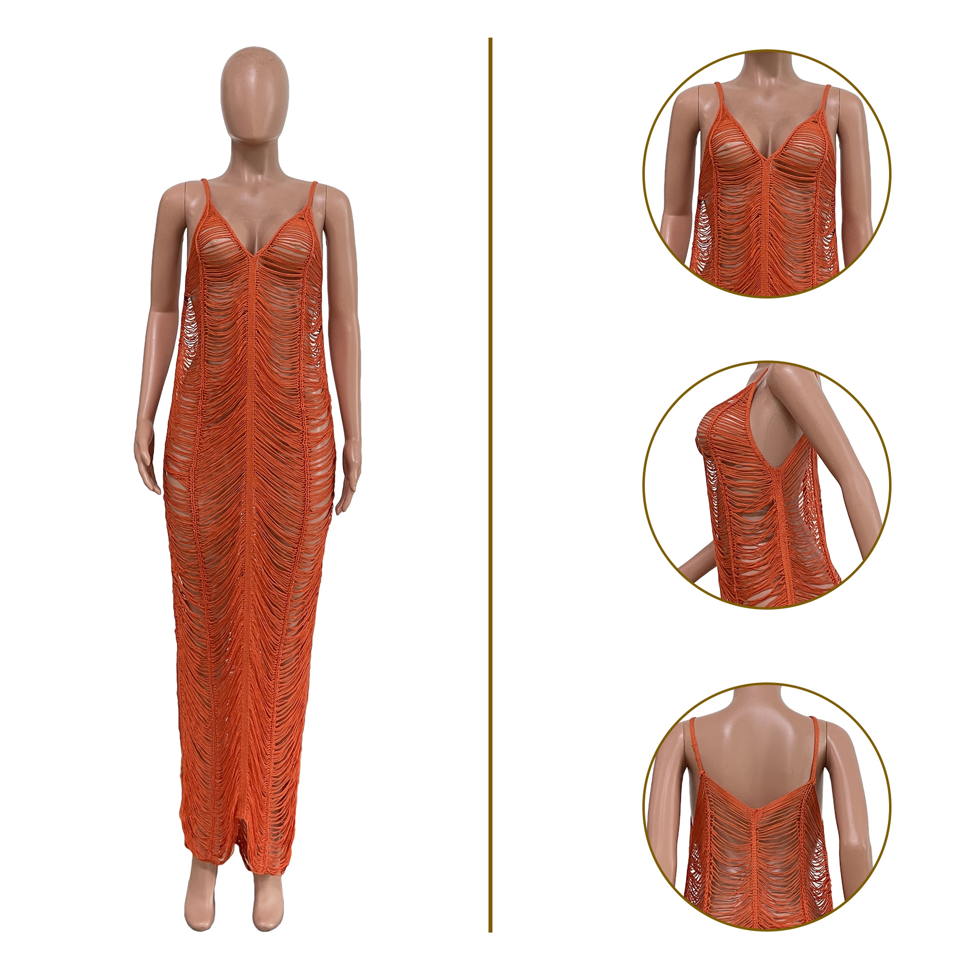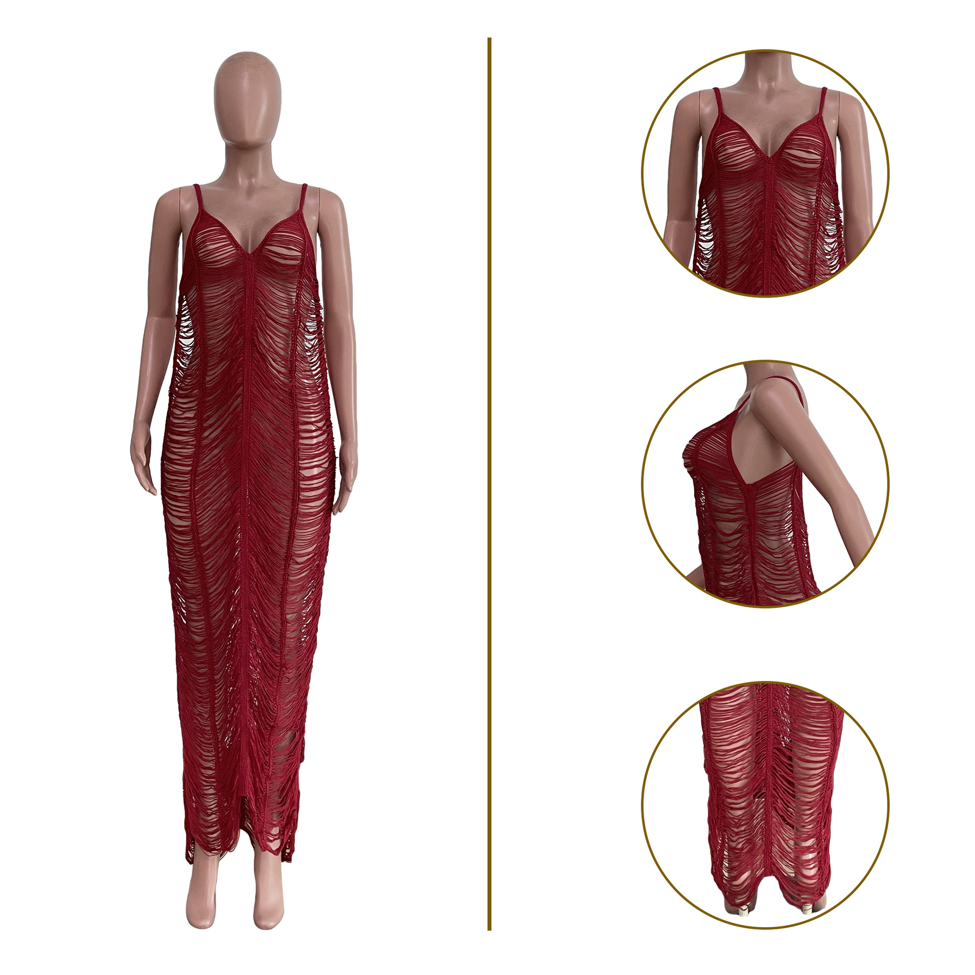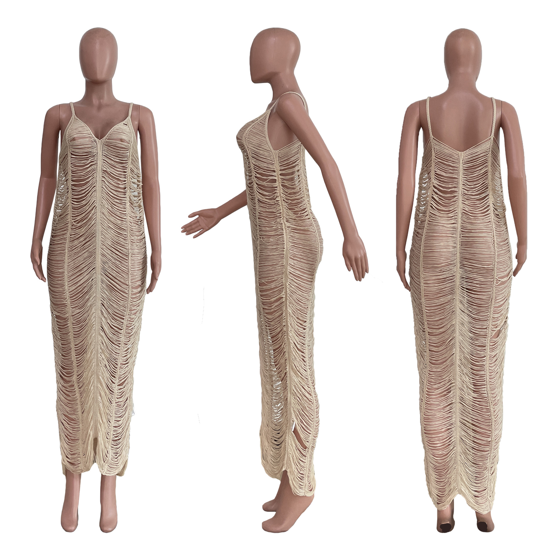 CM.YAYA Elegant Women Tassel Spaghetti Strap V-neck Knit Ribbed Maxi Long Dress 2022 Summer Beach Holiday Dresses Vestidos