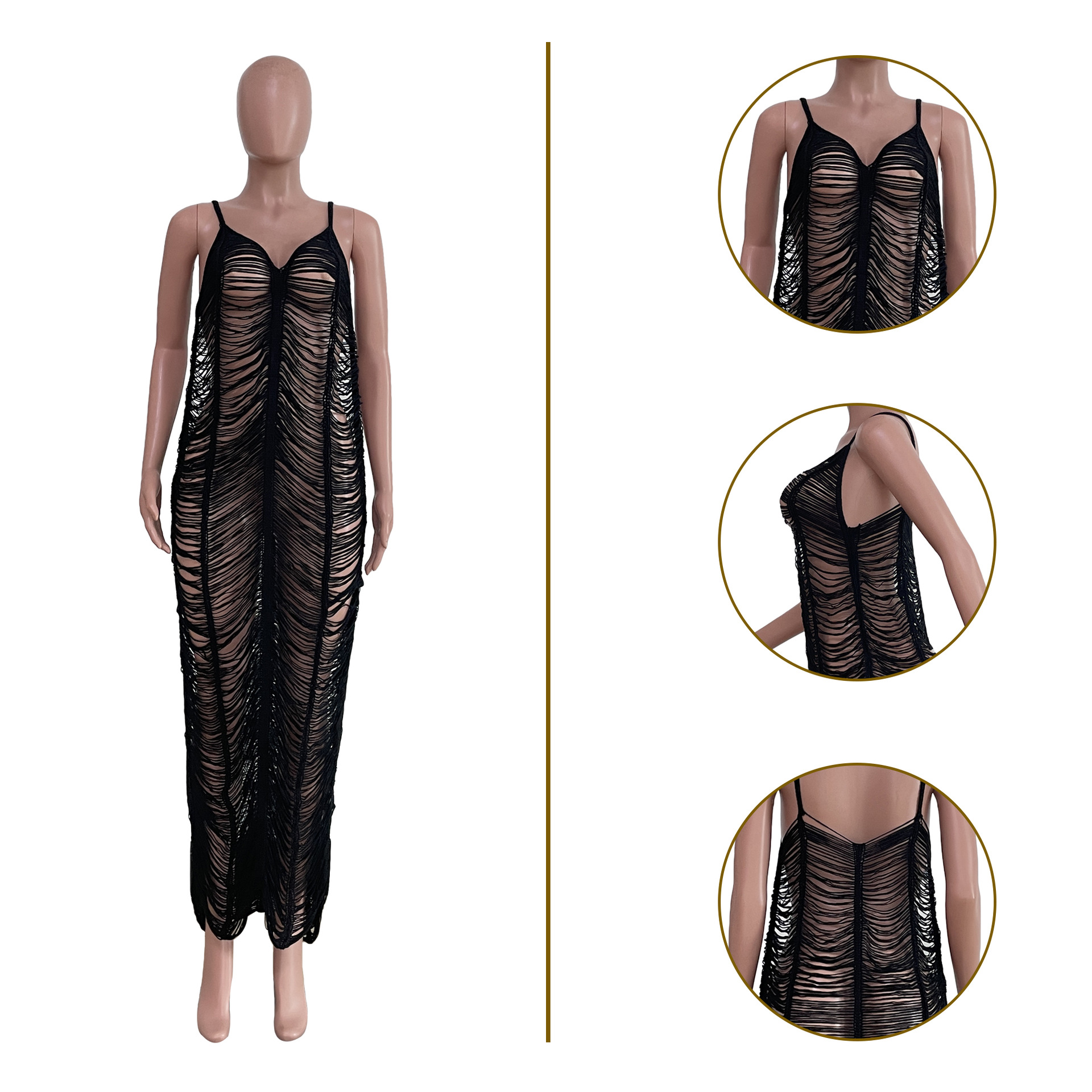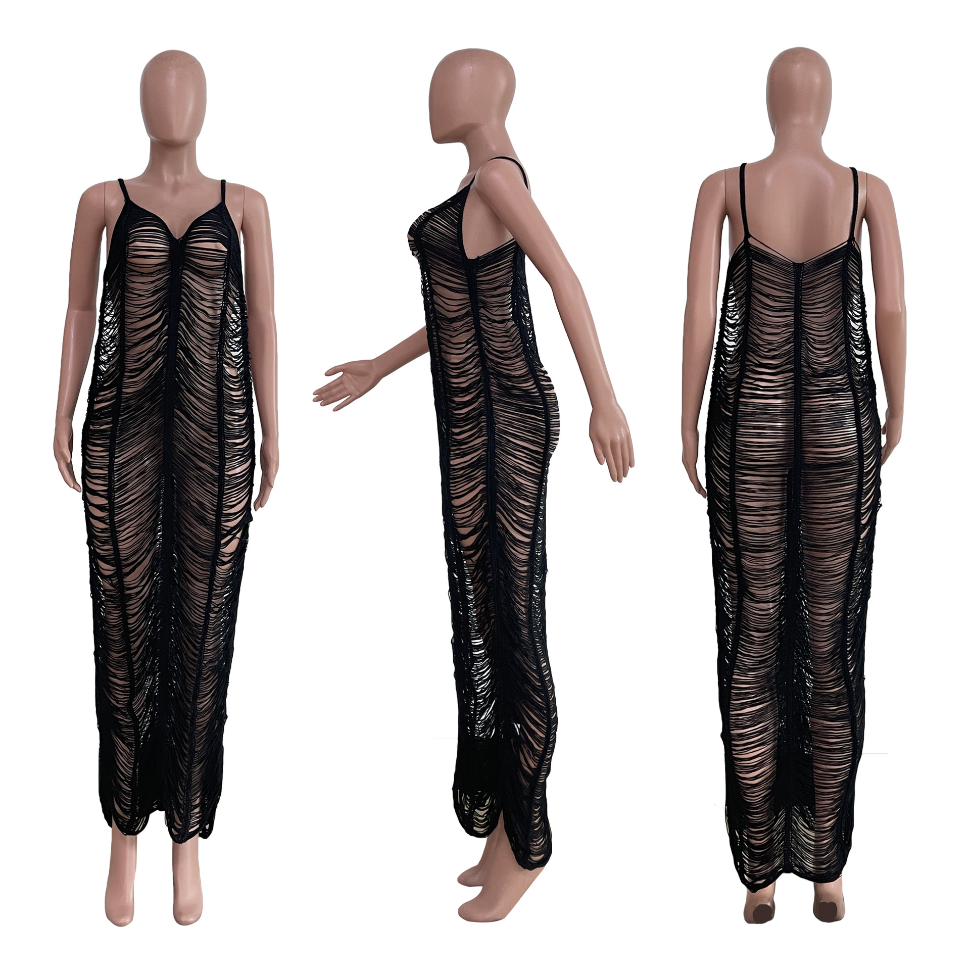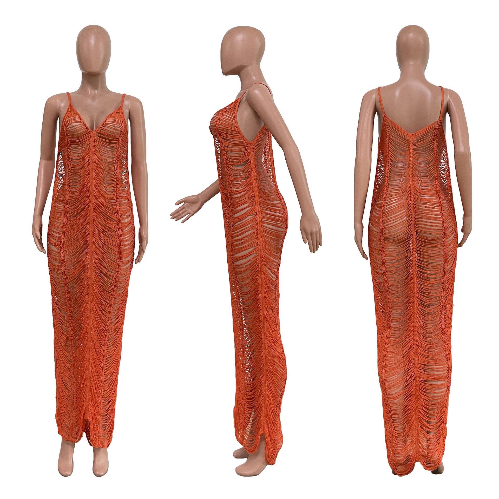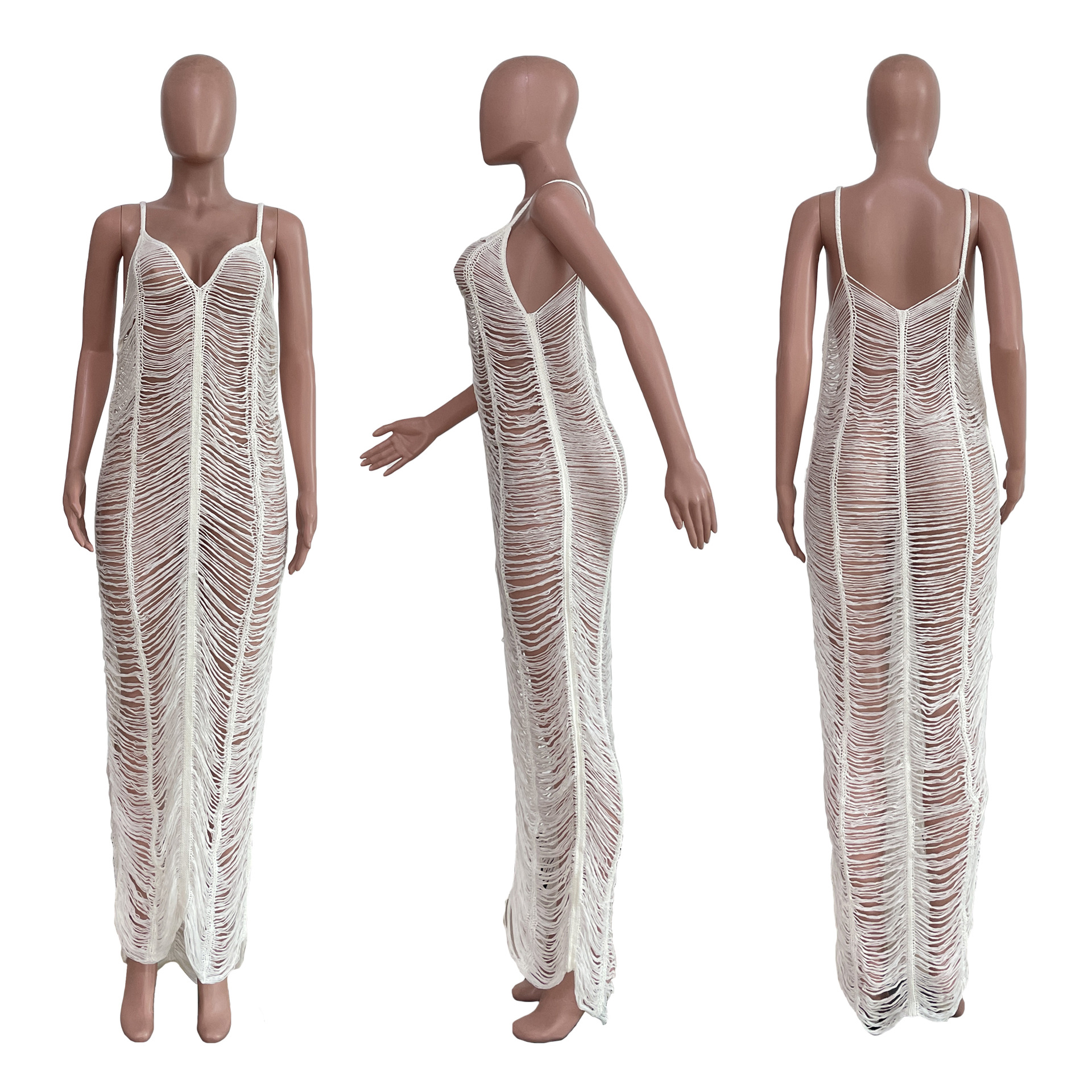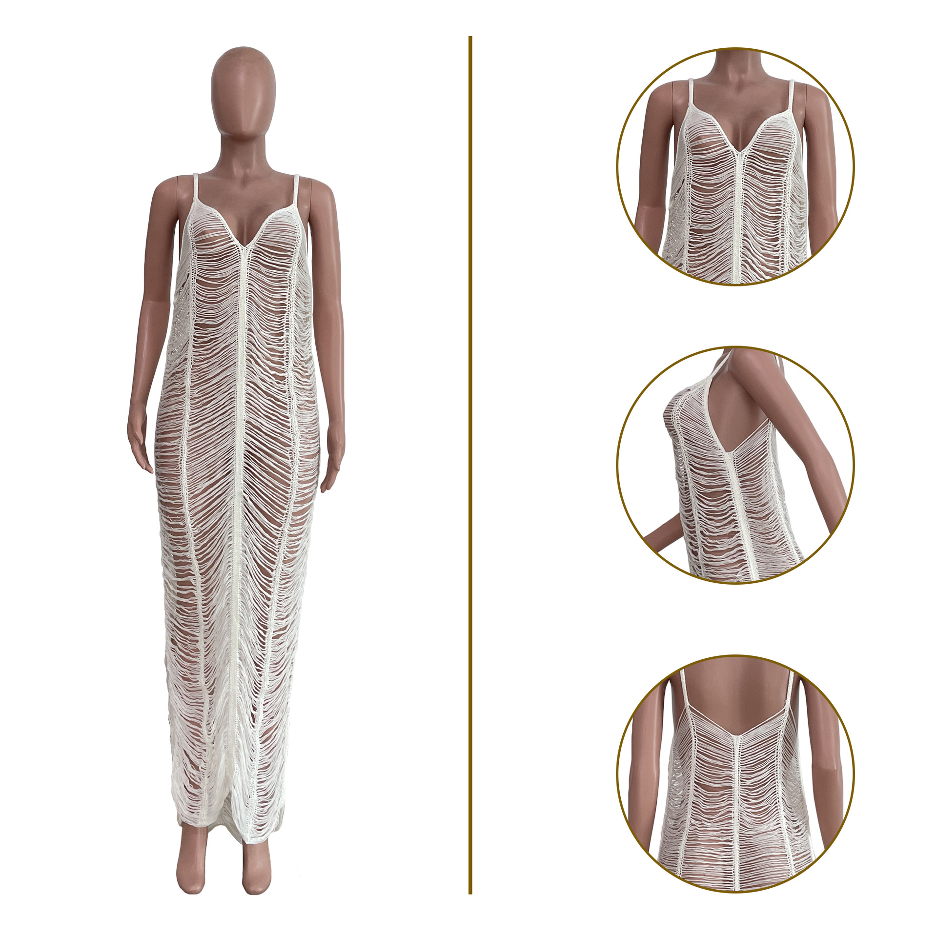 CM.YAYA Elegant Women Tassel Spaghetti Strap V-neck Knit Ribbed Maxi Long Dress 2022 Summer Beach Holiday Dresses Vestidos