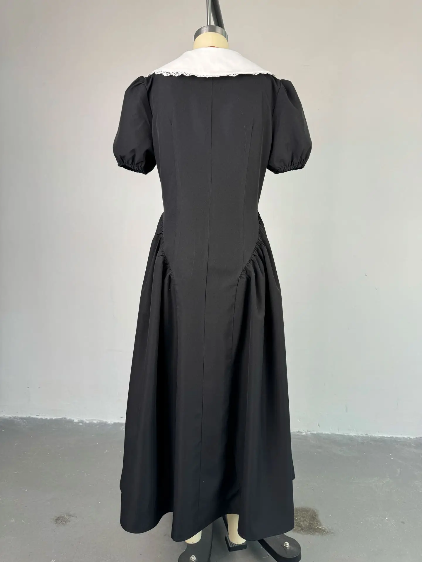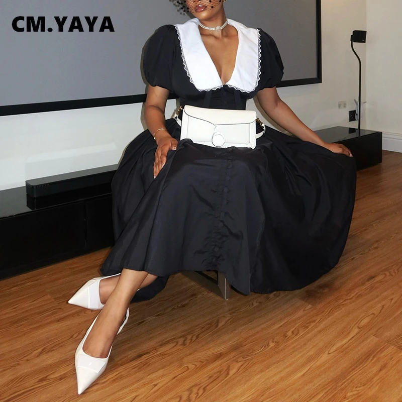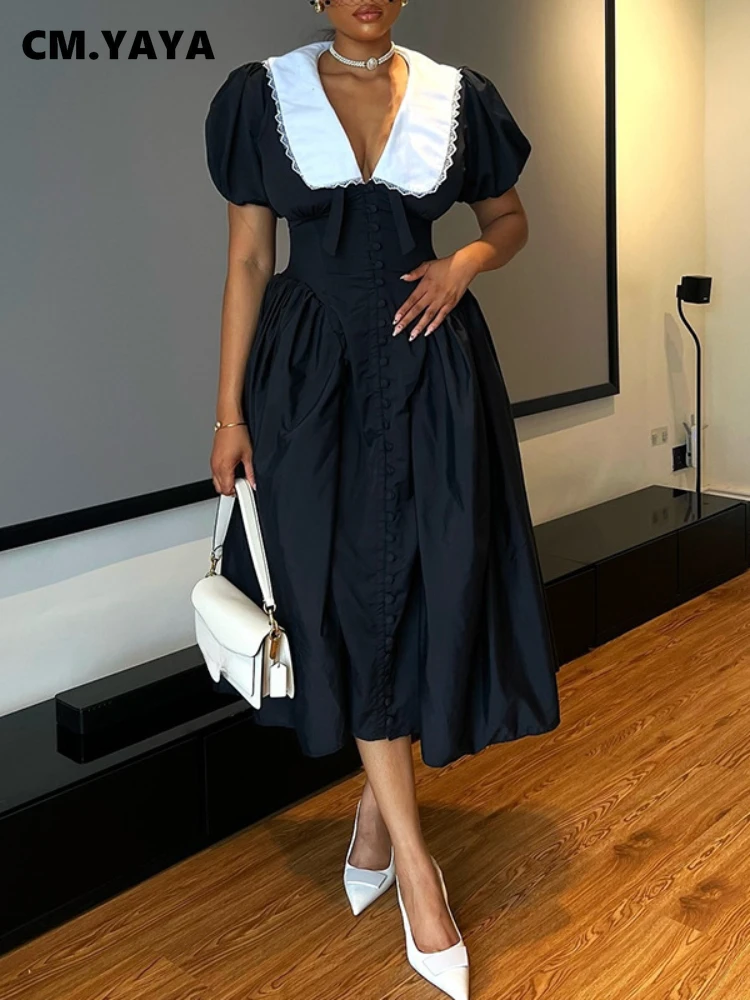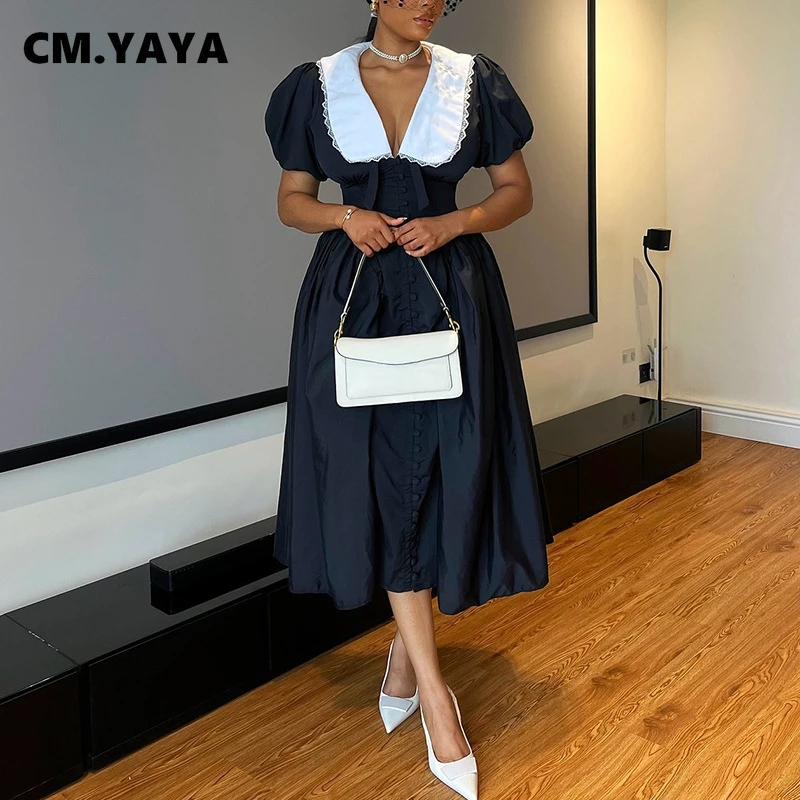 CM.YAYA Fall Women Summer Peter Pan Collar Short Sleeve Elegant Midi Dress V-neck Vintage Sexy Night Club Party Dresses Vestidos