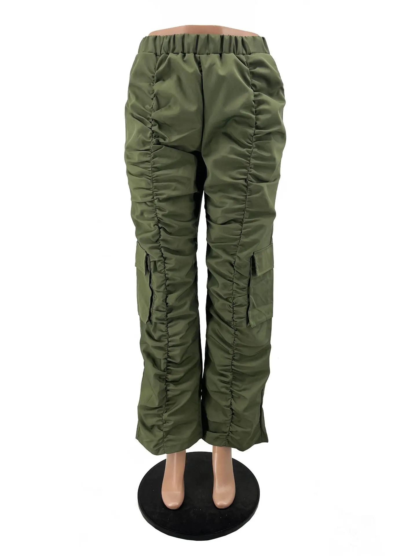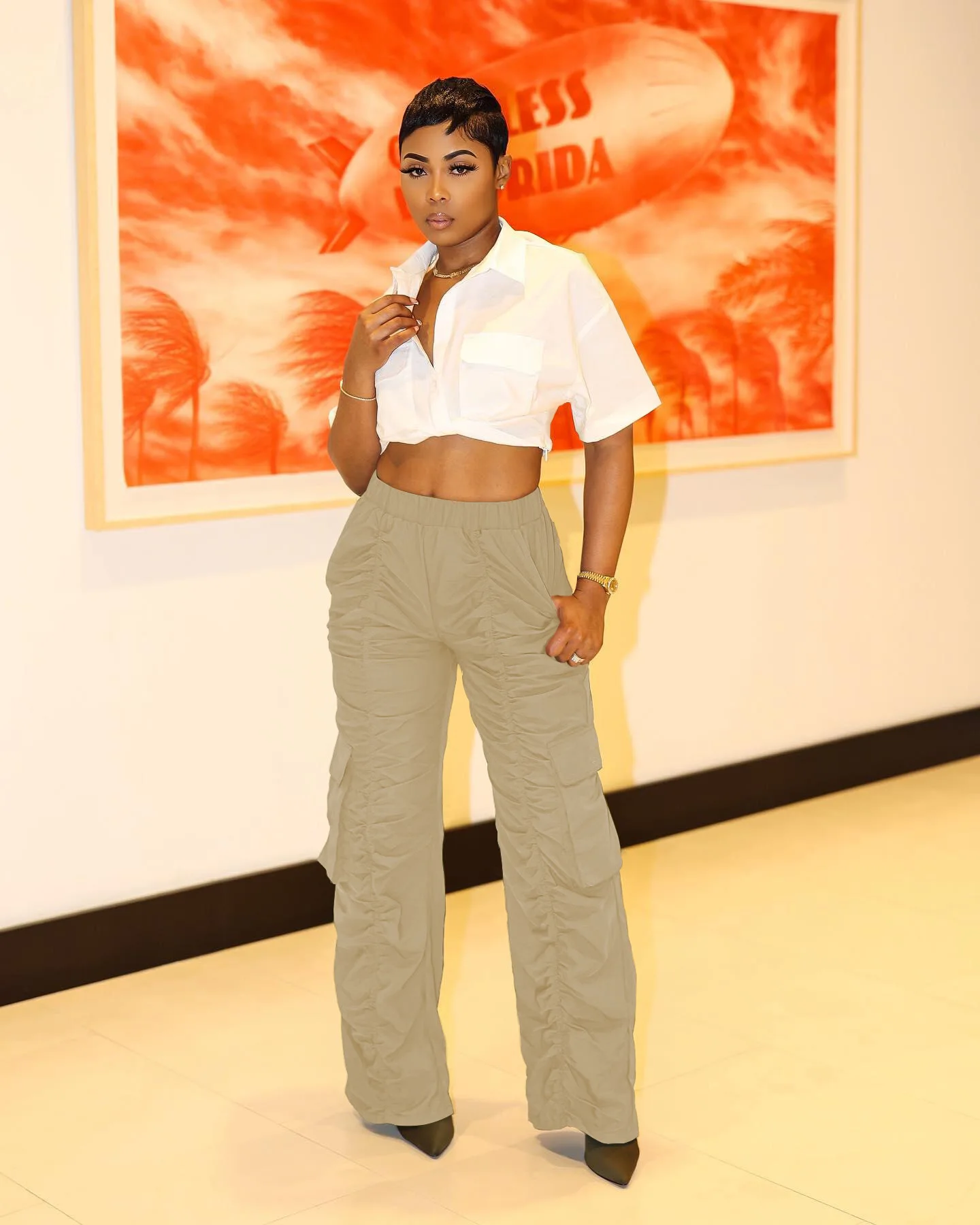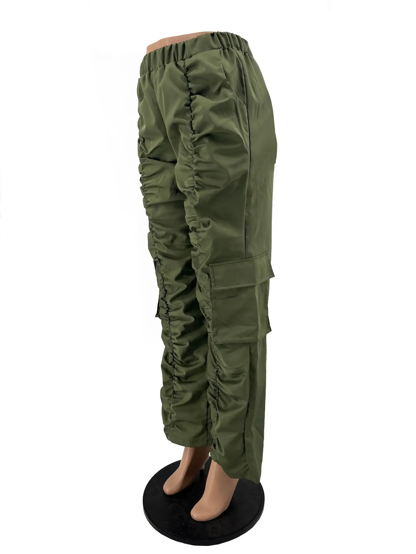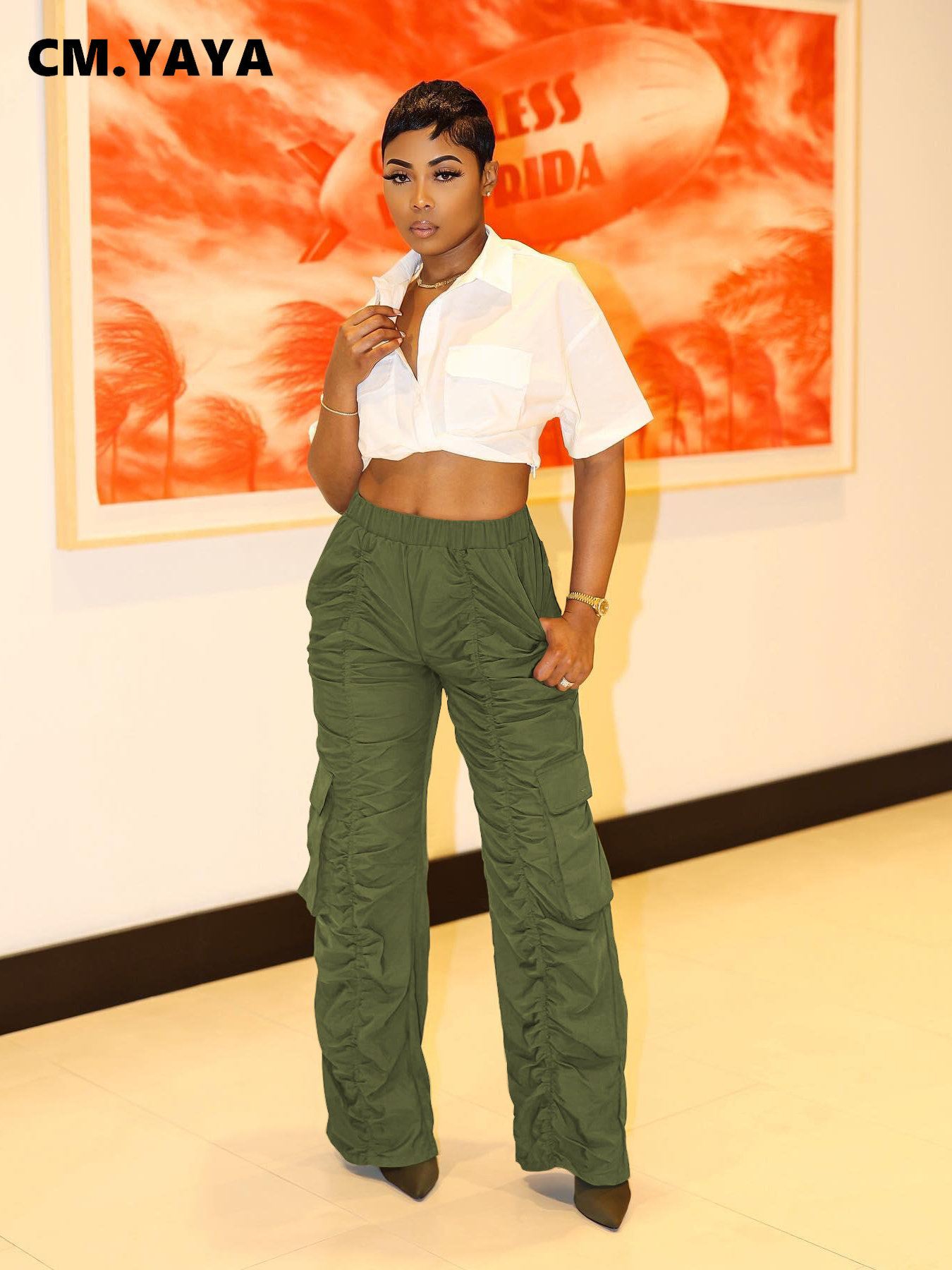 CM.YAYA Fashion Women 2023 Spring Summer Ruched Stacked Pocket Side Elastic Waist Straight Cargo Pants Streetear INS Trousers