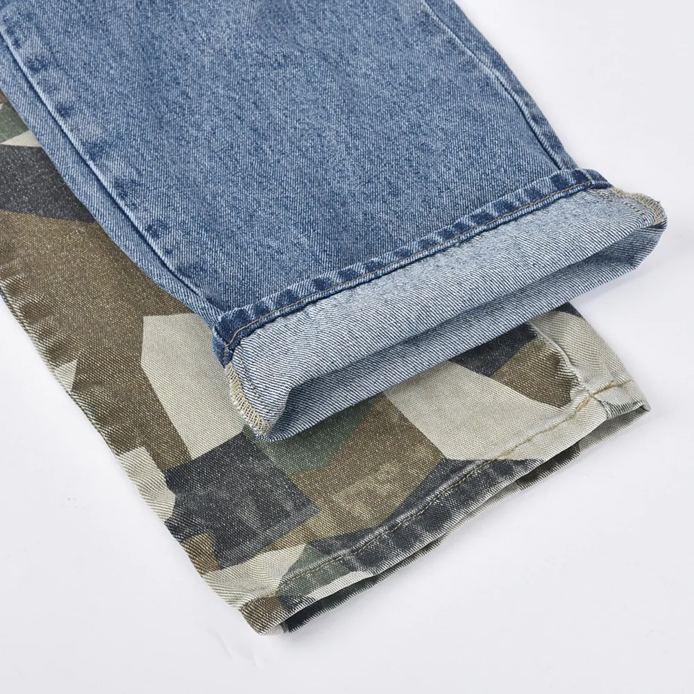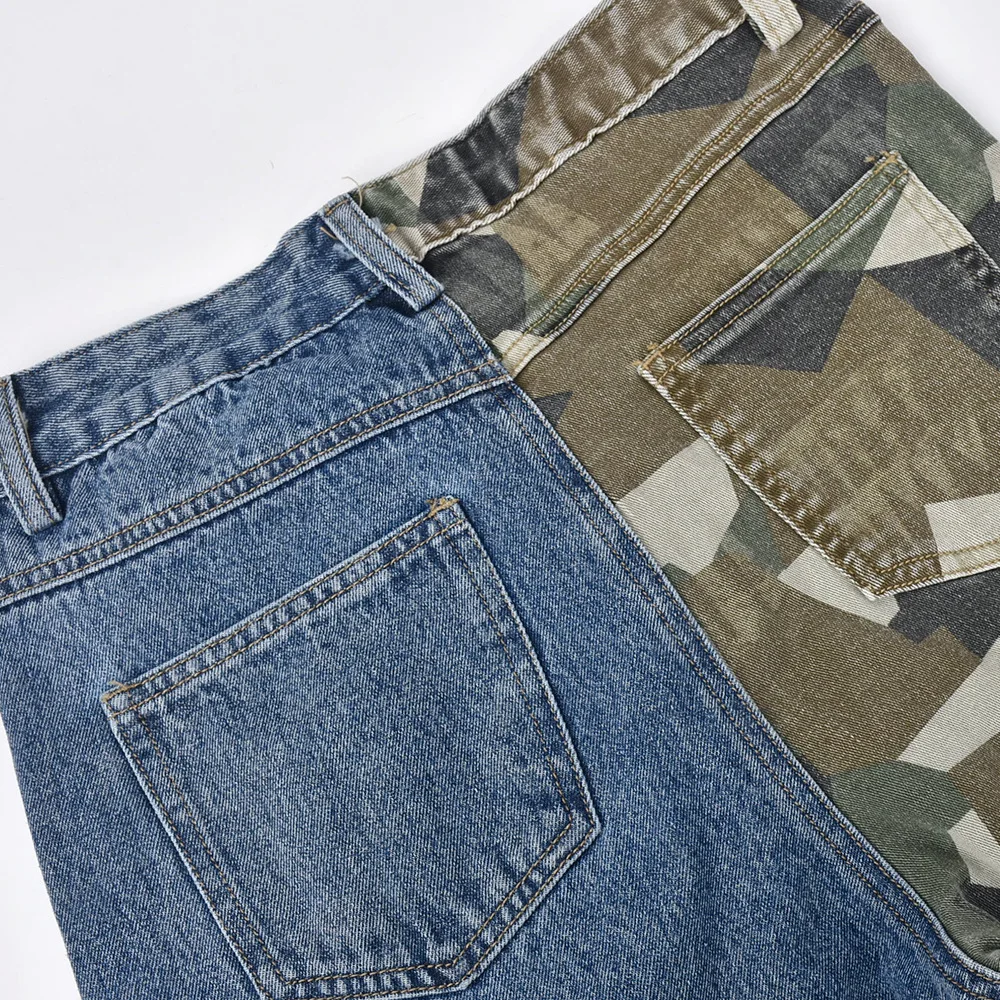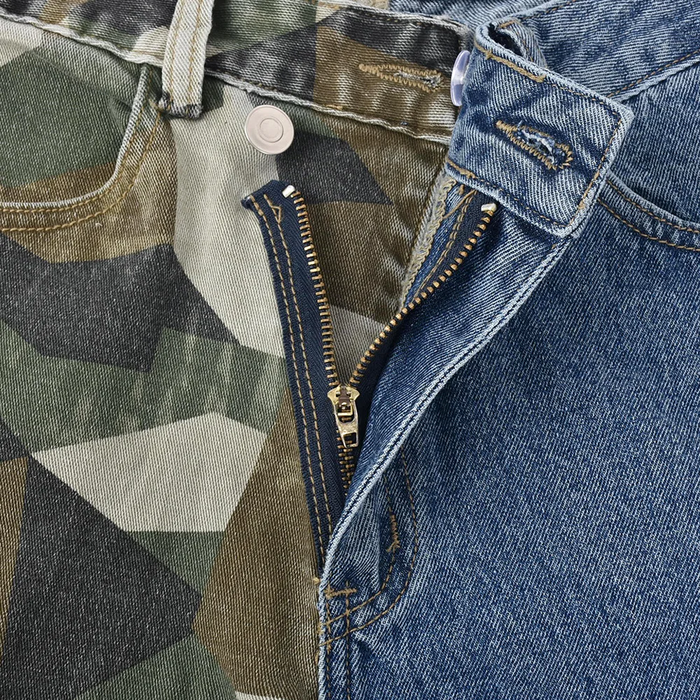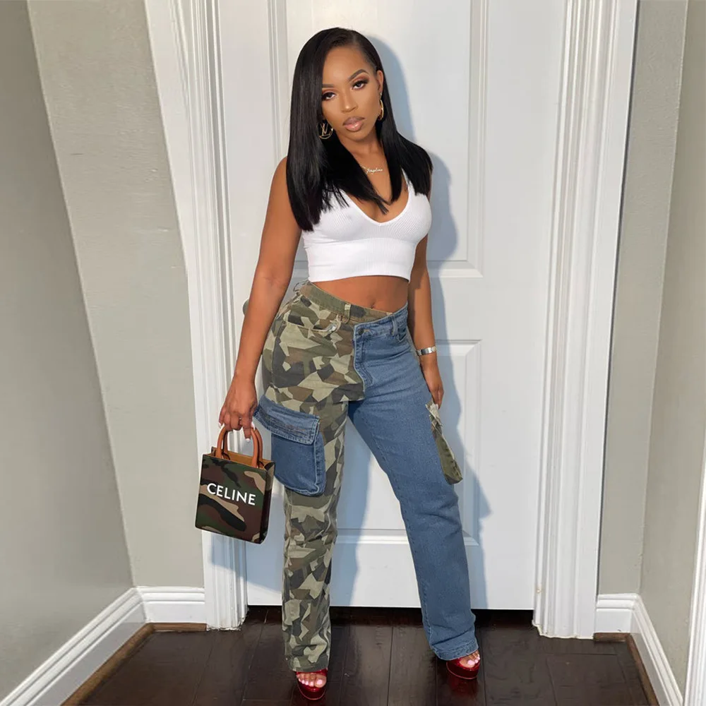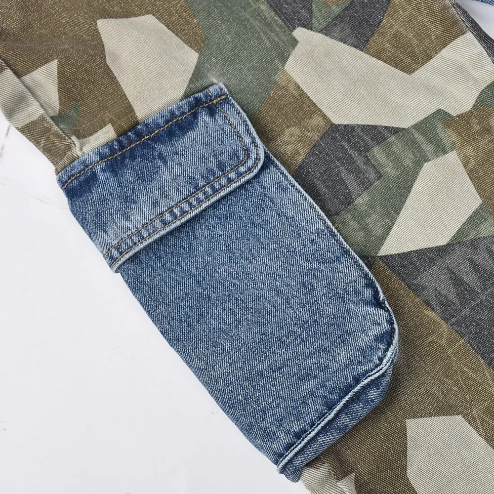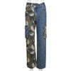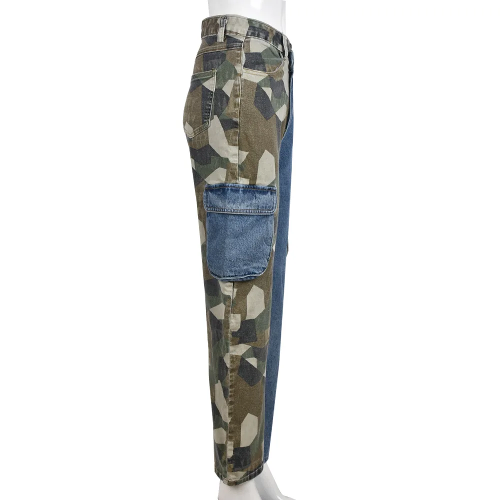 CM.YAYA Fashion Women Camouflage Denim Patchwork Oblique Zipper Fly Pocket Side Safari Straight Jeans INS Street Trouser Pants
