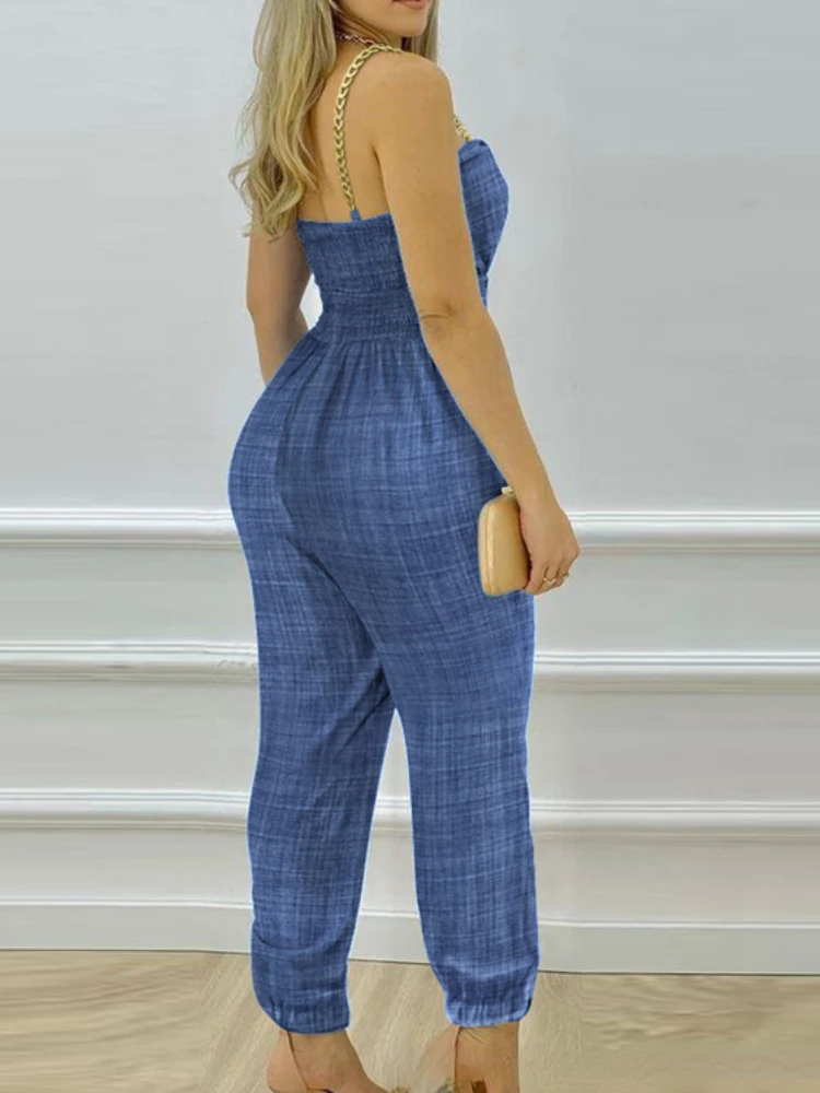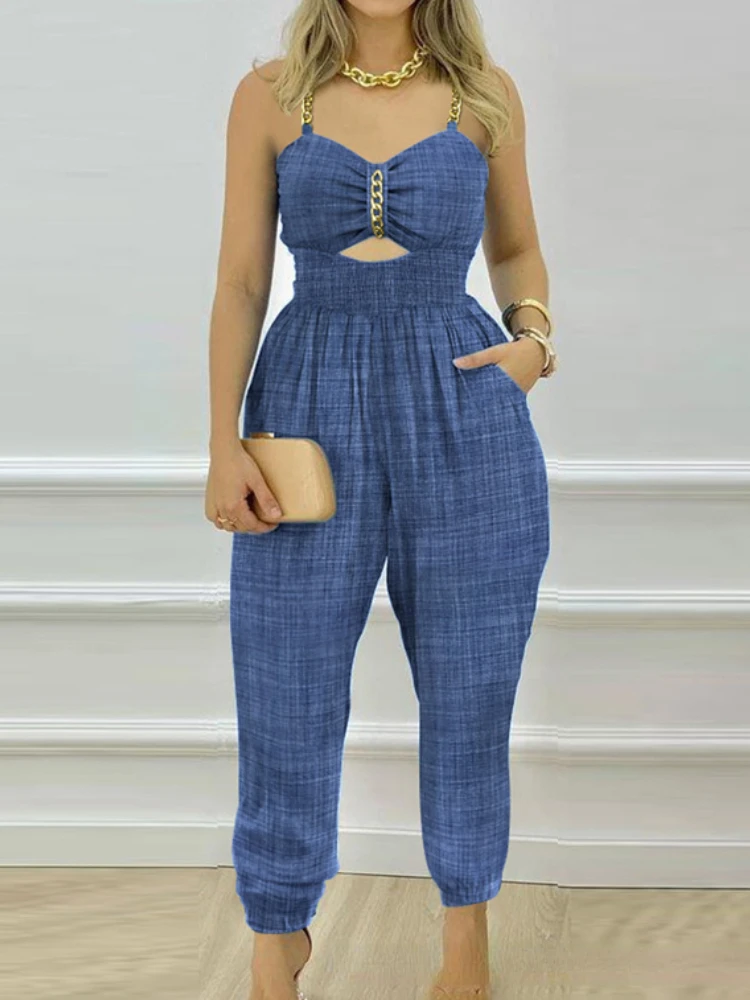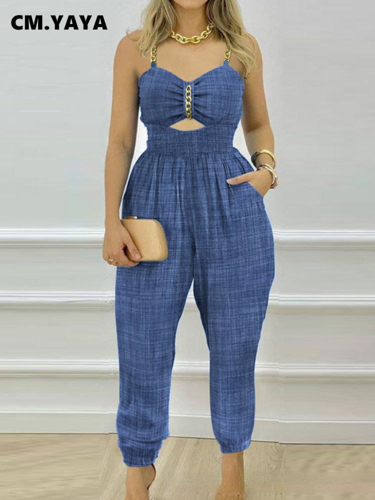 CM.YAYA Fashion Women Chain Strap Sleeveless V-neck Cutout Jumpsuit 2023 Summer Vintage Streetwear Romper One Piece Set Playsuit