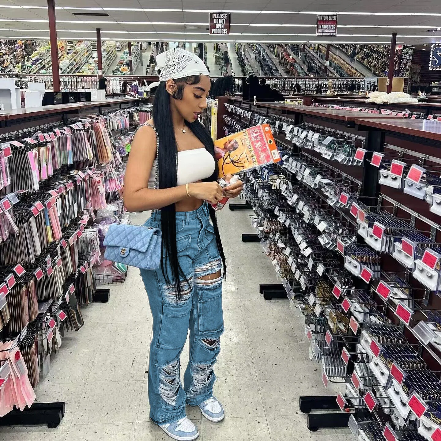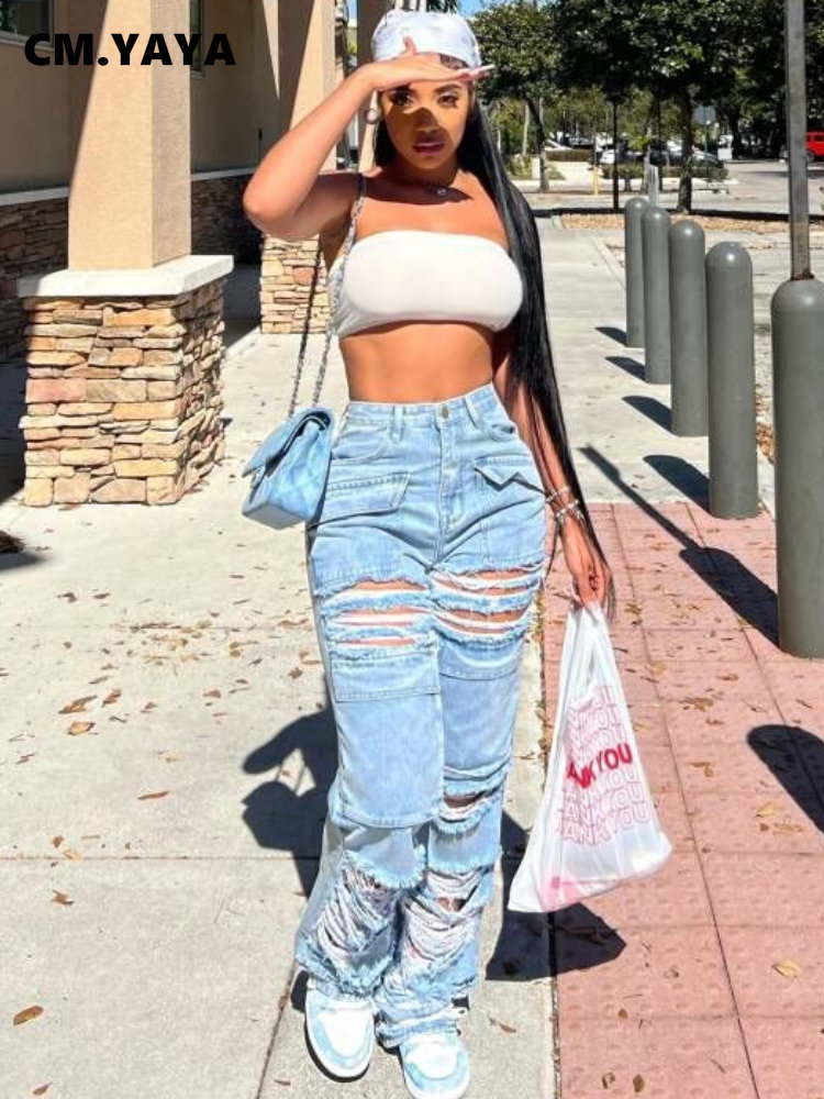 CM.YAYA Fashion Women Dripped Hollow Out Pocket Front Zipper Fly Straight Jeans Pants 2023 Steet Safari Style Denim Trousers