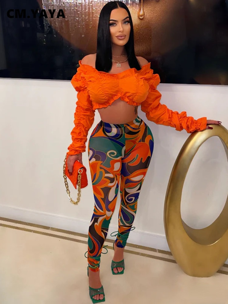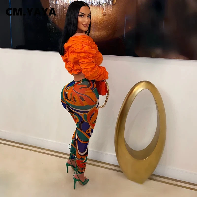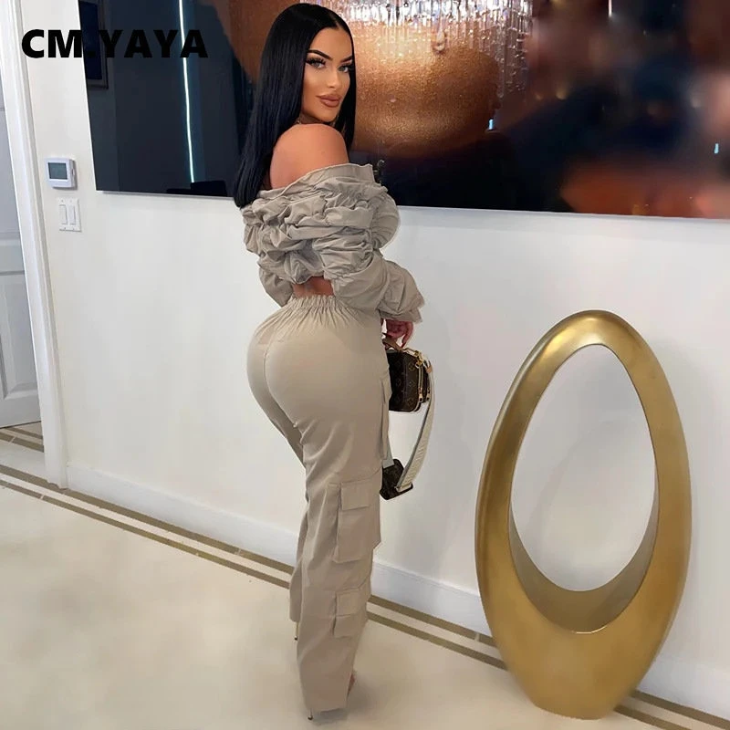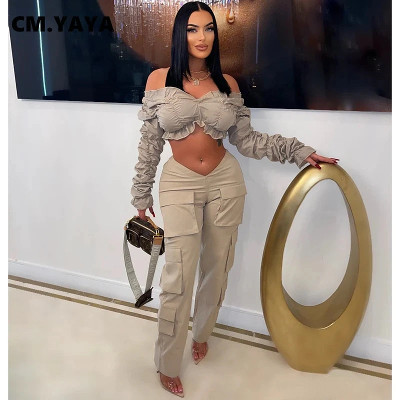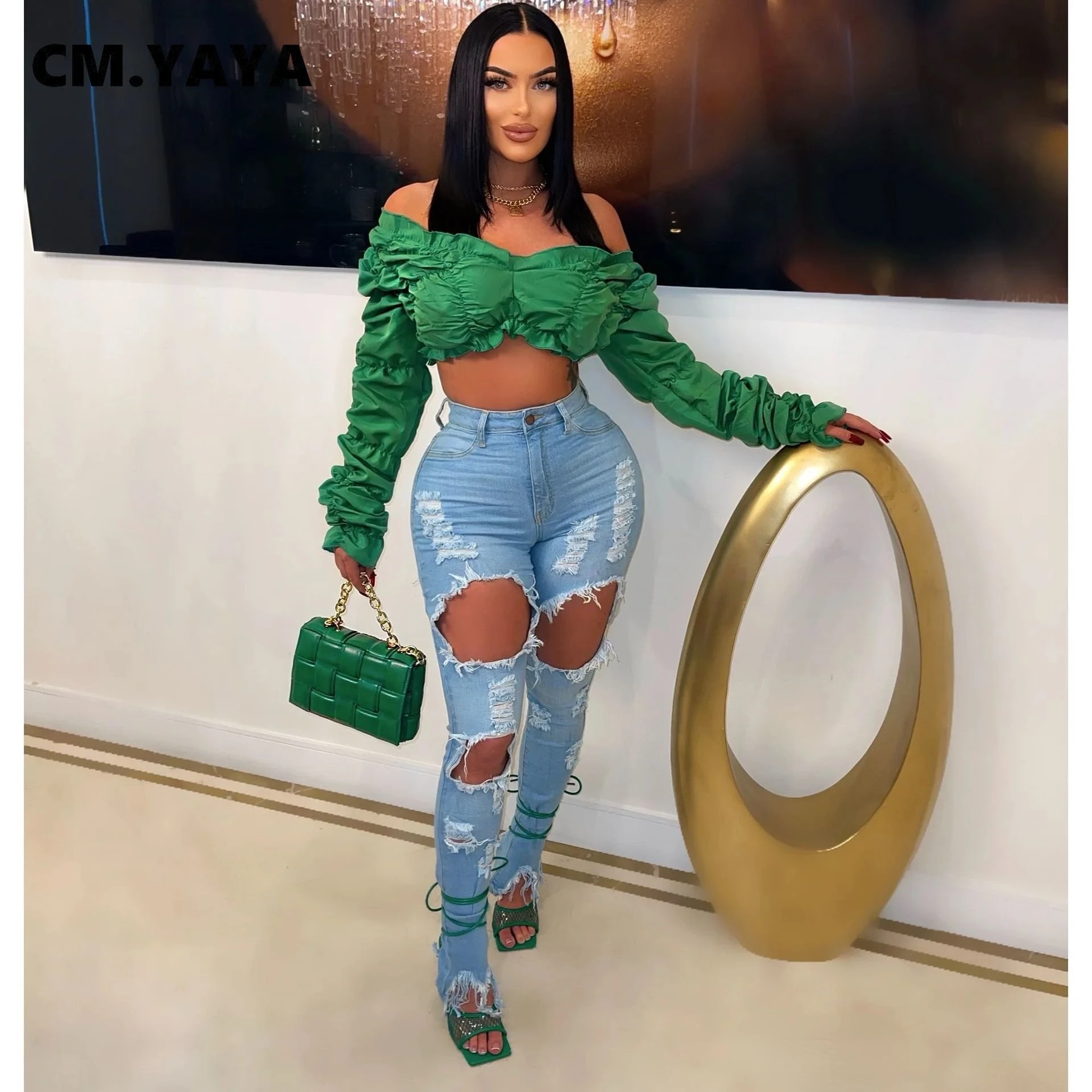 CM.YAYA Fashion Women Edible Tree Fungus Ruffles Off Shoulder Lantern Long Sleeve Crop Mini Blouse and Shirt Top 2023 Summer