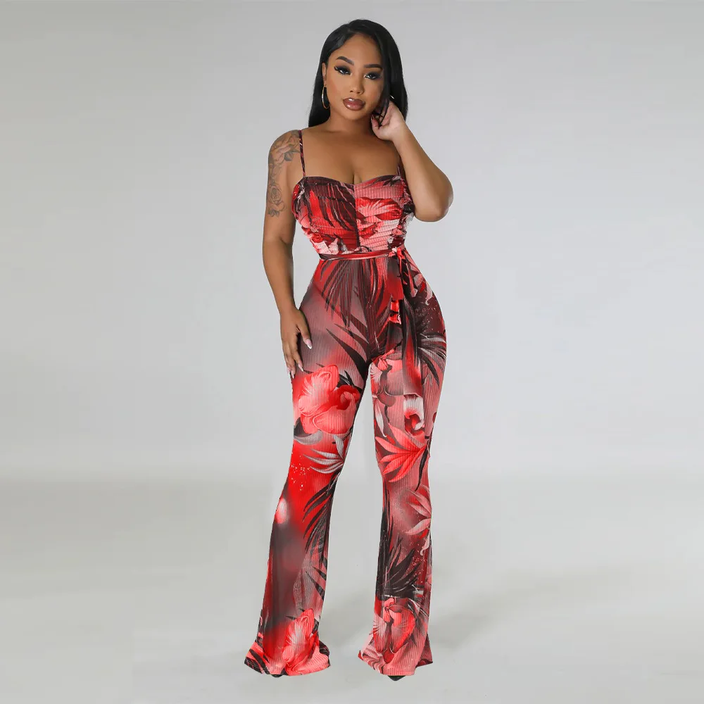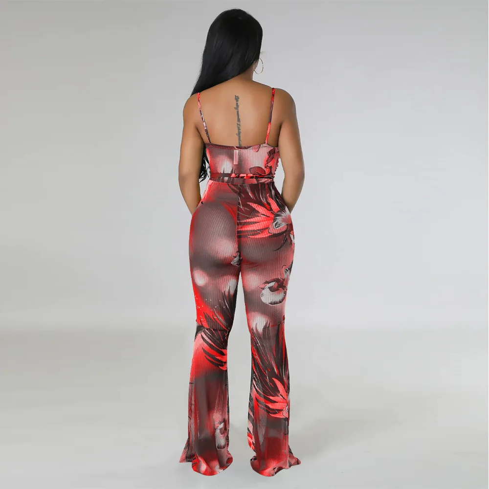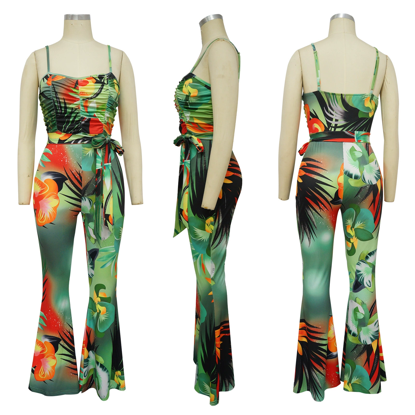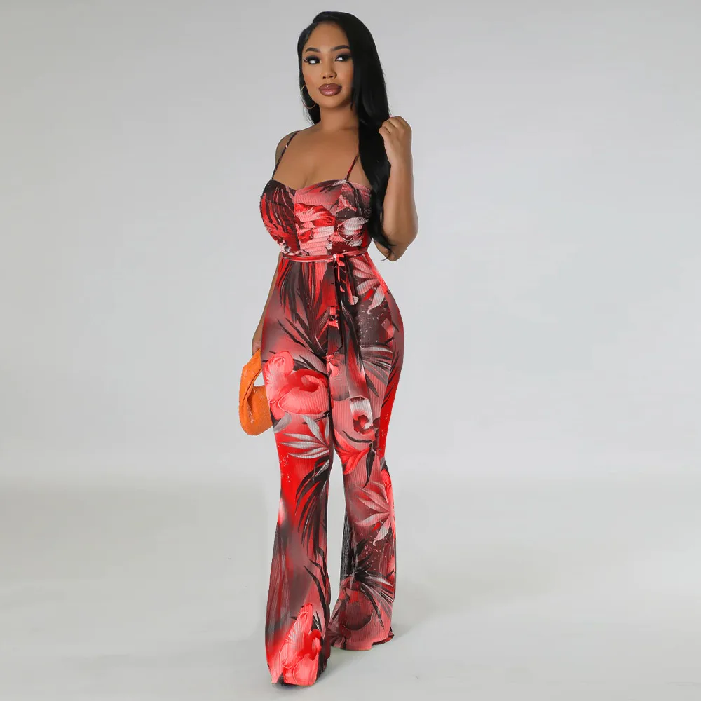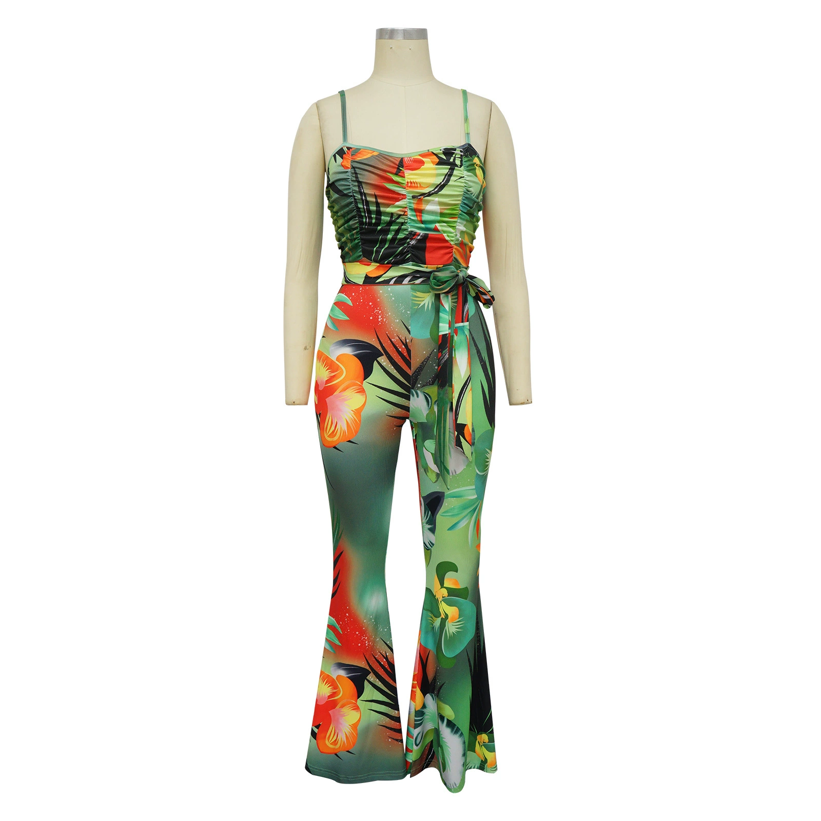 CM.YAYA Fashion Women Floral Printed Wide Leg Pleated Jumpsuit 2023 INS High Waist Spaghetti Strap Flare One Piece Set Playsuit