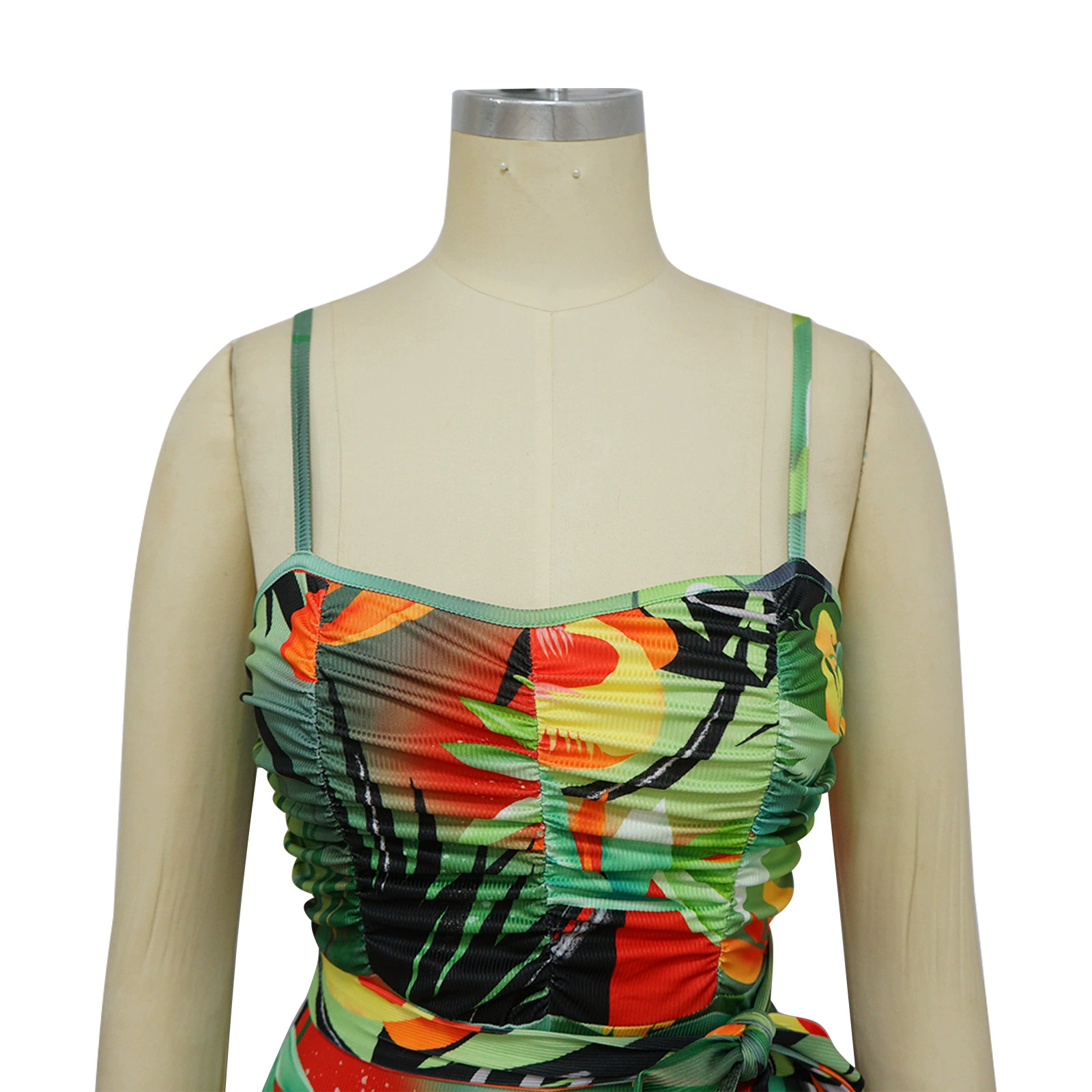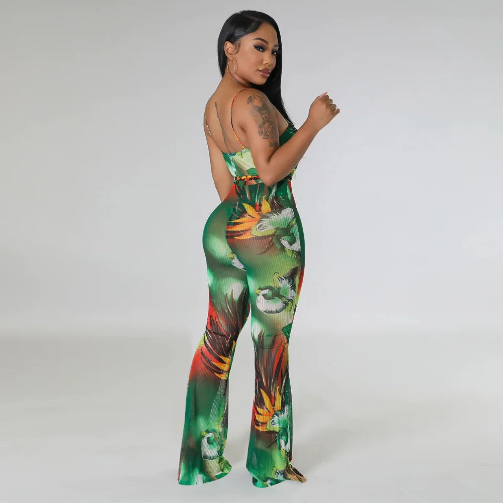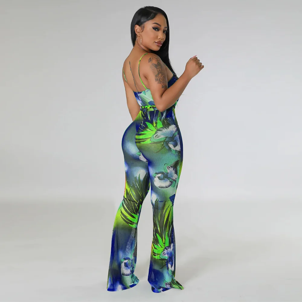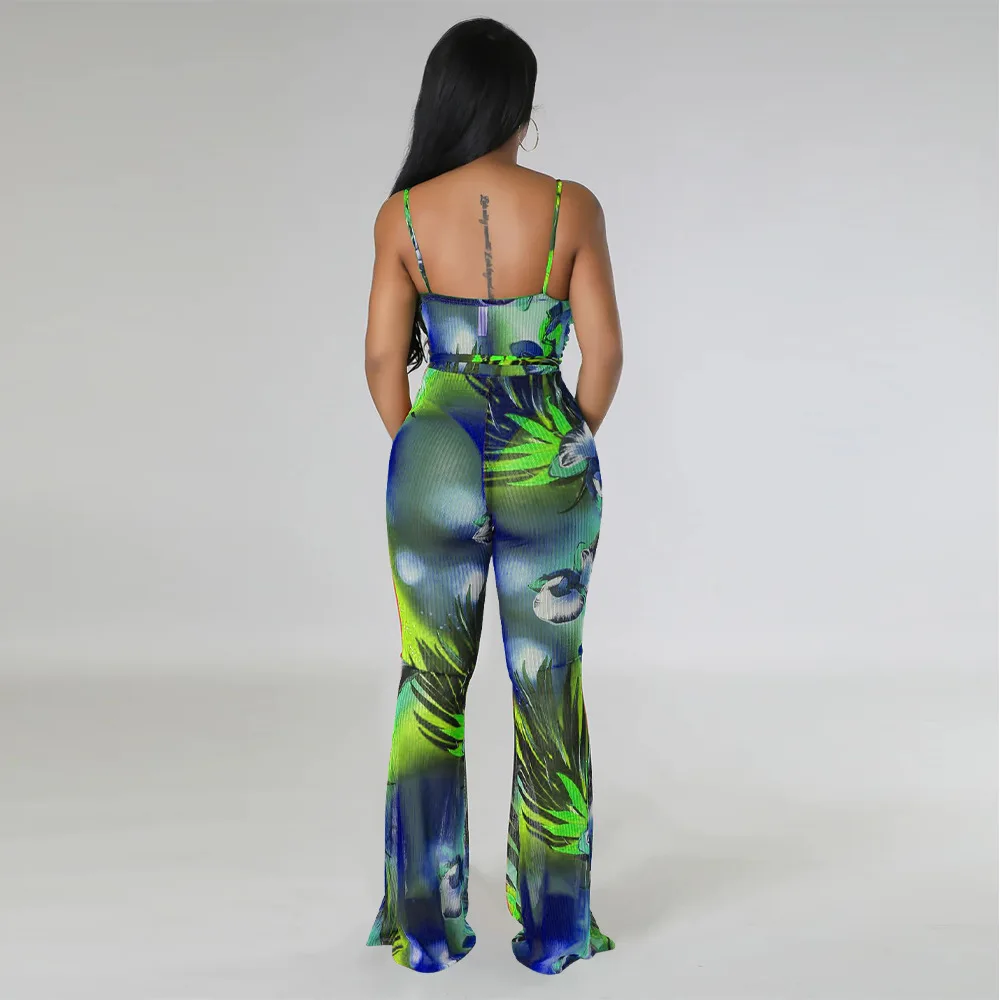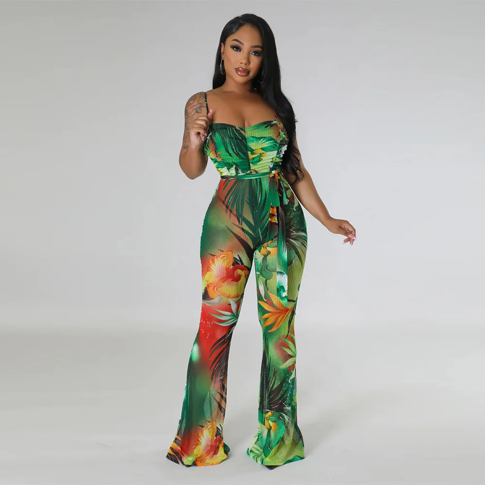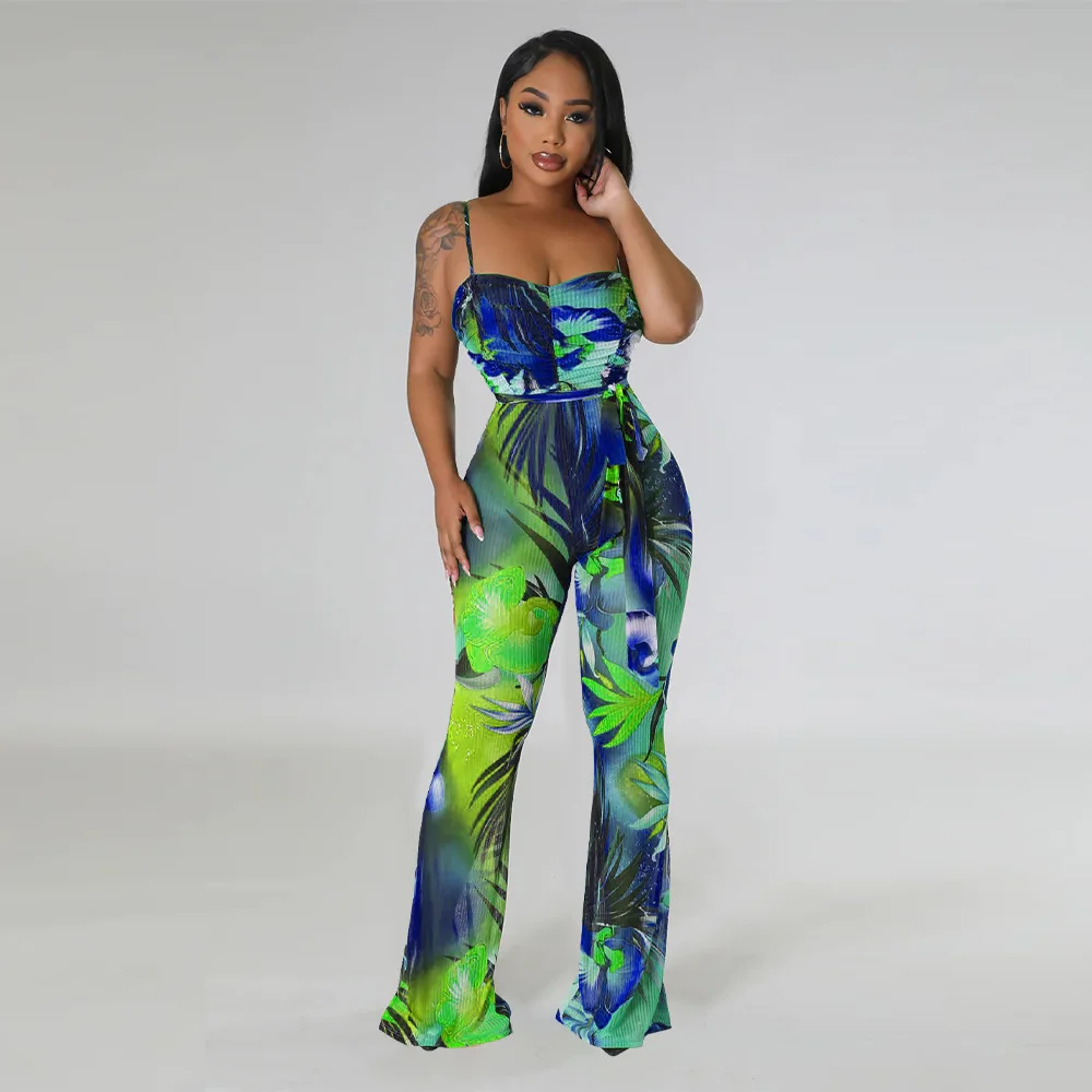 CM.YAYA Fashion Women Floral Printed Wide Leg Pleated Jumpsuit 2023 INS High Waist Spaghetti Strap Flare One Piece Set Playsuit