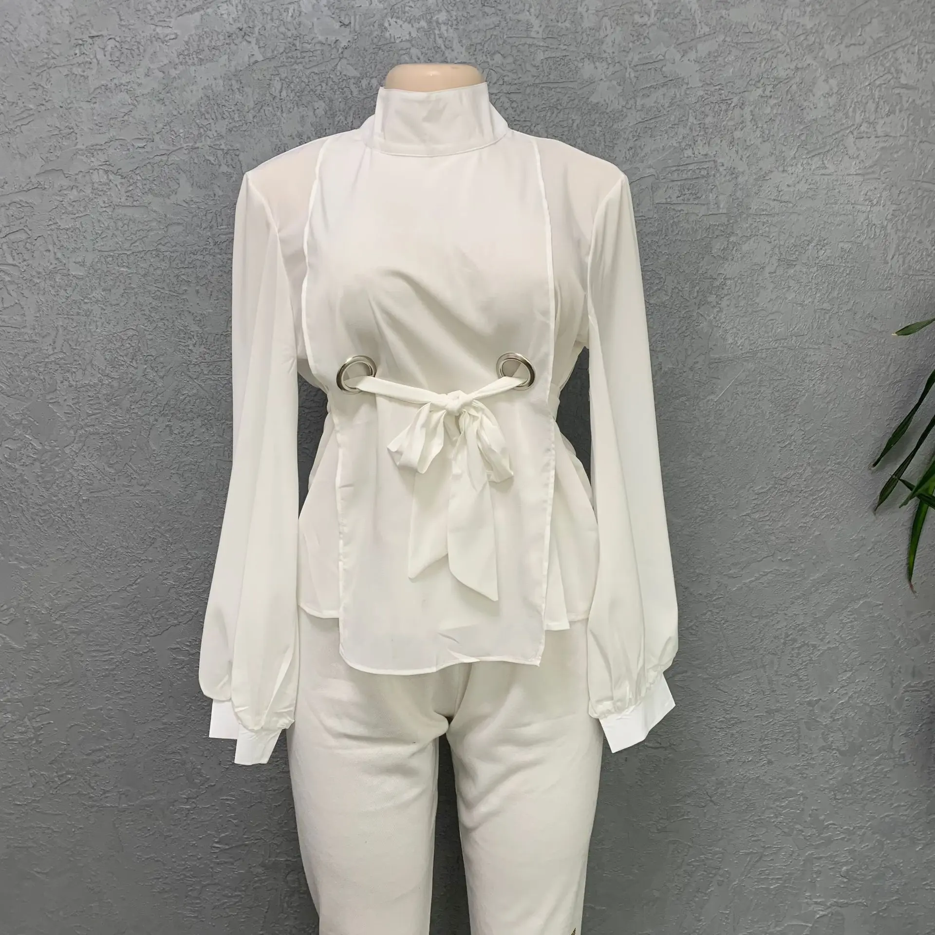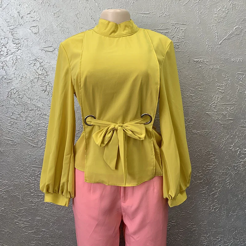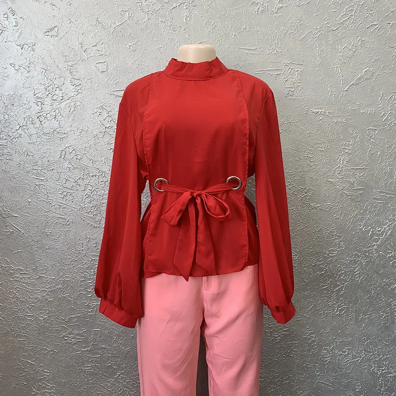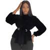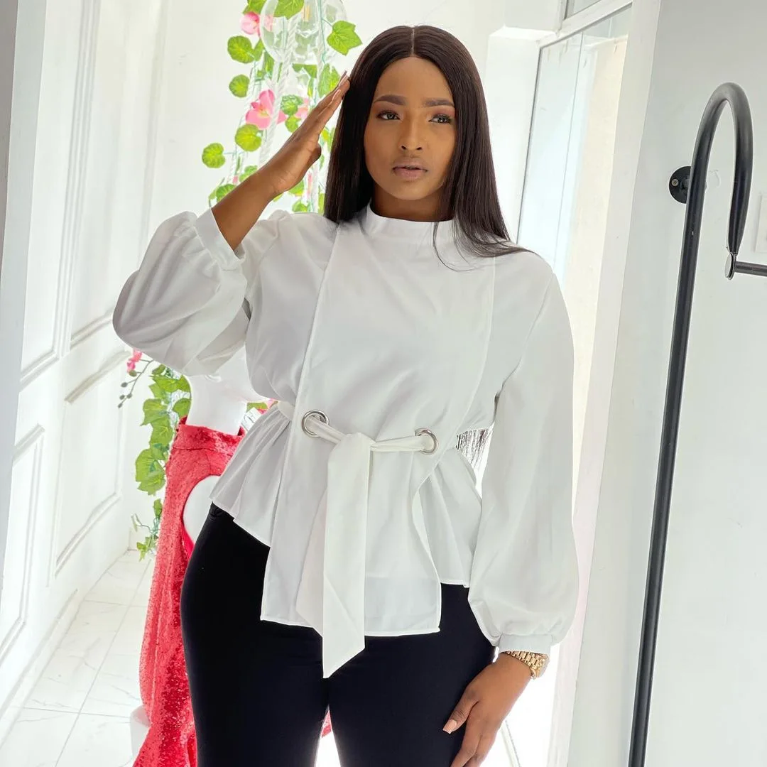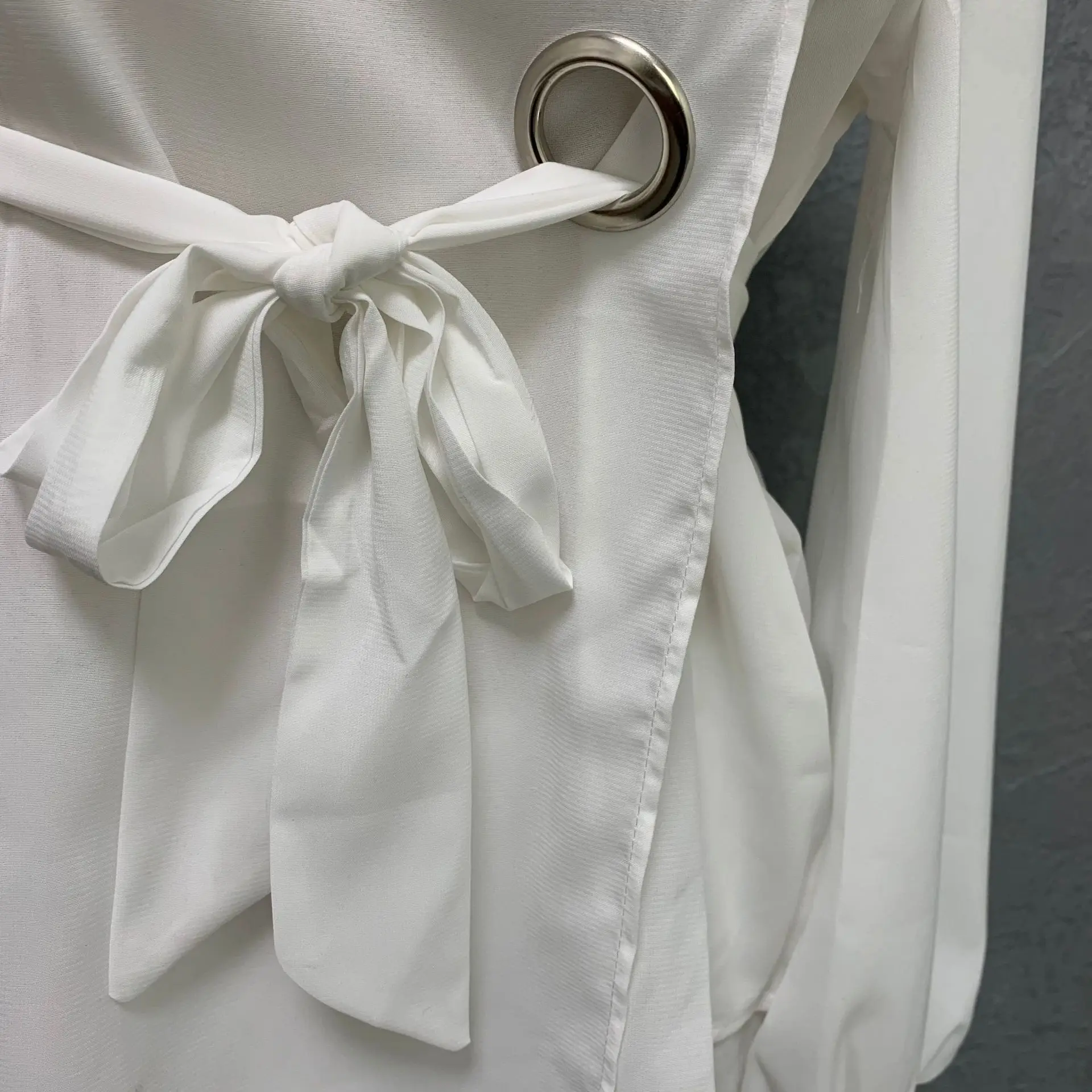 CM.YAYA Fashion Women Lantern Long Sleeve O-neck Eyelet Waist Tassel Chiffon Blouse and Shirt Tops