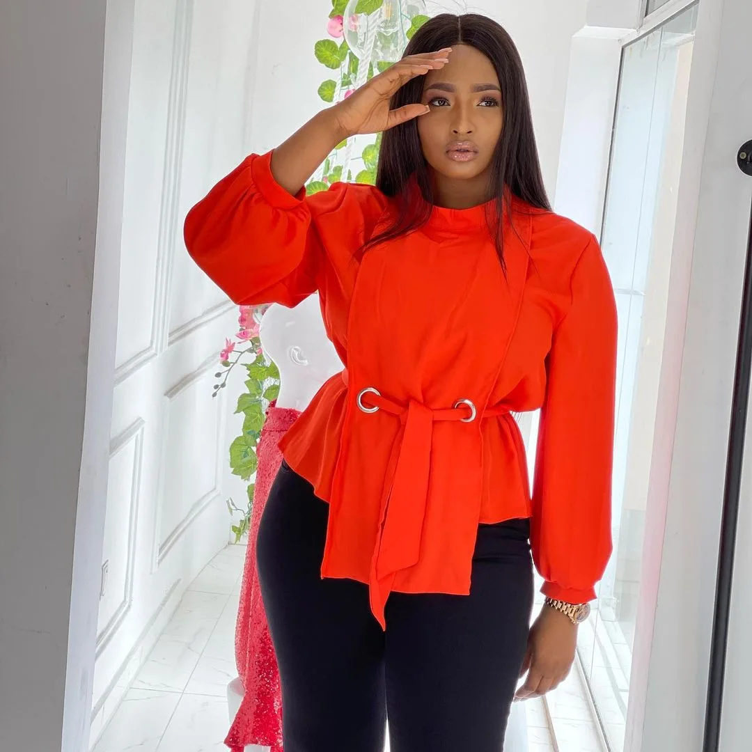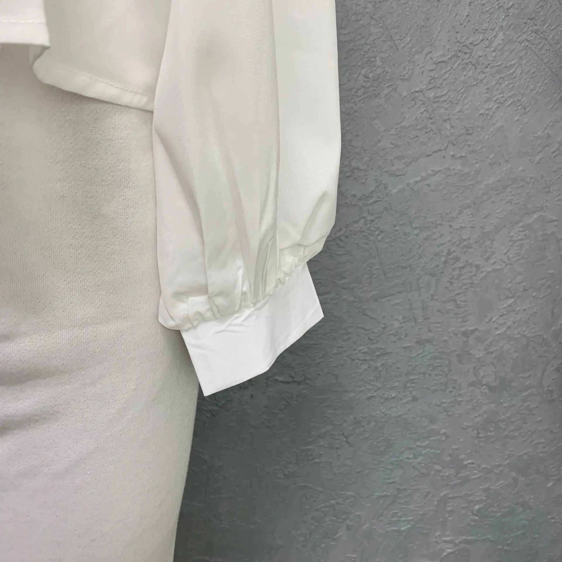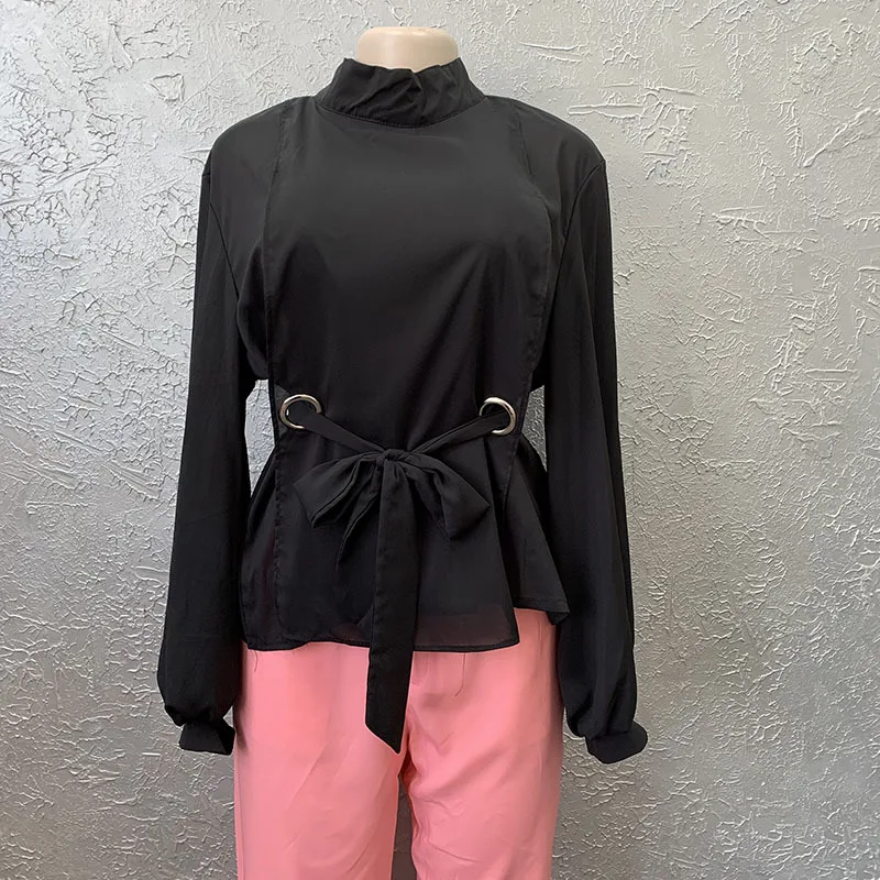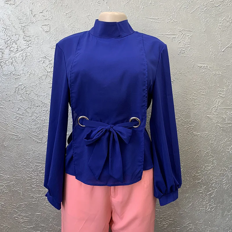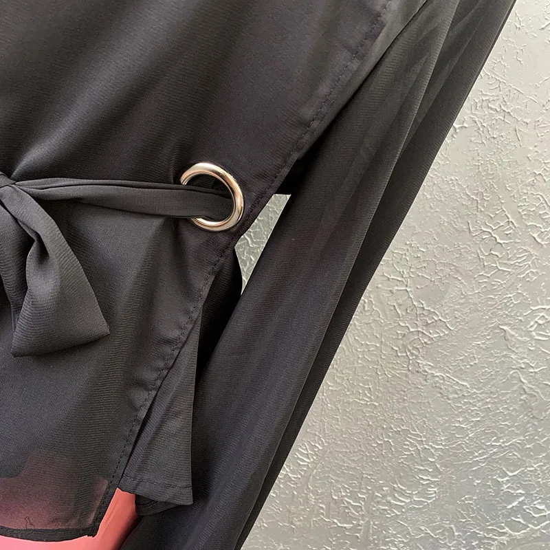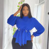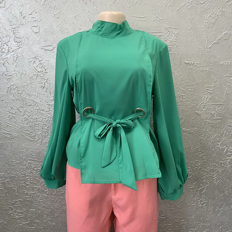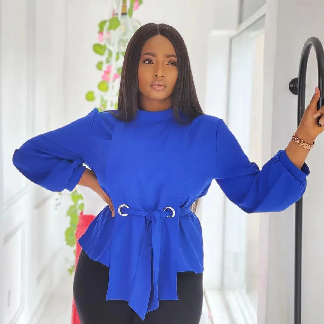 CM.YAYA Fashion Women Lantern Long Sleeve O-neck Eyelet Waist Tassel Chiffon Blouse and Shirt Tops