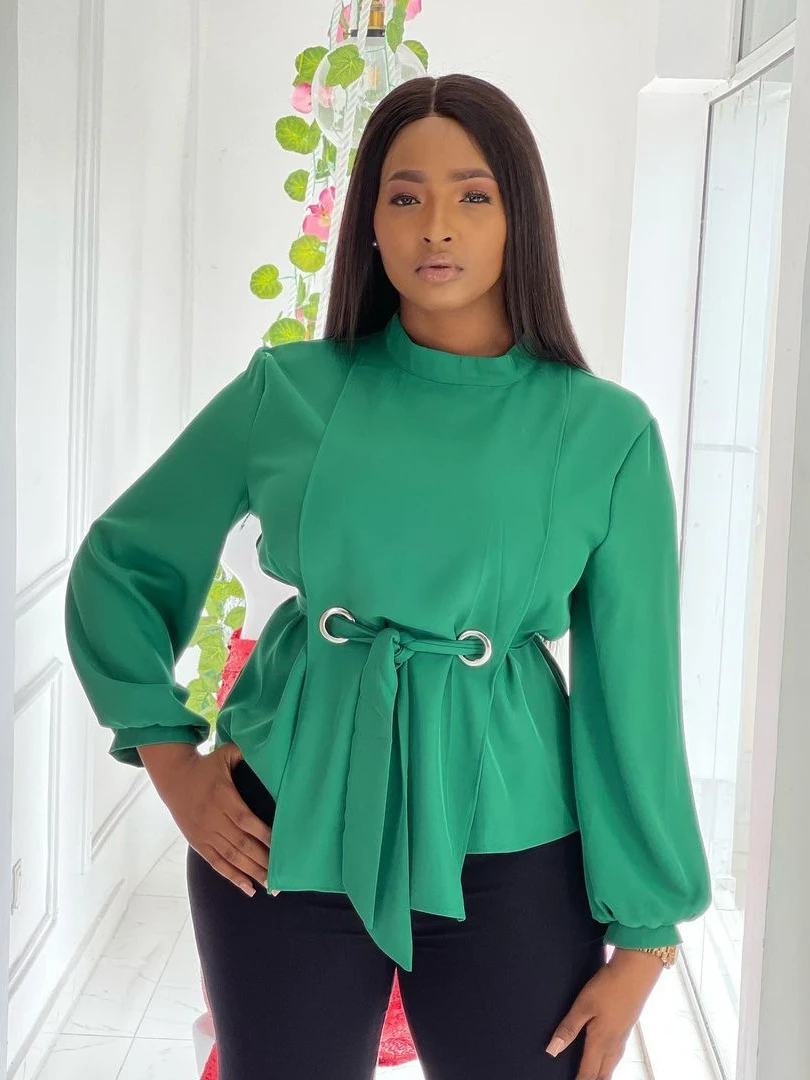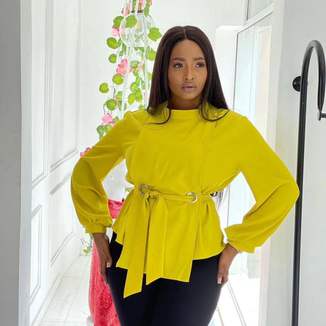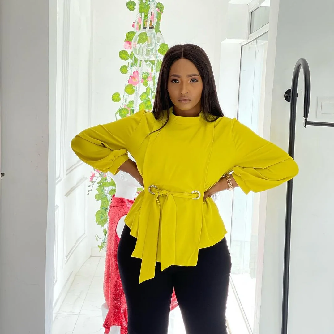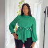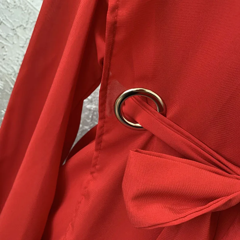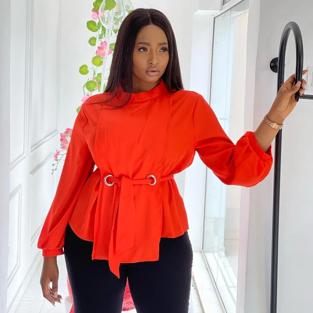 CM.YAYA Fashion Women Lantern Long Sleeve O-neck Eyelet Waist Tassel Chiffon Blouse and Shirt Tops