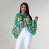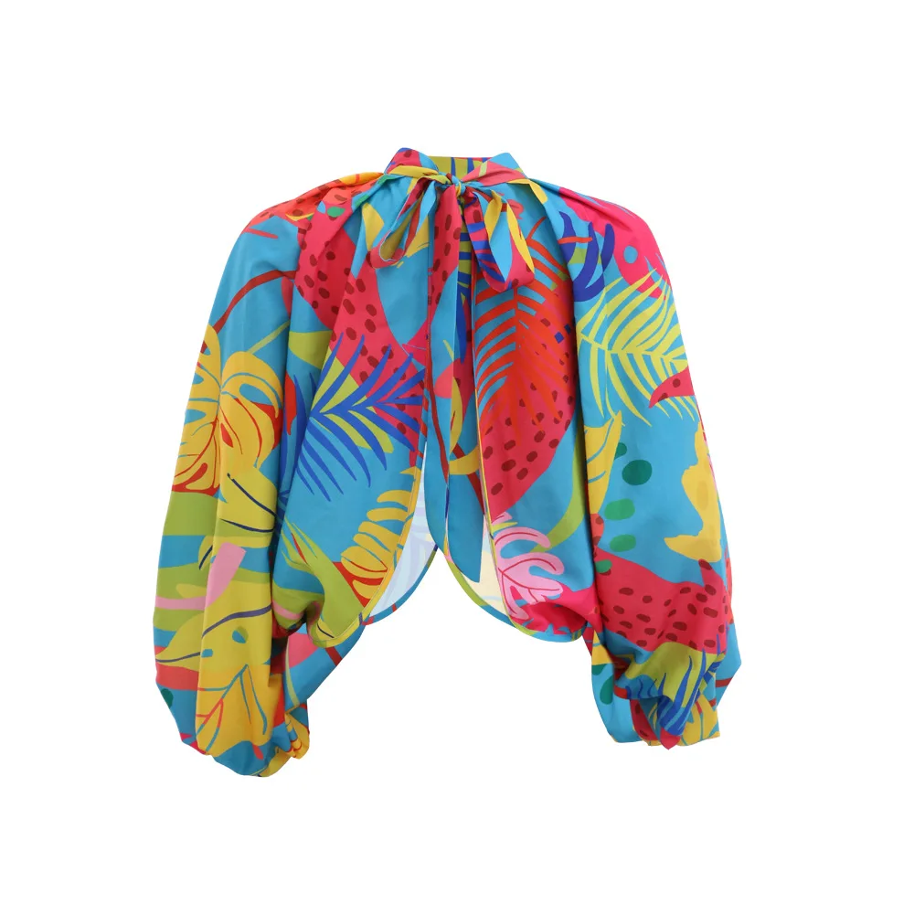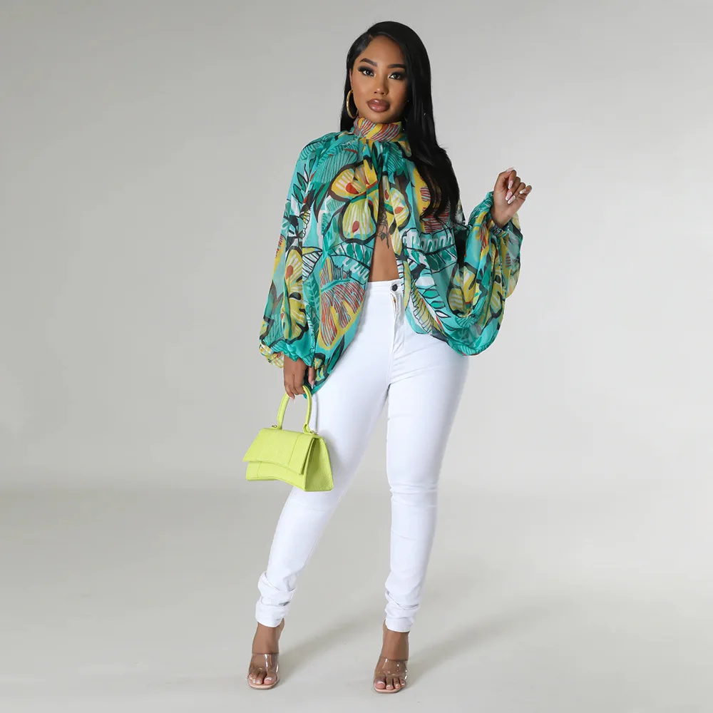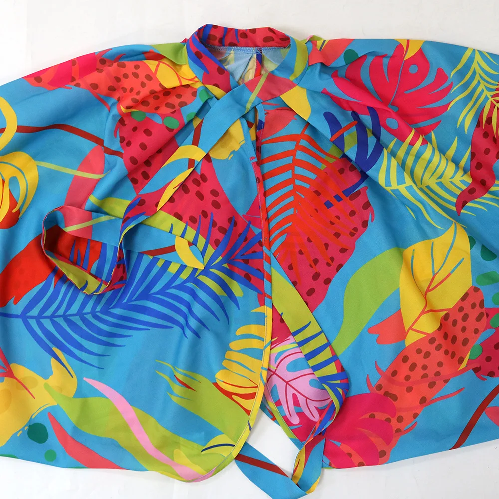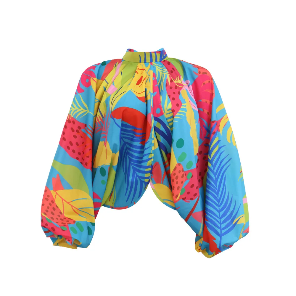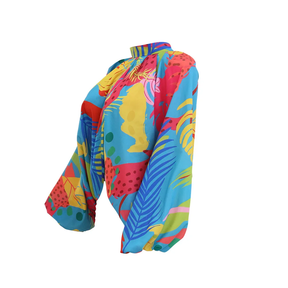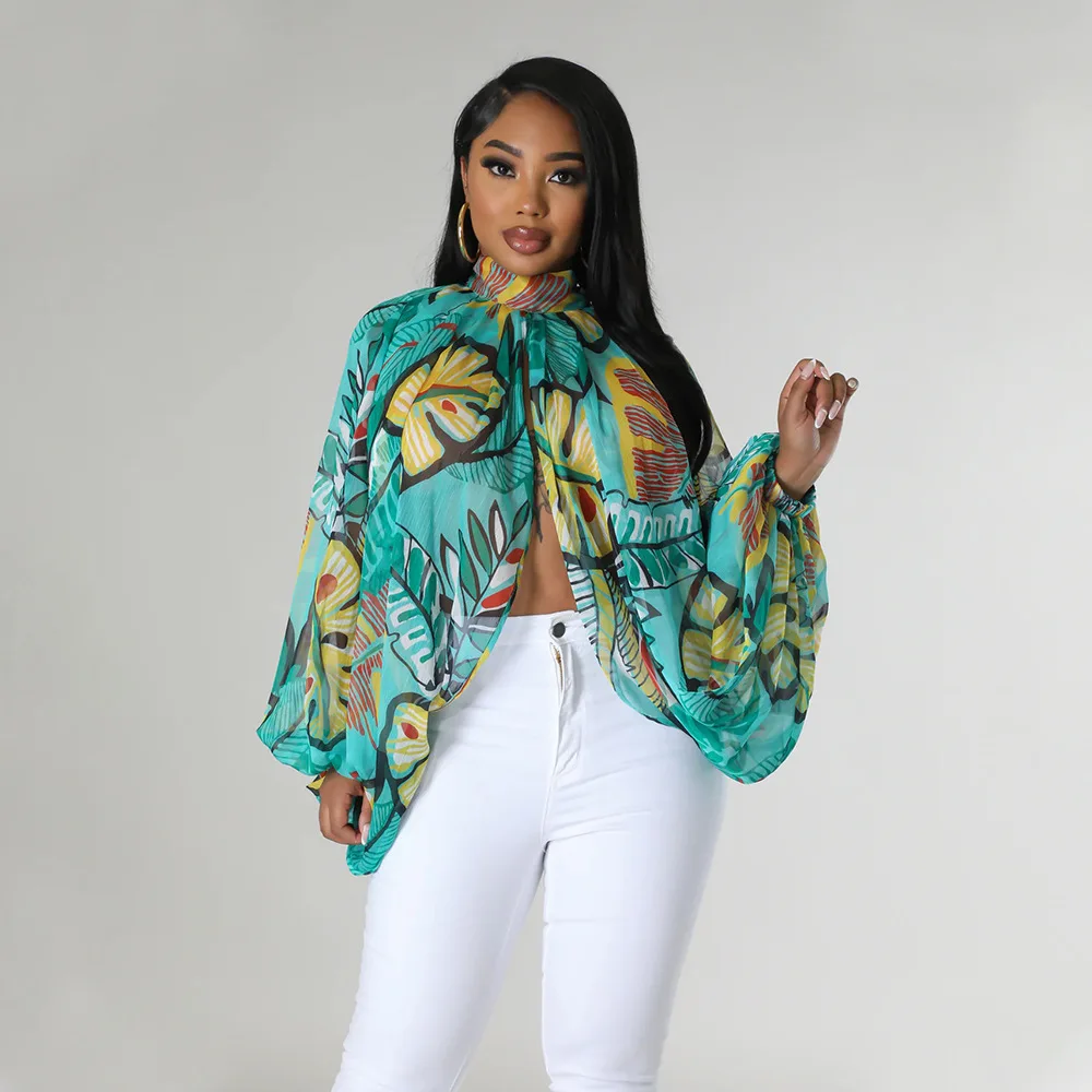 CM.YAYA Fashion Women Leaf Printed Stand Collar Batwing Long Sleeve Split Blouse 2023 Summer Beach Chic Shirt Tops