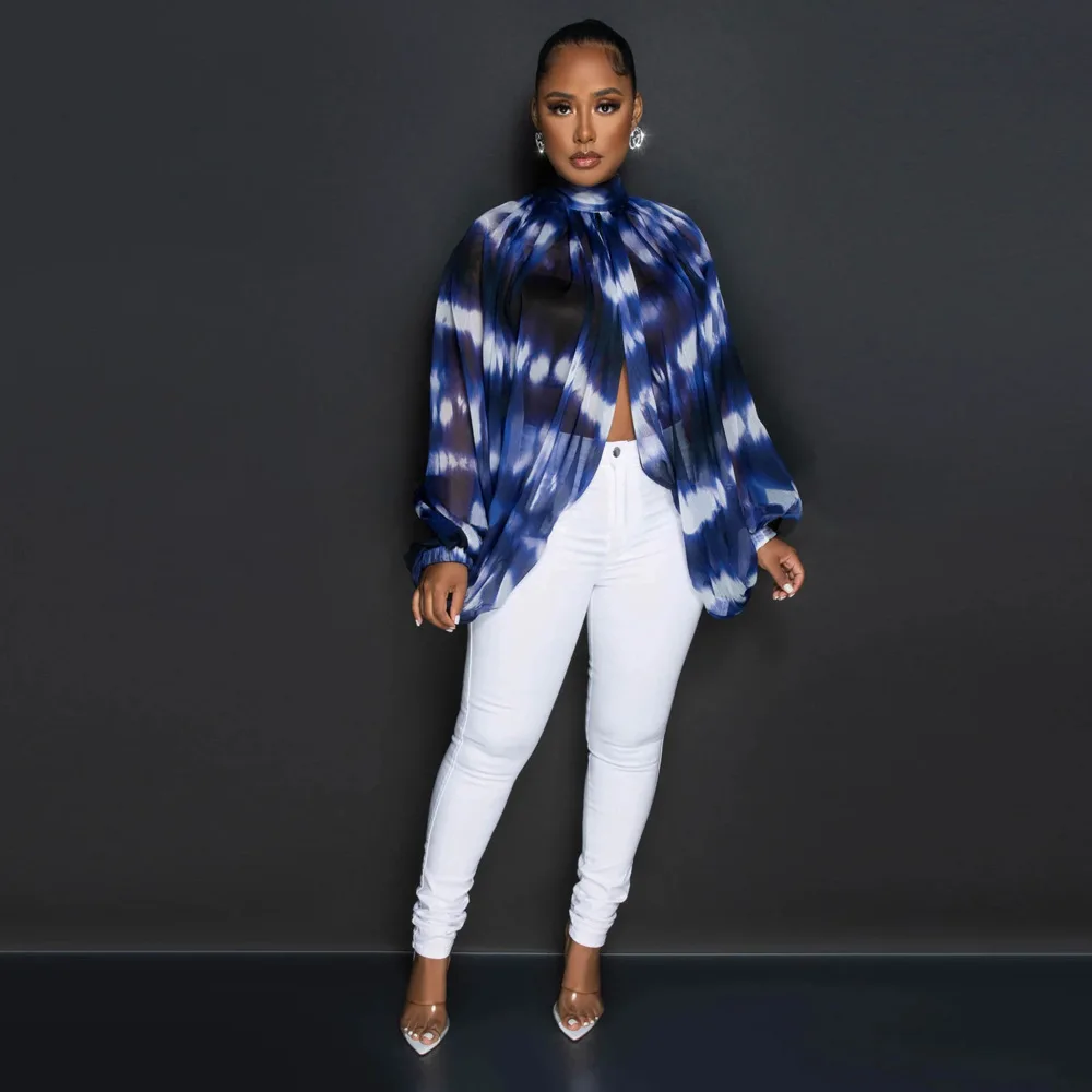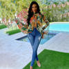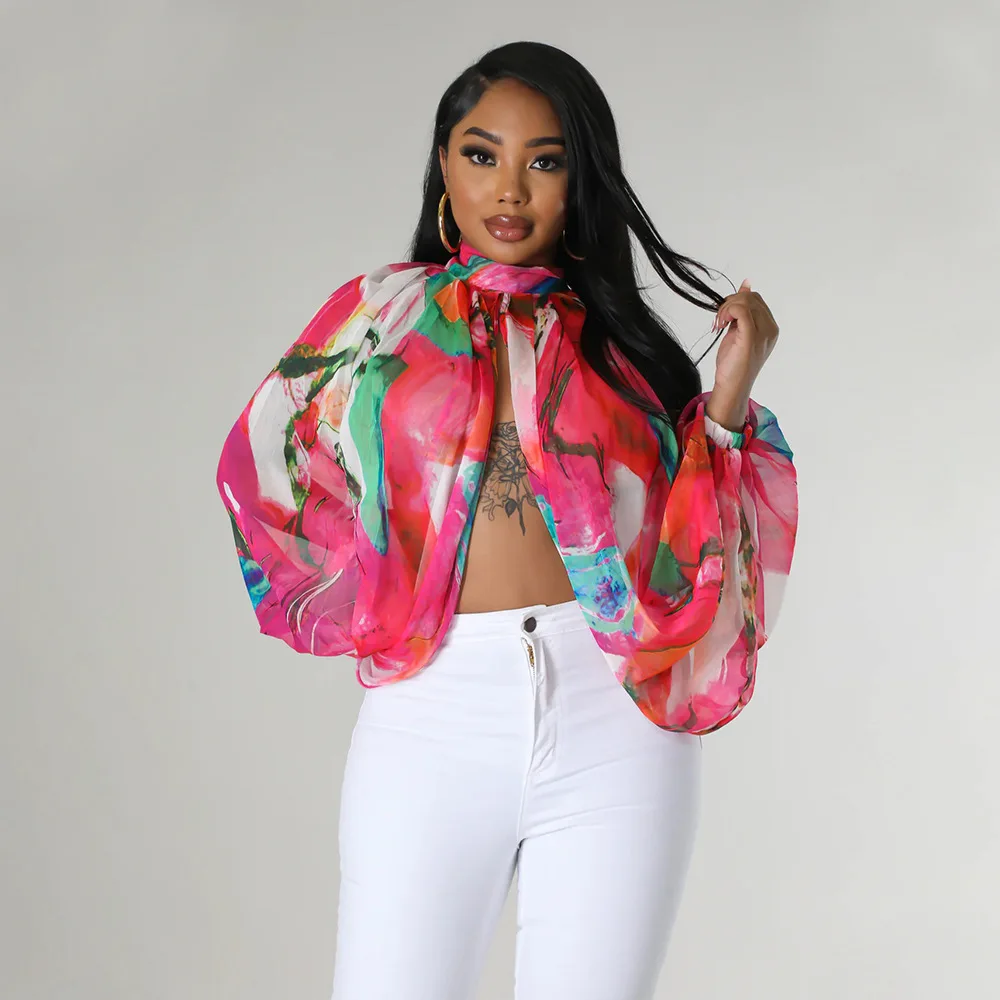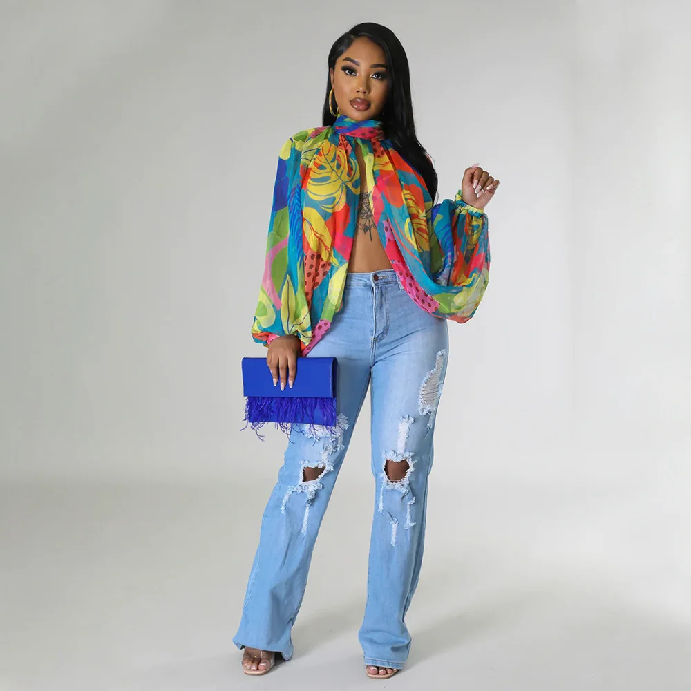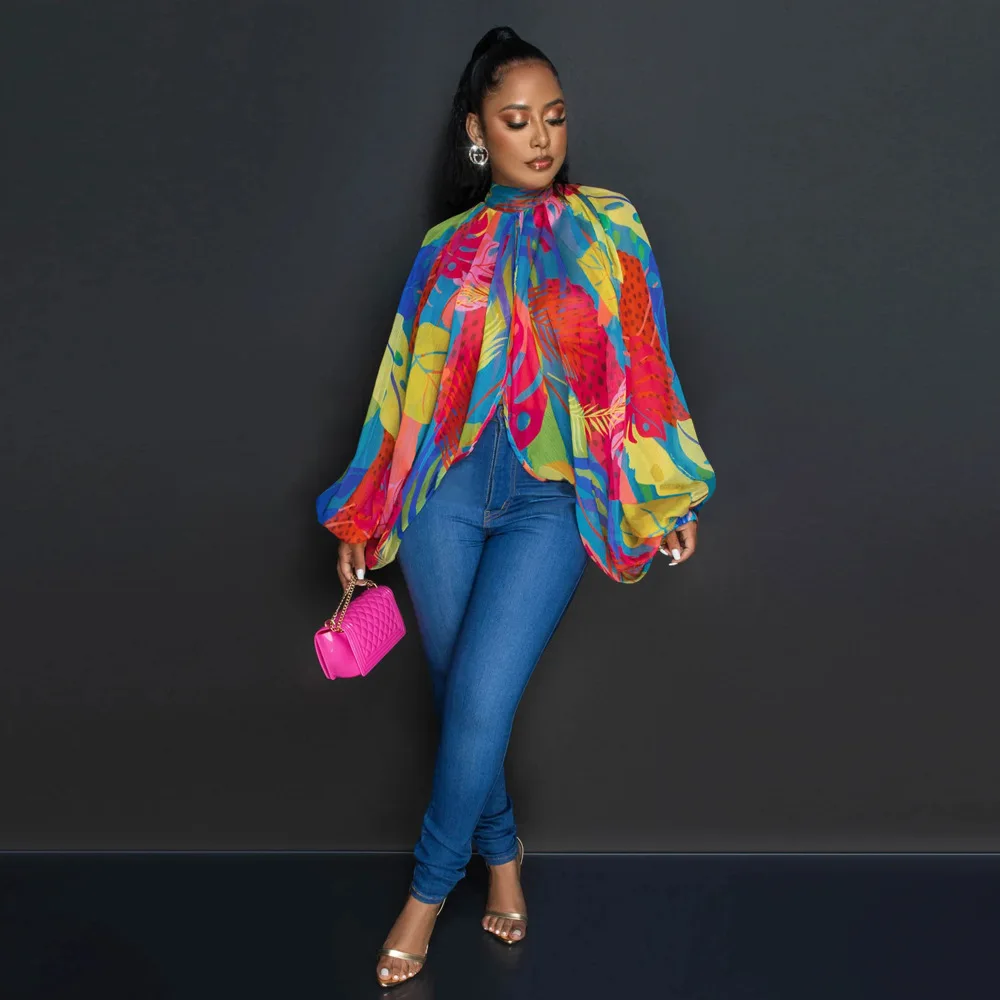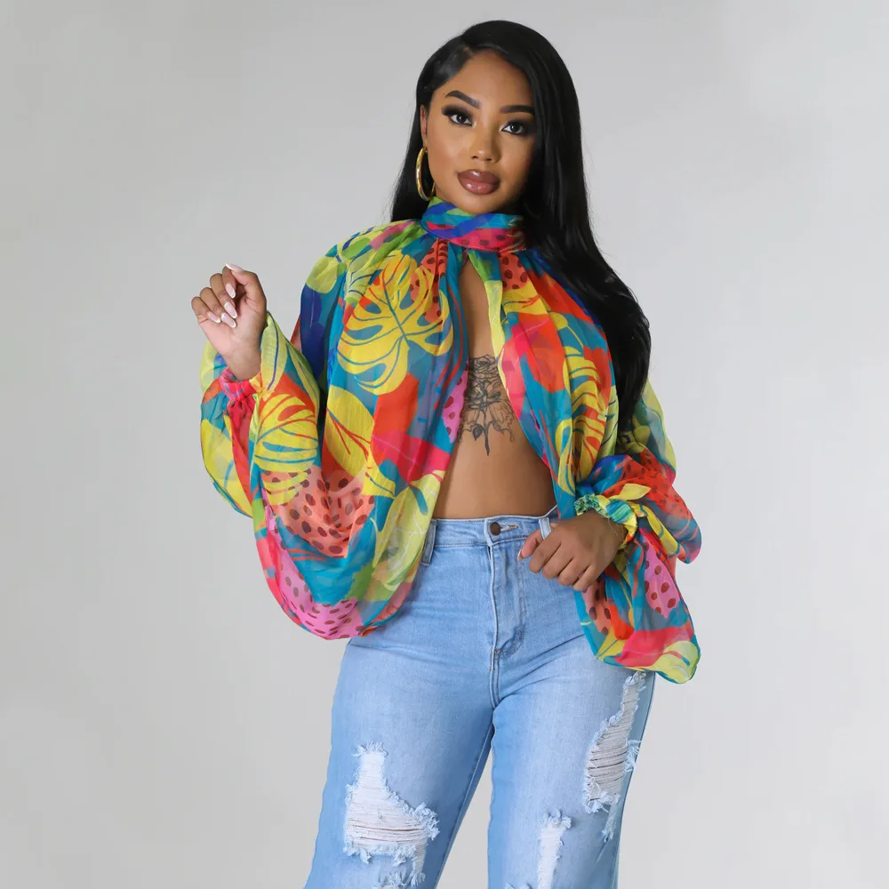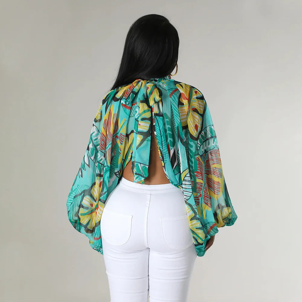 CM.YAYA Fashion Women Leaf Printed Stand Collar Batwing Long Sleeve Split Blouse 2023 Summer Beach Chic Shirt Tops