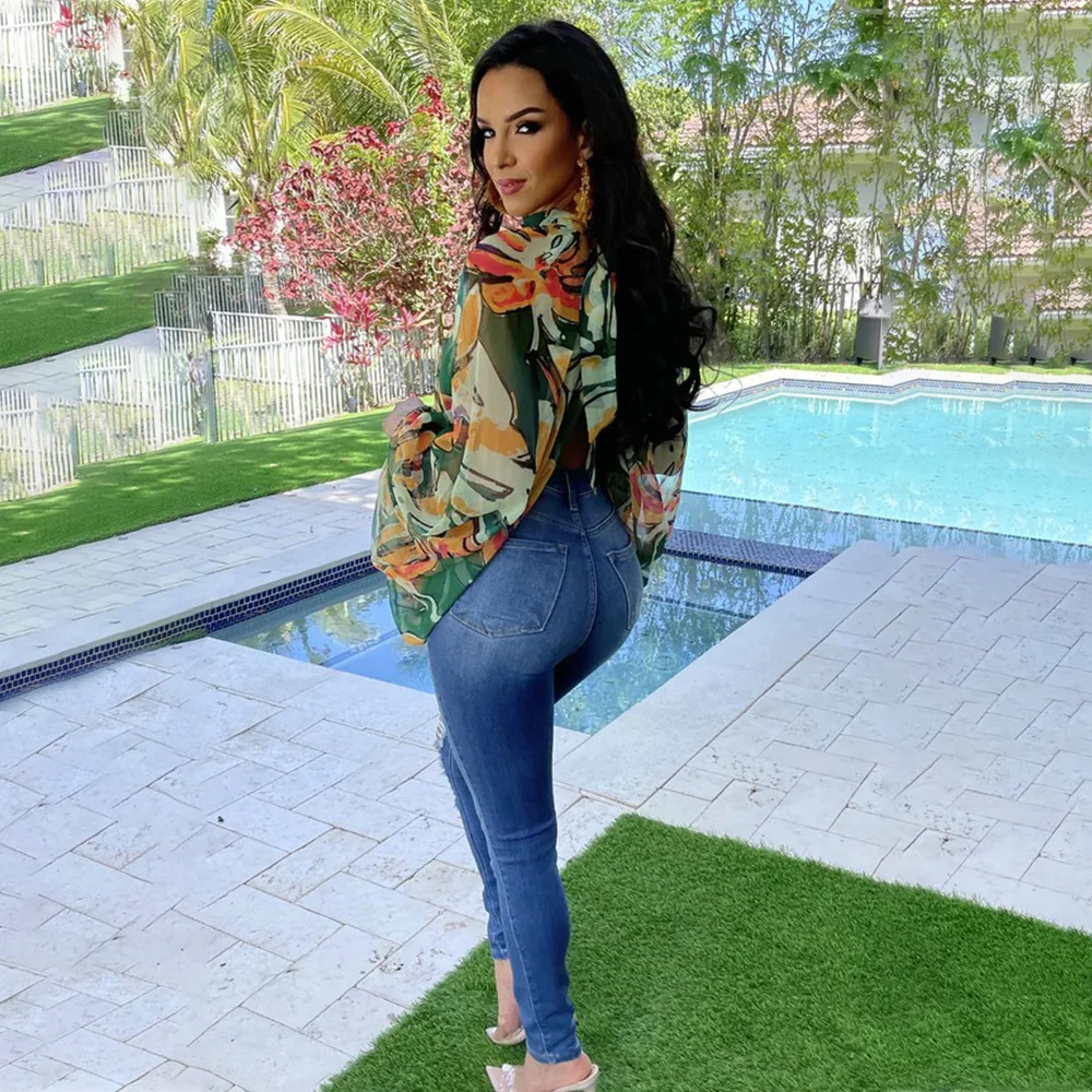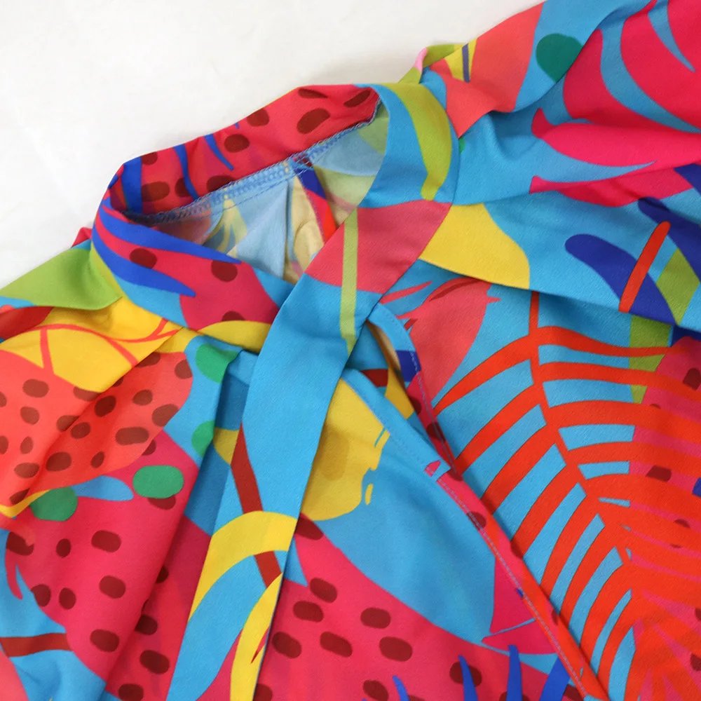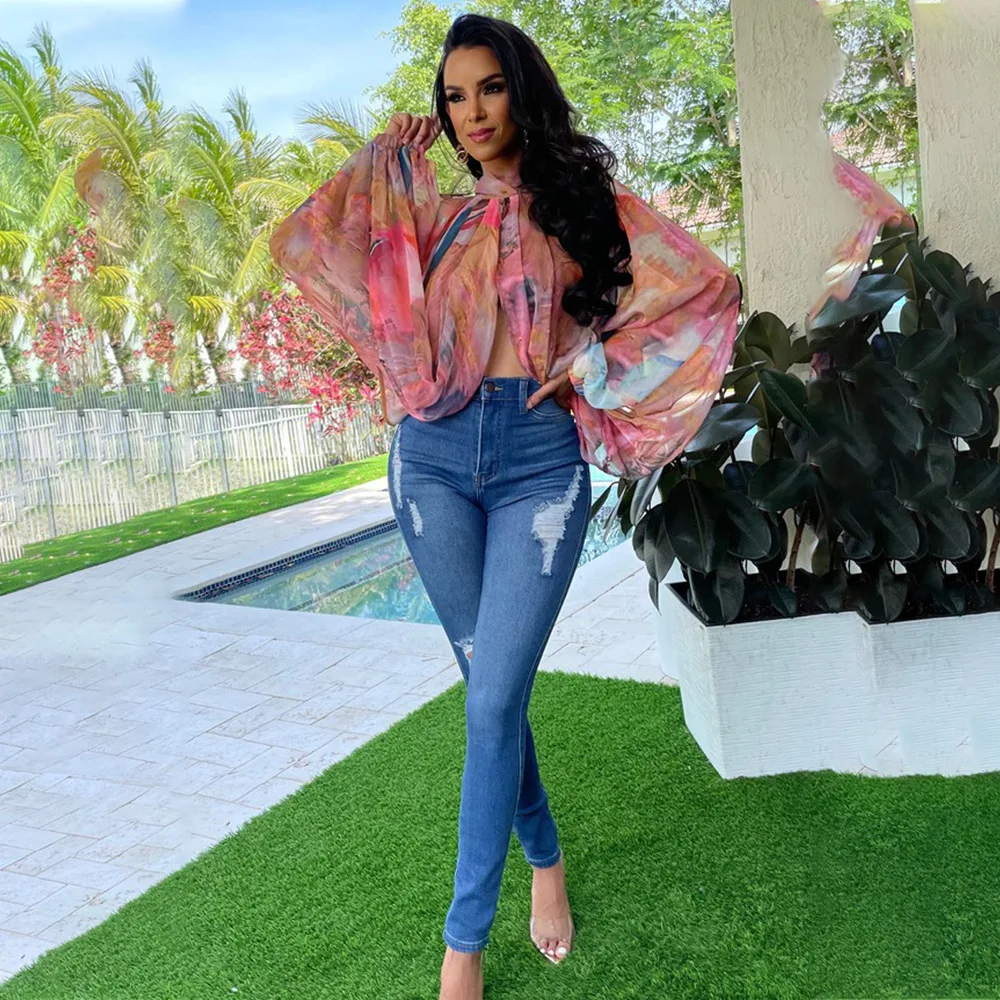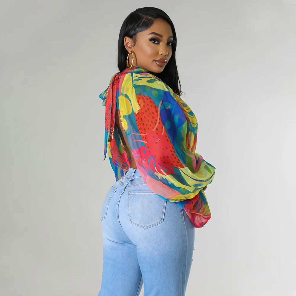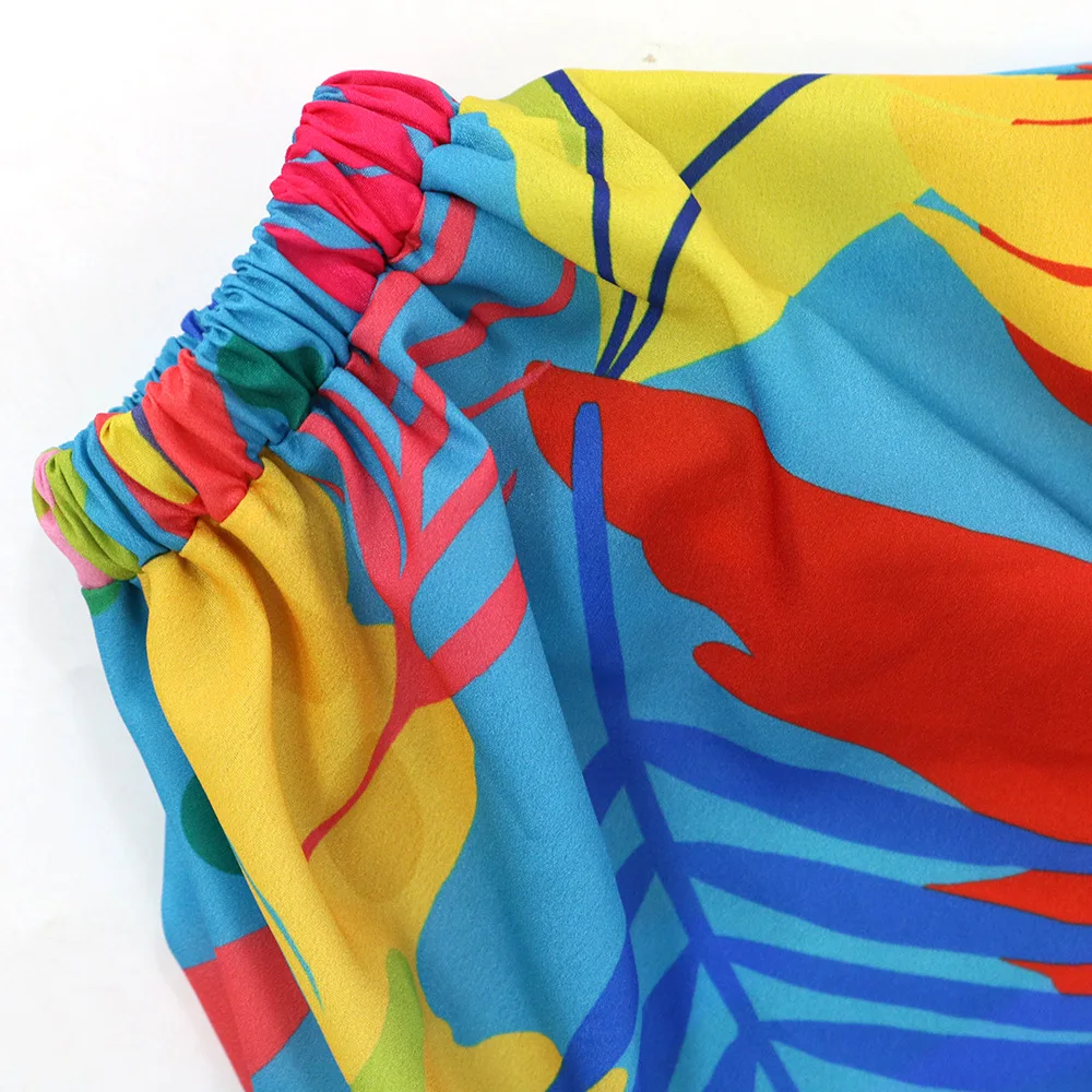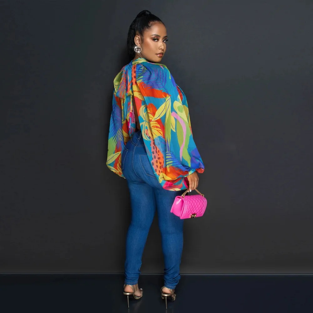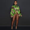CM.YAYA Fashion Women Leaf Printed Stand Collar Batwing Long Sleeve Split Blouse 2023 Summer Beach Chic Shirt Tops