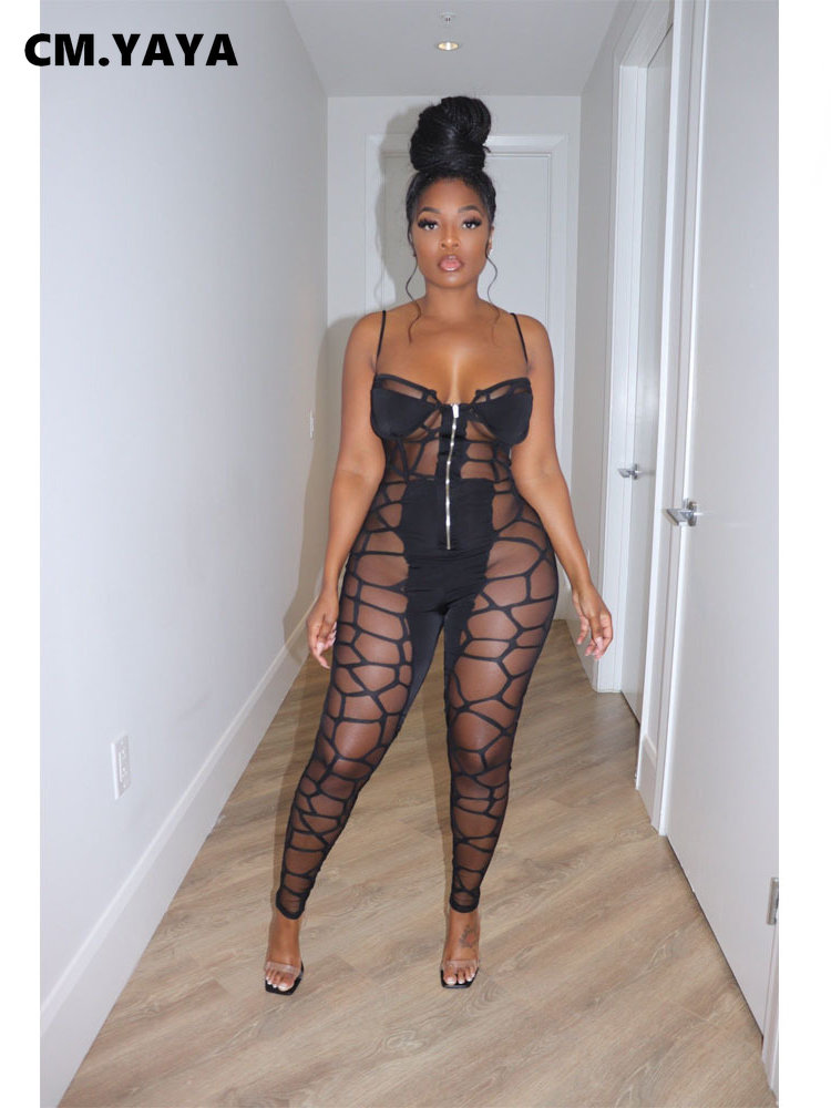 CM.YAYA Fashion Women Mesh See Though Butterfly Style Strap Zipper Fly Jumpsuit 2023 Sexy Party One Piece Set Outfit Playsuit