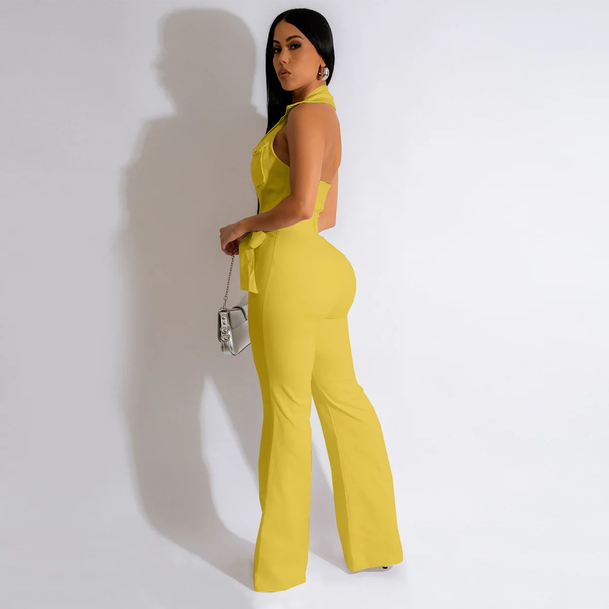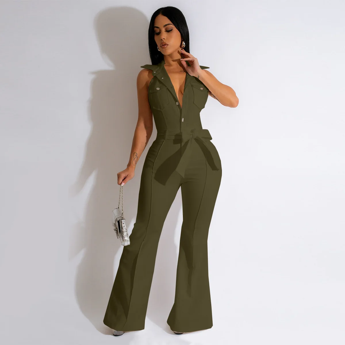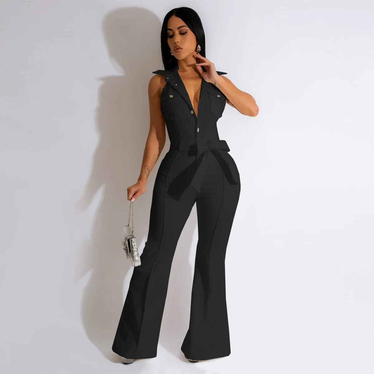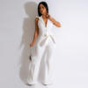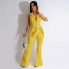 CM.YAYA Fashion Women Pocket Front Single Breasted Sleeveless Wide Leg Flare Jumpsuit 2023 Summer Romper One Piece Set Playsuit