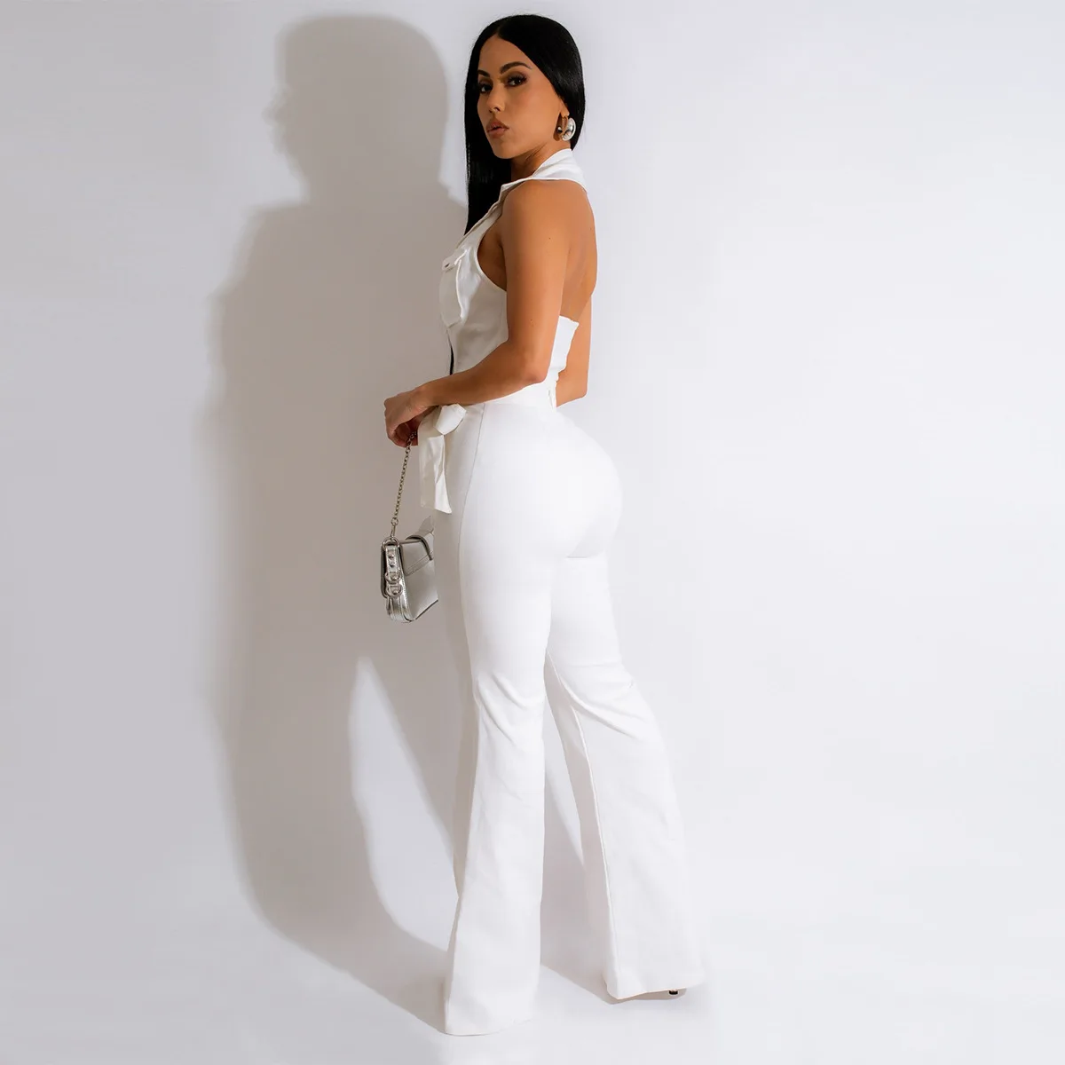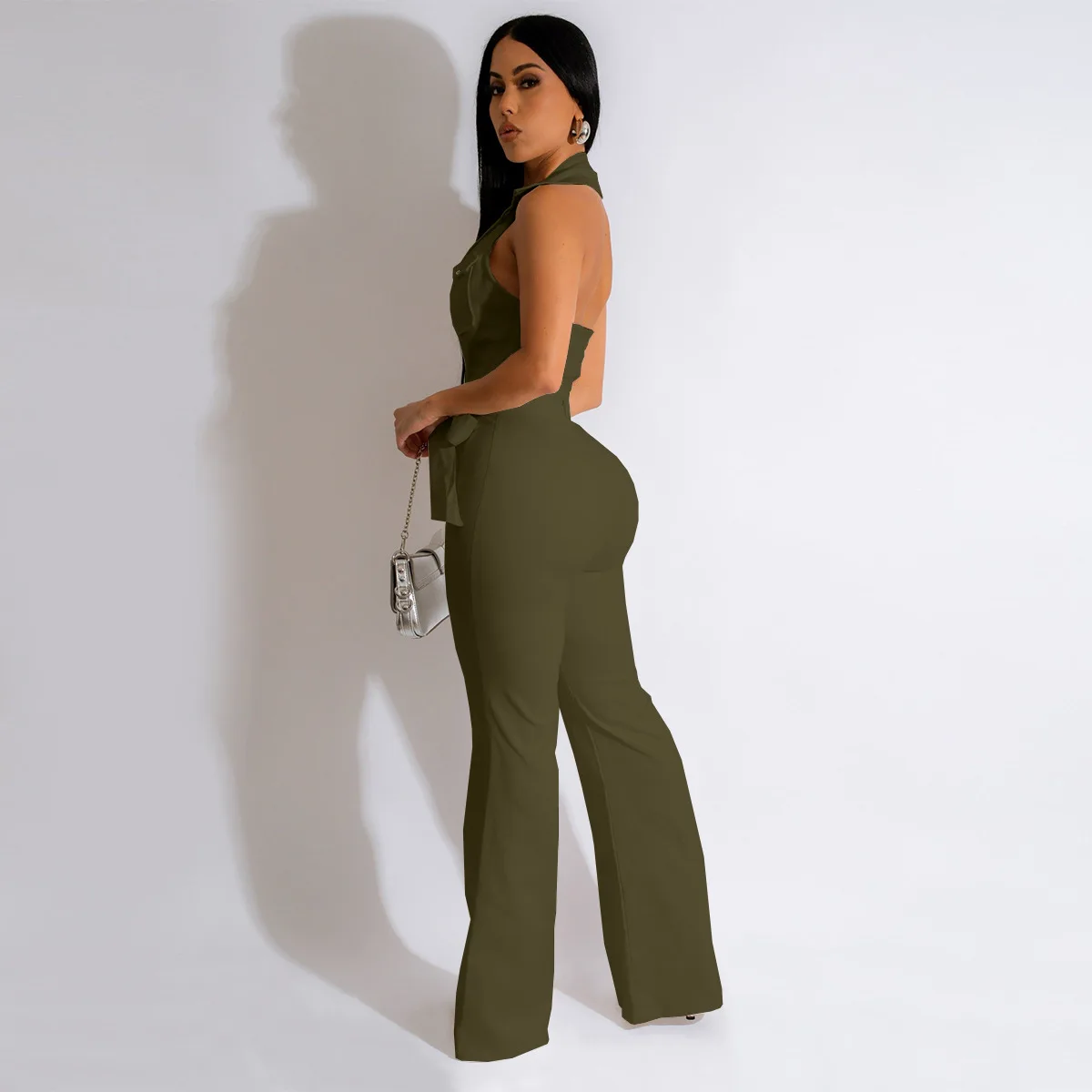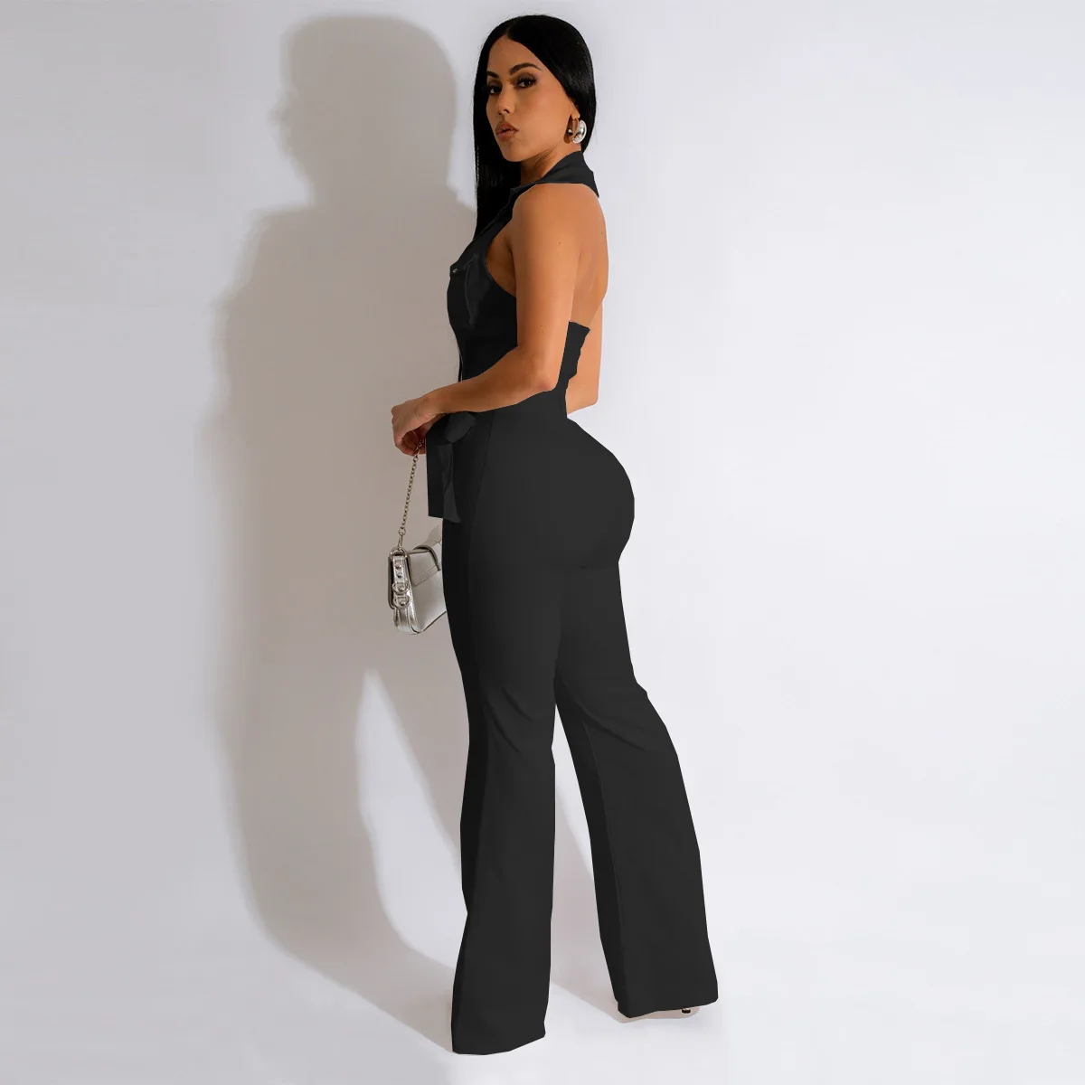 CM.YAYA Fashion Women Pocket Front Single Breasted Sleeveless Wide Leg Flare Jumpsuit 2023 Summer Romper One Piece Set Playsuit