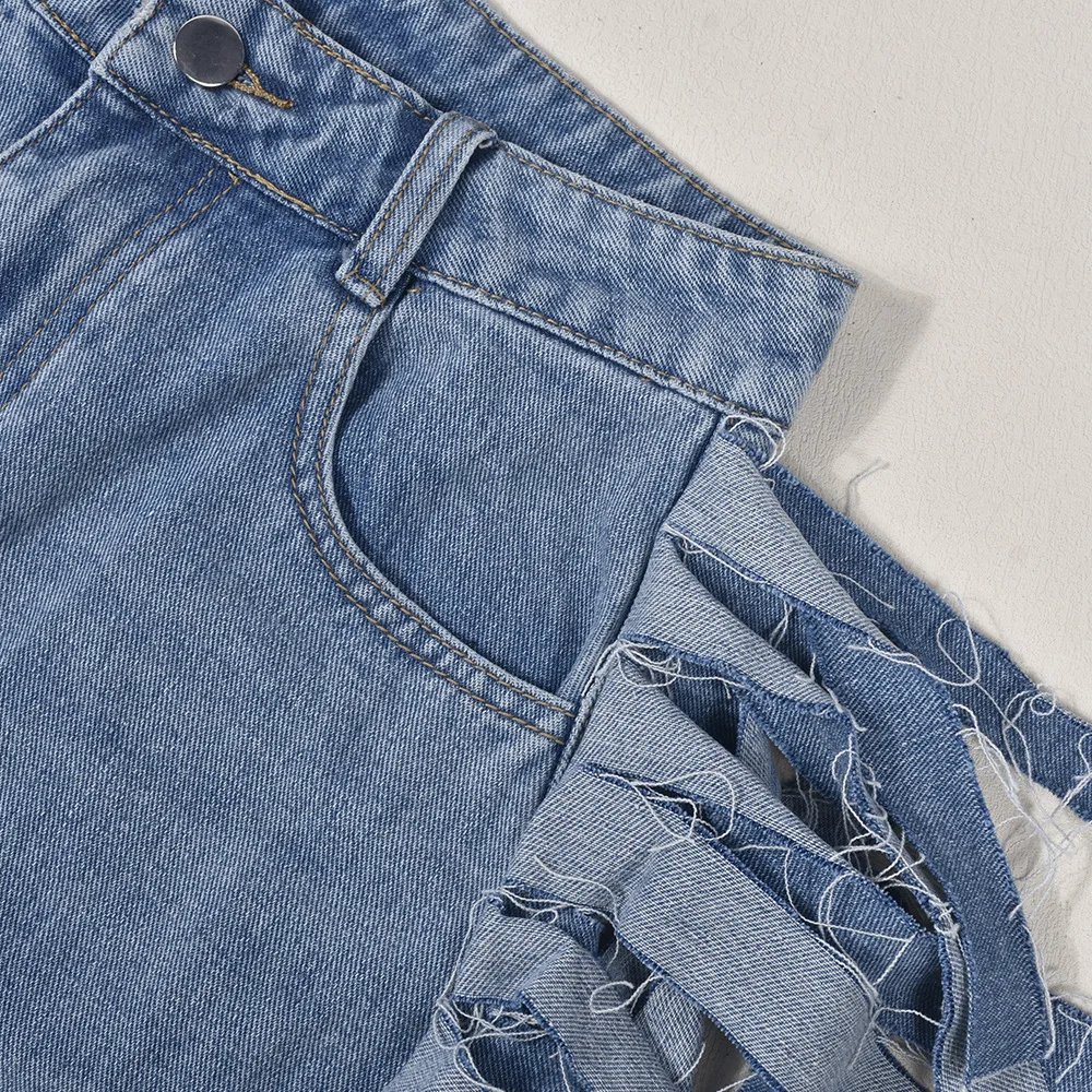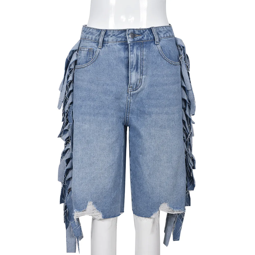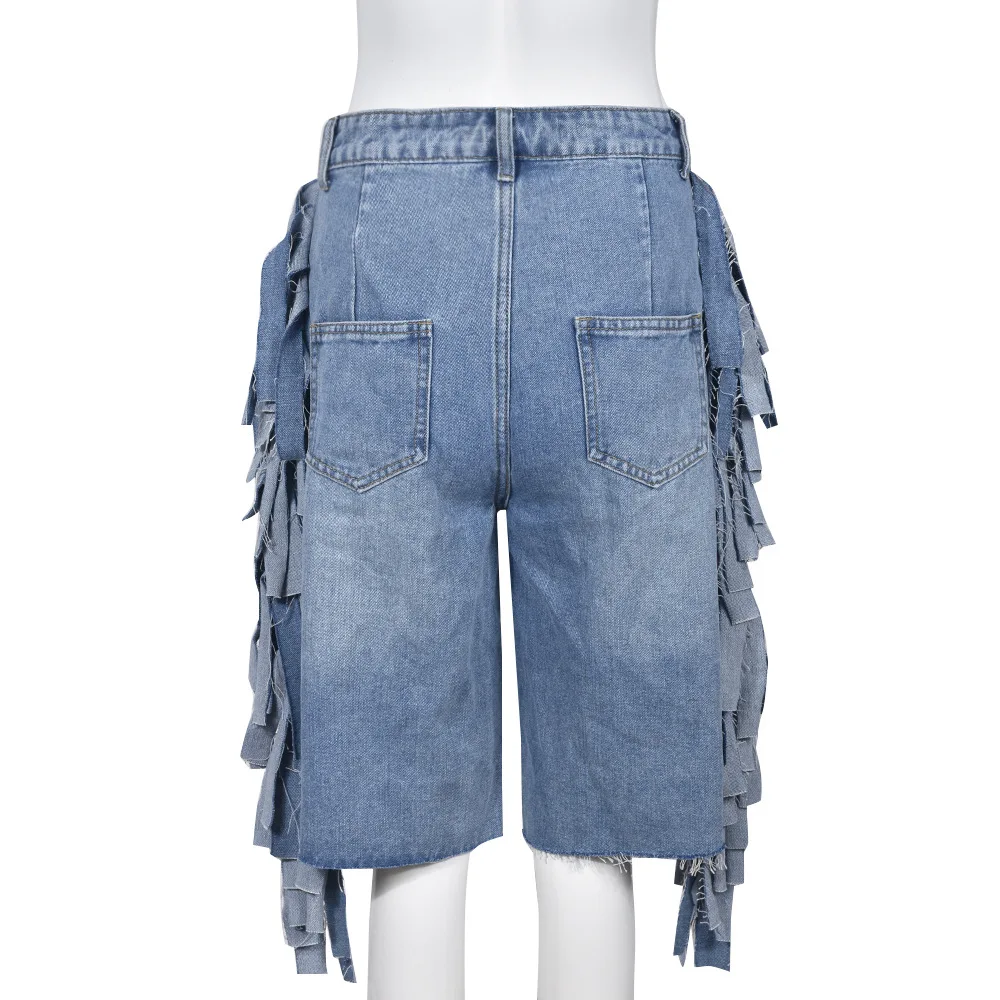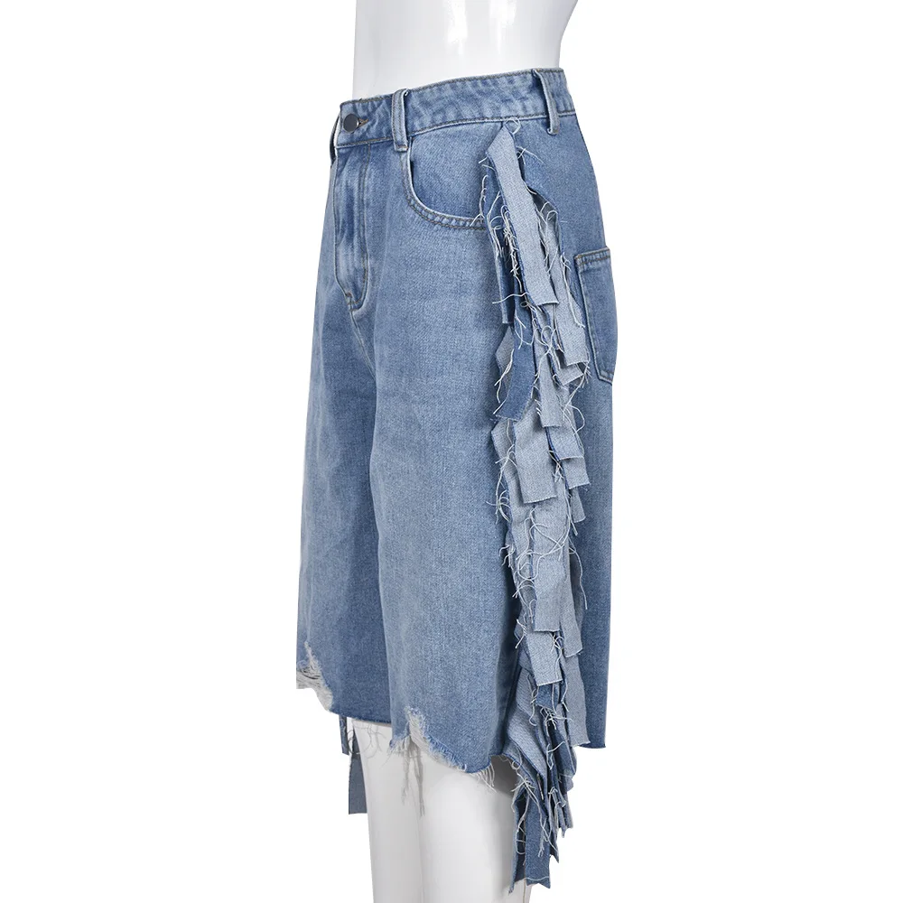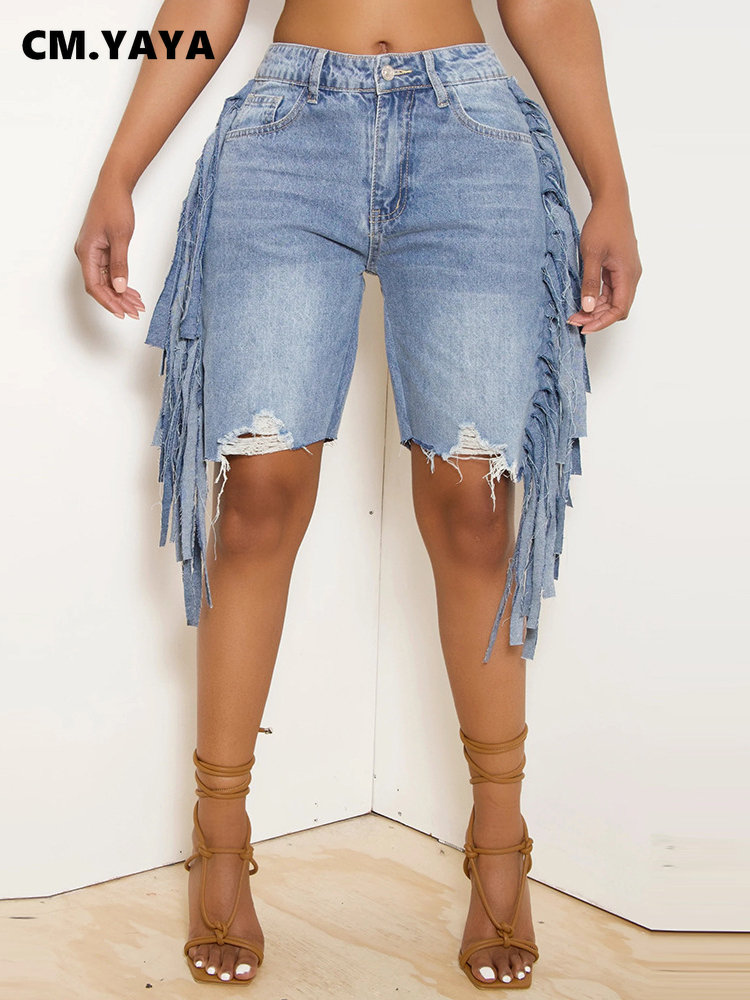 CM.YAYA Fashion Women Tassel Both Side Ripped Hem Zipper Fly High Waist Knee Length Jeans 2023 Summer Blue Denim Pants