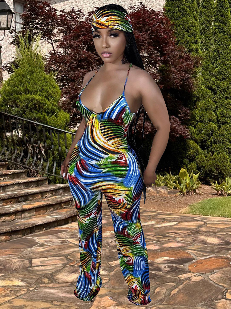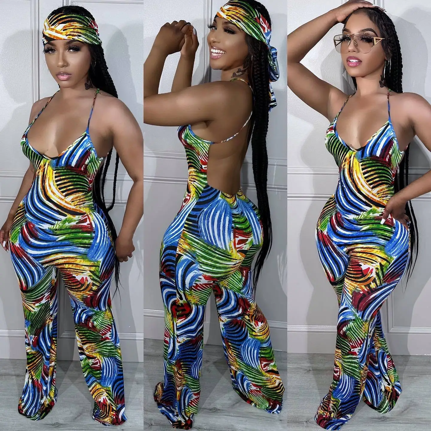 CM.YAYA Fashion Women Tie Dye Striped Printed Halter Neck Backless Sleeveless Jumpsuit 2023 Summer Romper One Piece Set Playsuit