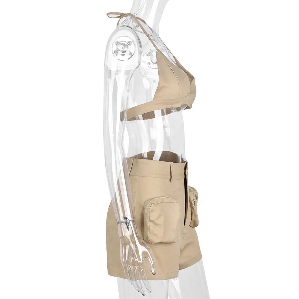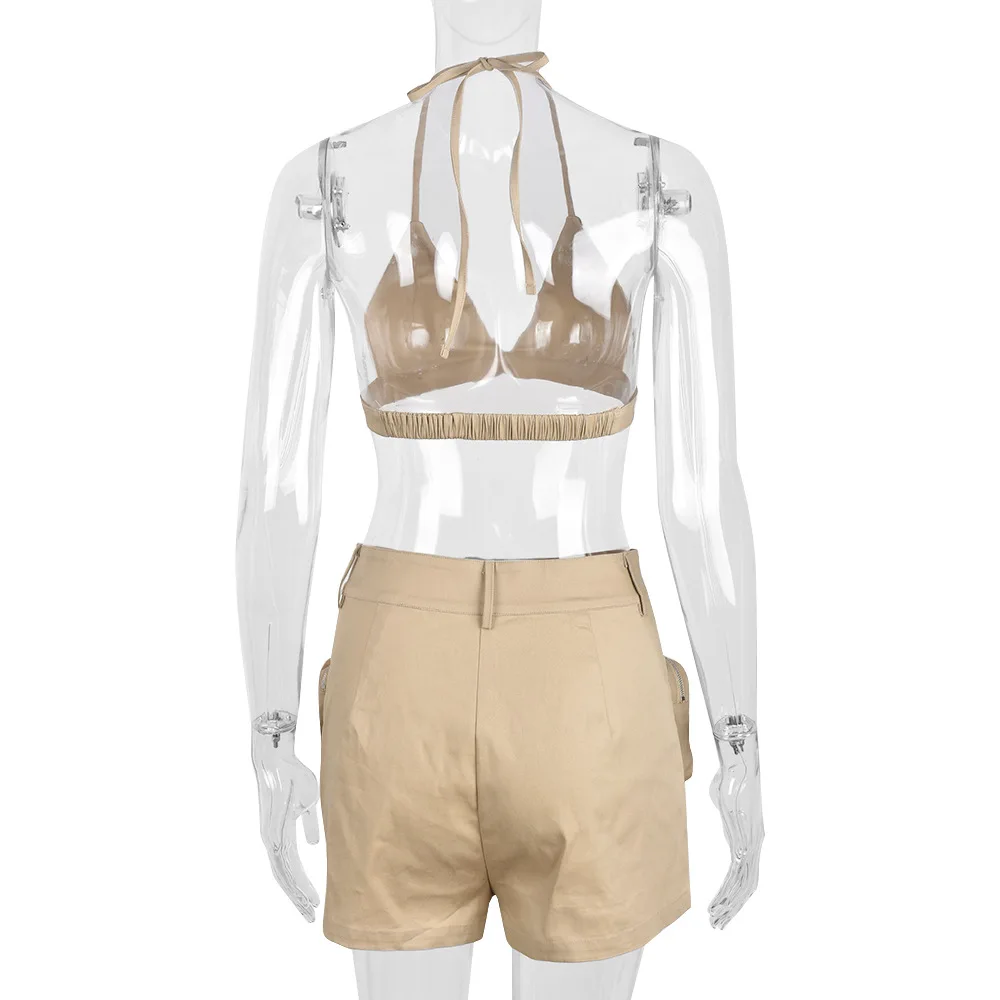 CM.YAYA Fashion Women’s Set Halter Bra Crop Top and Safari Shorts Suit 2023 Active Cargo INS Two 2 Piece Set Outfit Tracksuit