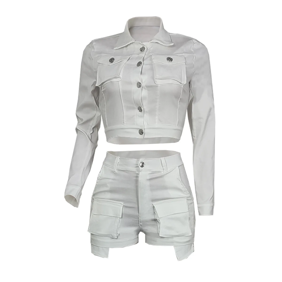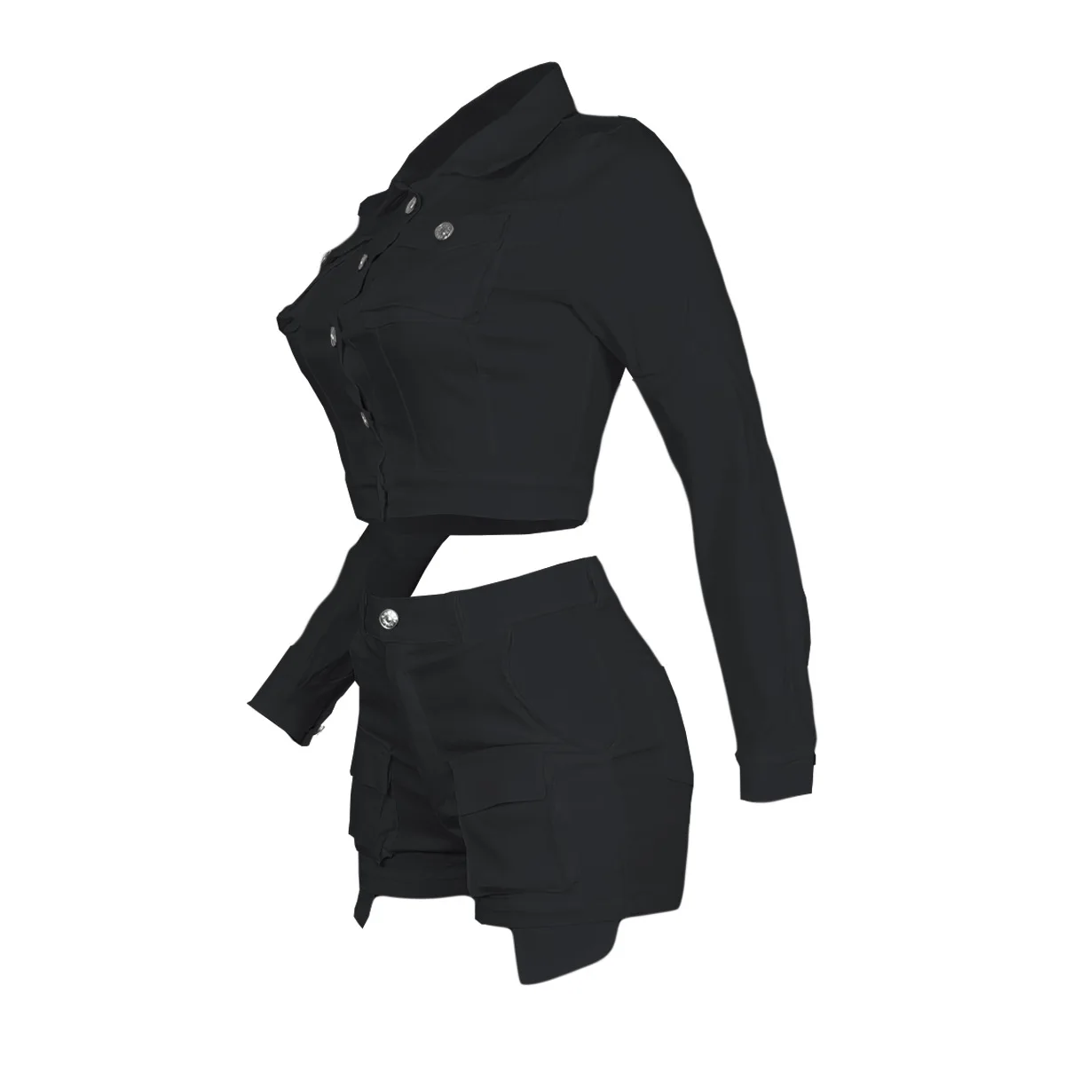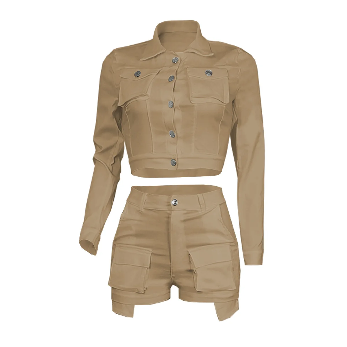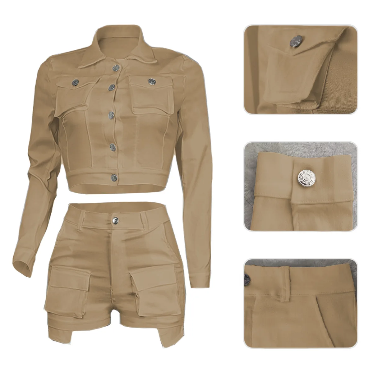 CM.YAYA Fashion Women’s Set Long Sleeve Cargo Shirt and Pocket Shorts 2023 Summer Safari Style Two 2 Piece Set Outfits Tracksuit