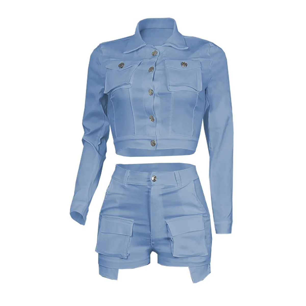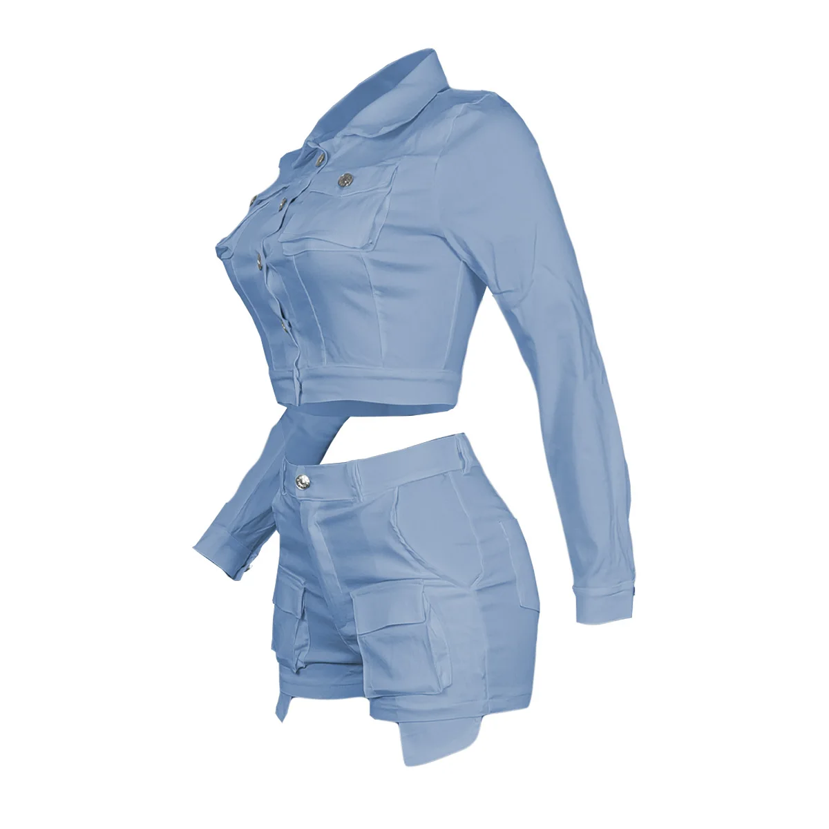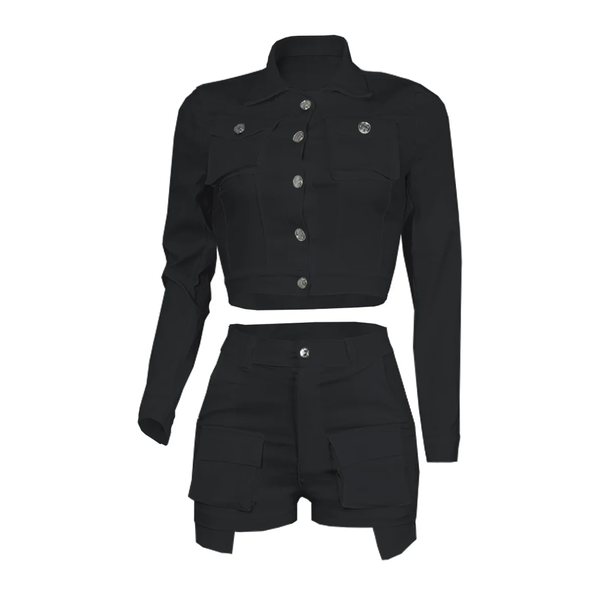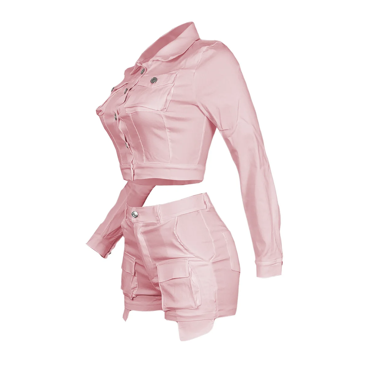 CM.YAYA Fashion Women’s Set Long Sleeve Cargo Shirt and Pocket Shorts 2023 Summer Safari Style Two 2 Piece Set Outfits Tracksuit