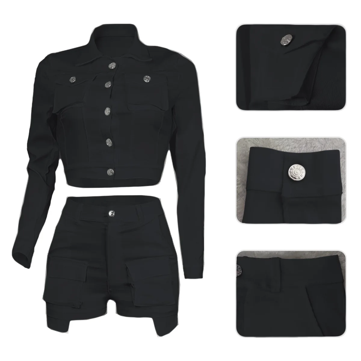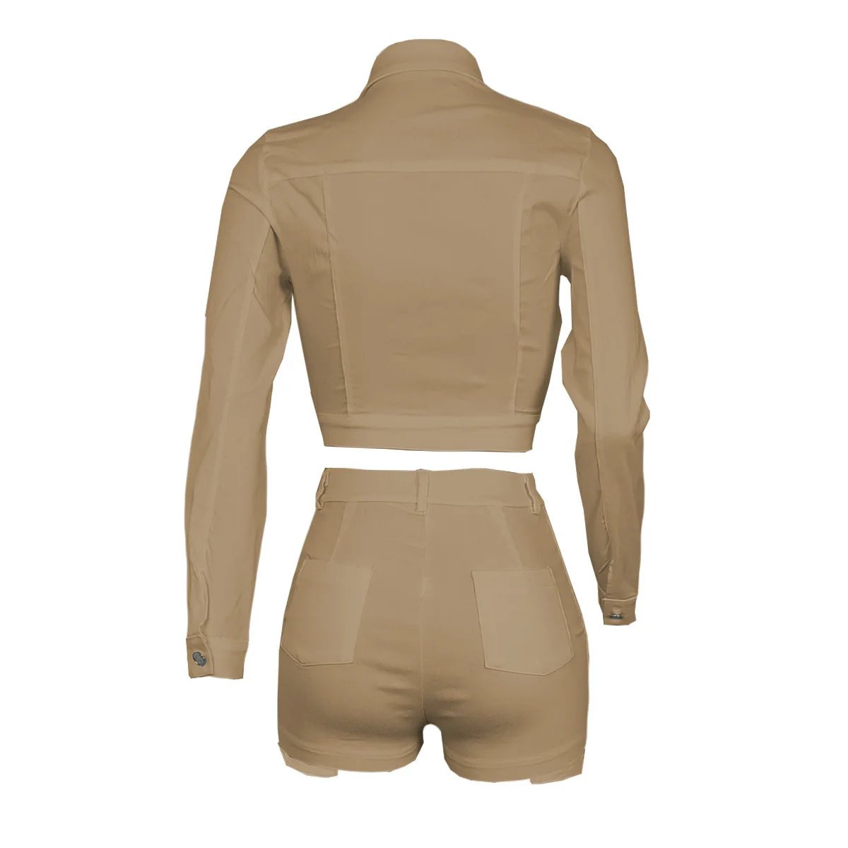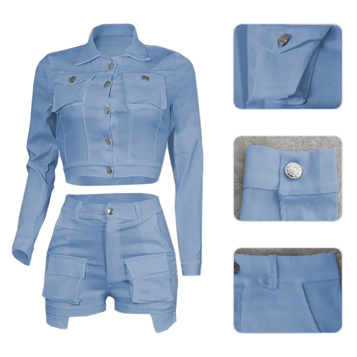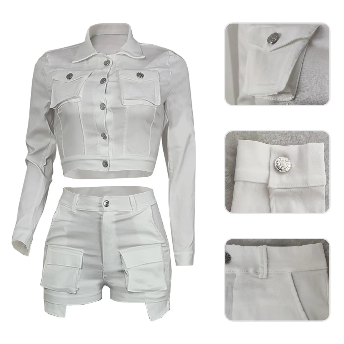 CM.YAYA Fashion Women’s Set Long Sleeve Cargo Shirt and Pocket Shorts 2023 Summer Safari Style Two 2 Piece Set Outfits Tracksuit