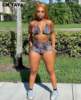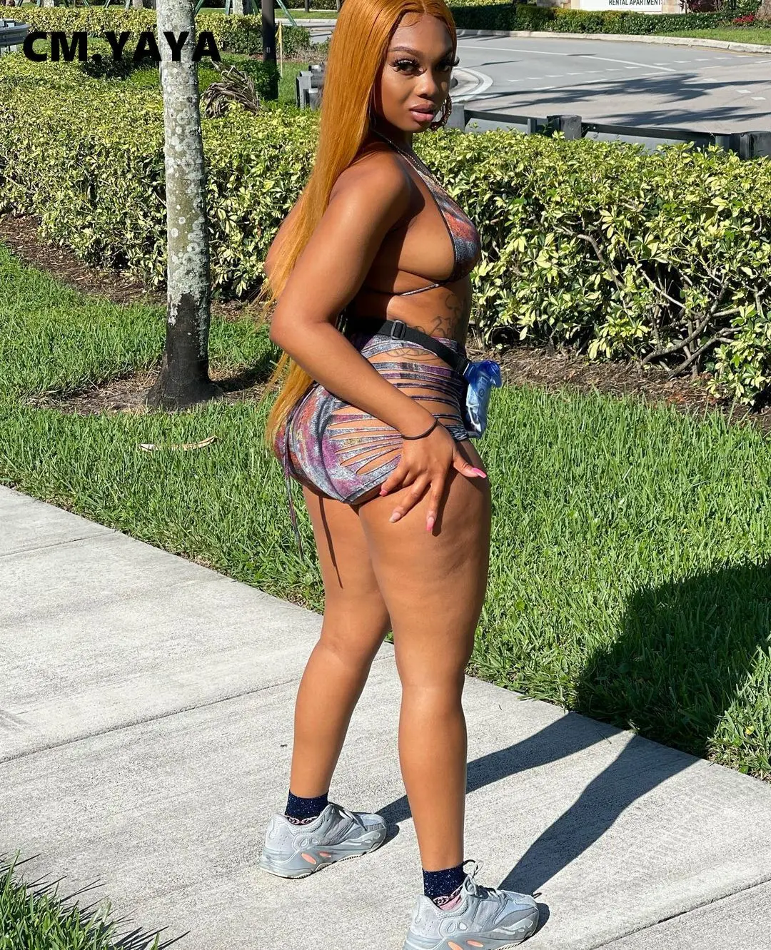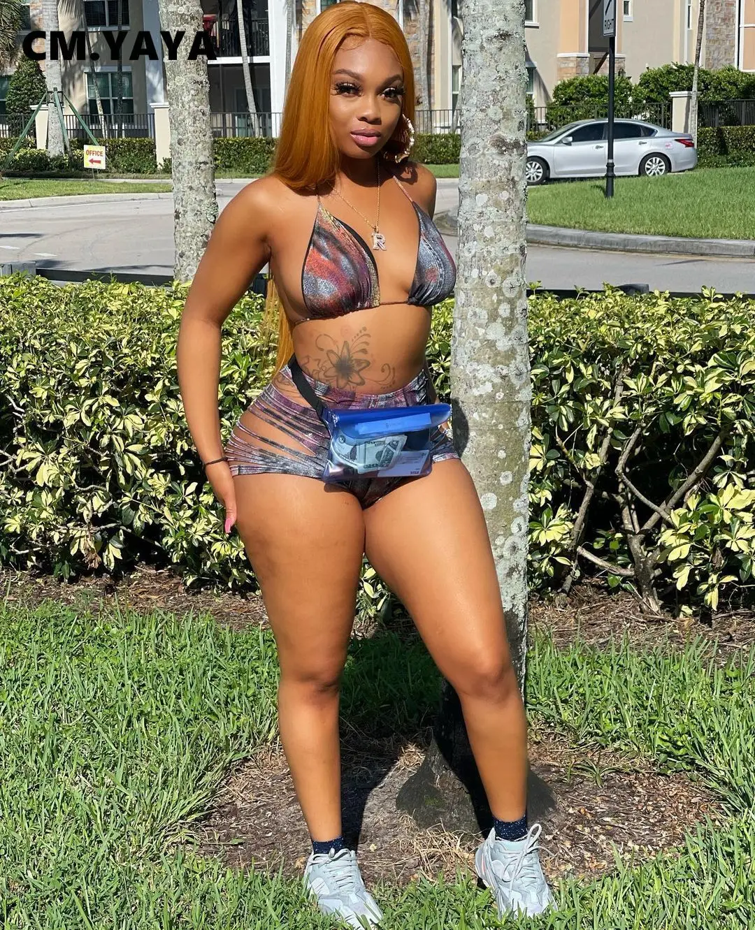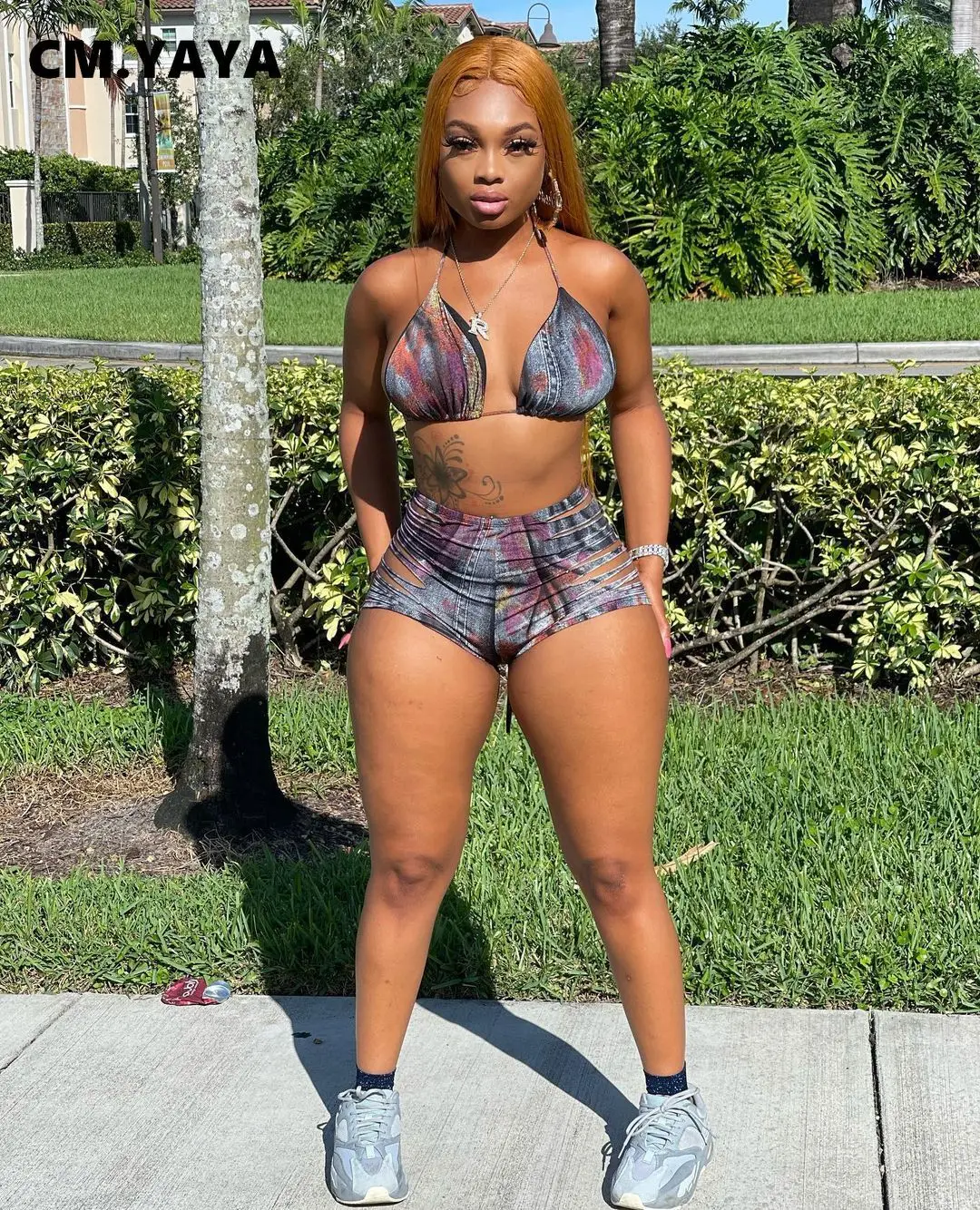 CM.YAYA Faux Jean Printed Cut Cut Hole Shorts Set for Women 2022 Summer Beach Two 2 Piece Set Outfits Fitness Swimsuit Tracksuit