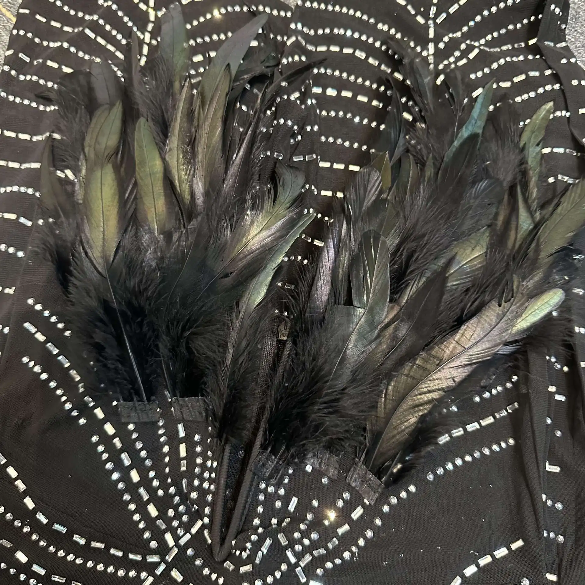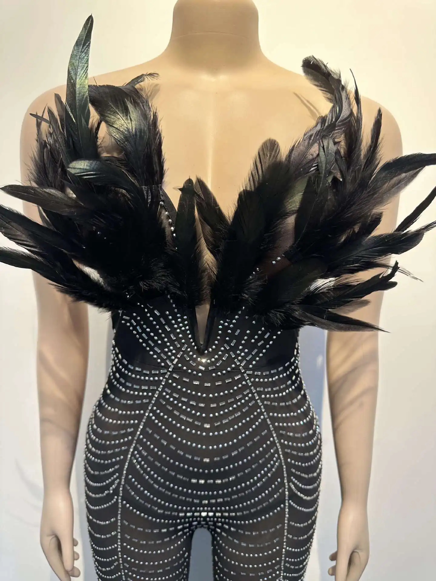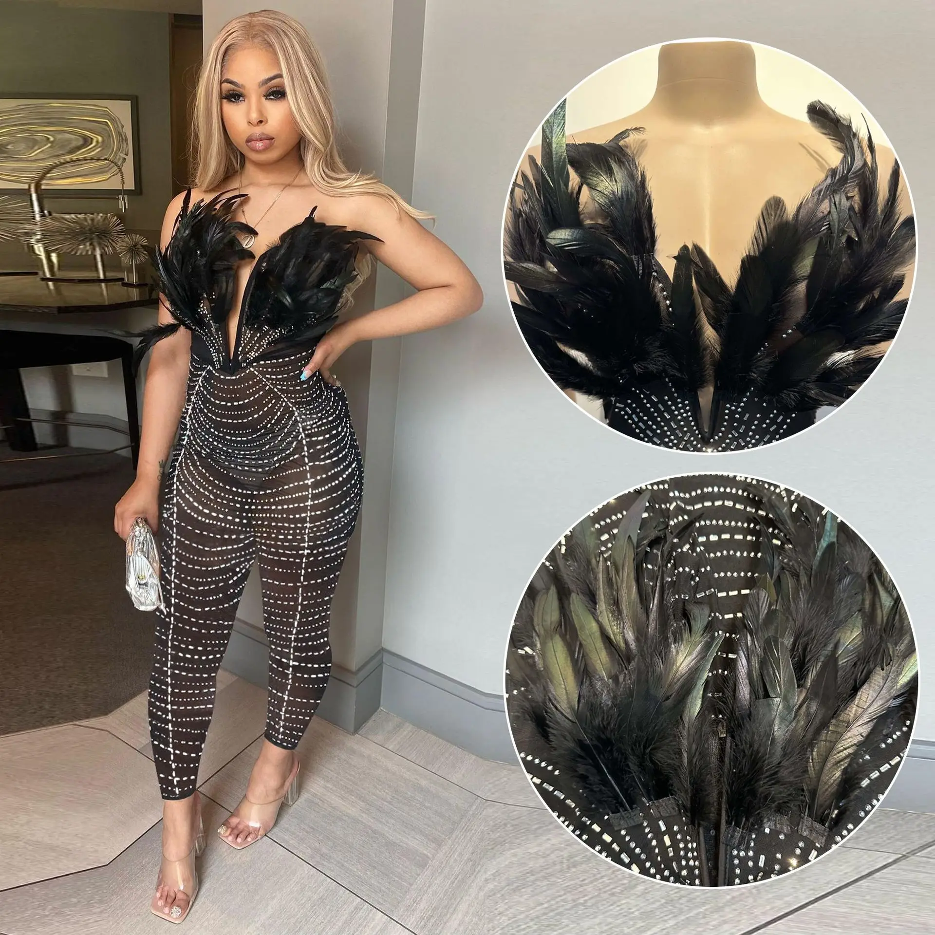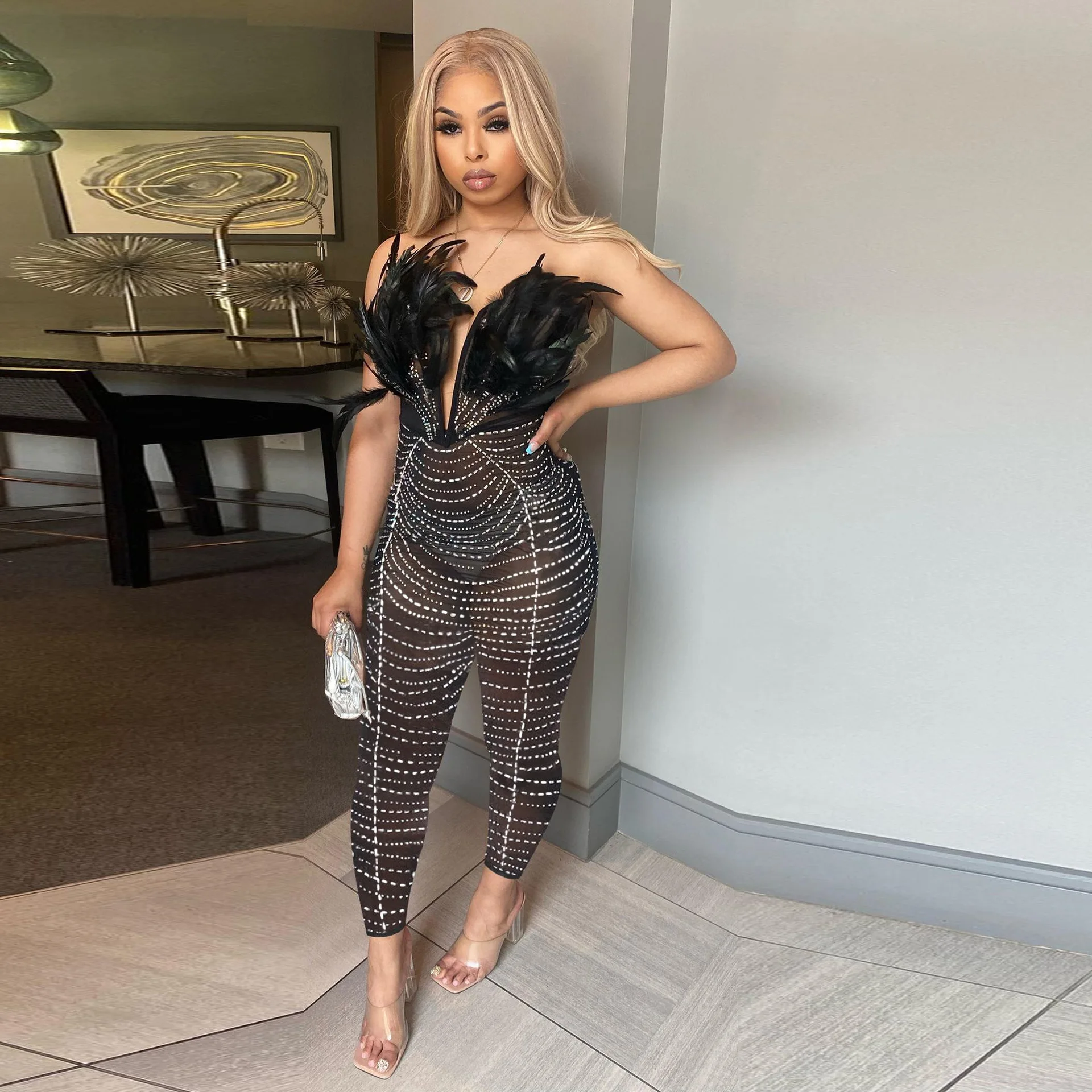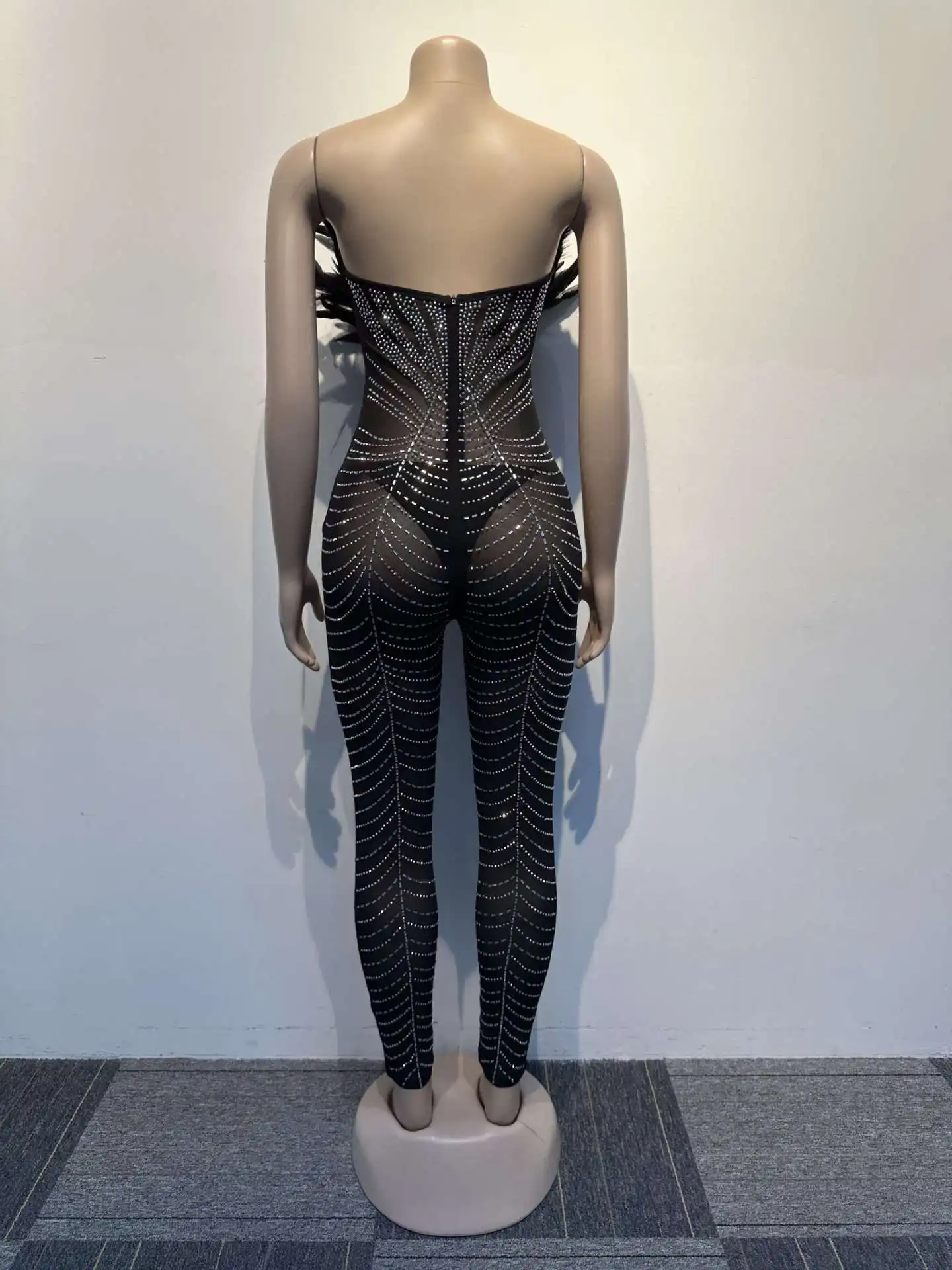 CM.YAYA Feature Plunging V-neck Strapless Women Mesh See Though Diamonds Jumpsuit 2023 Party Club Romper One Piece Set Playsuit