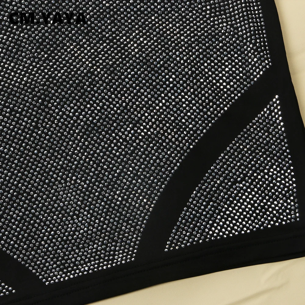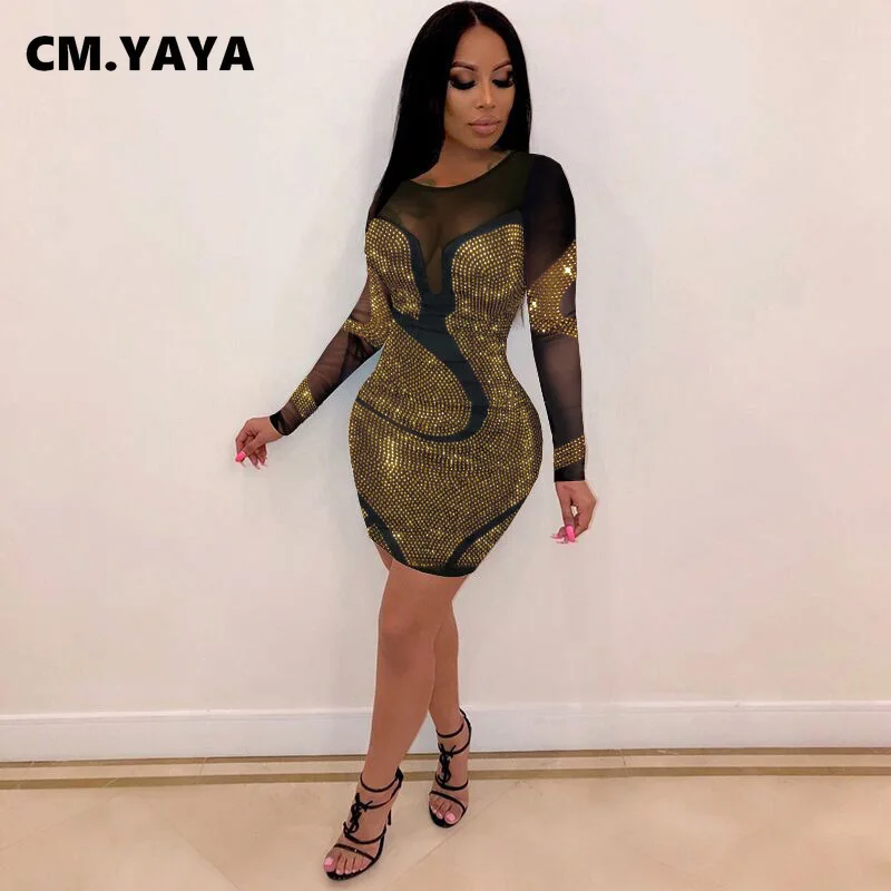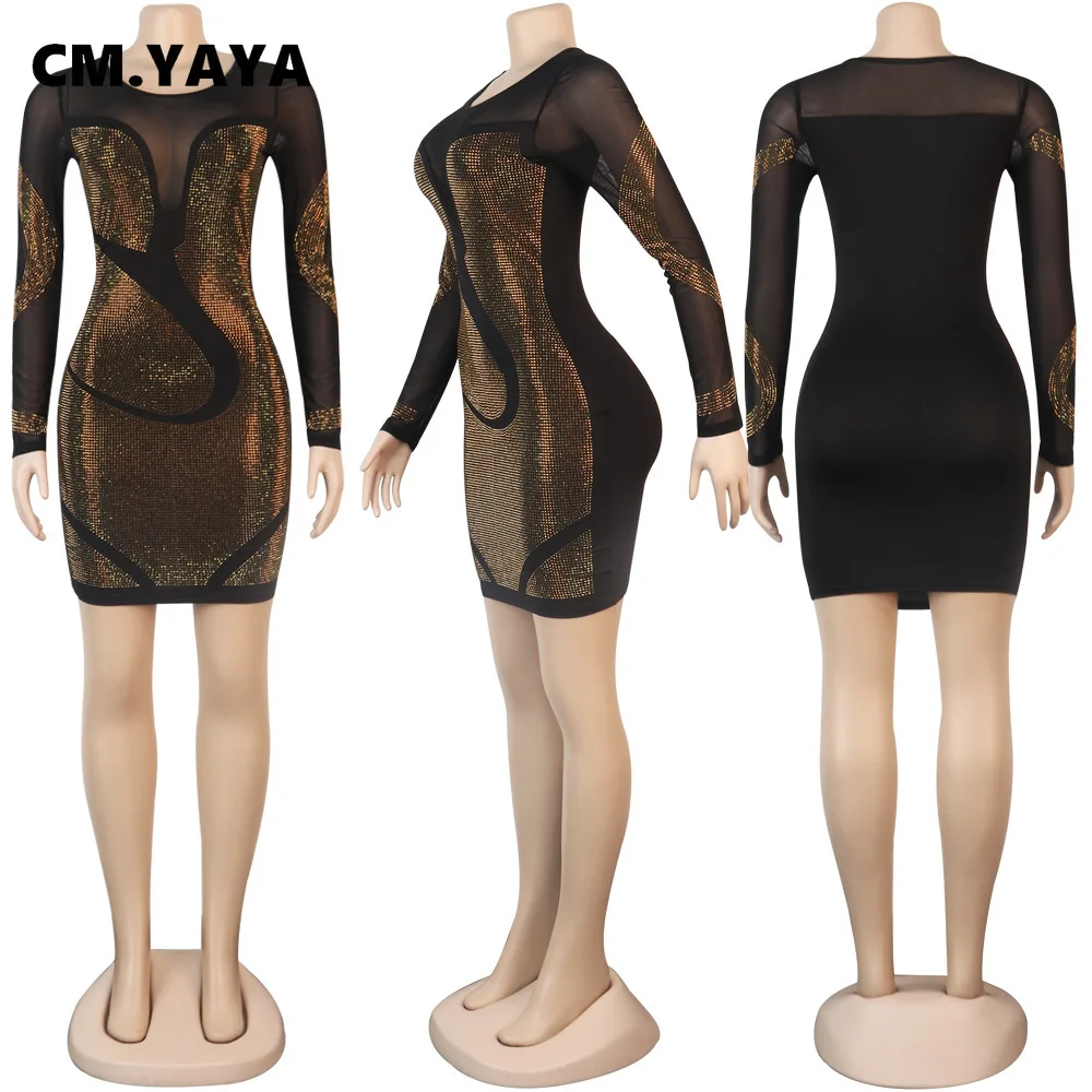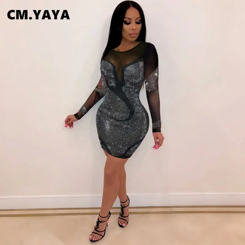 CM.YAYA Hot Rhinestones Mesh Patchwork See Though O-neck Midi Bodycon Dress for Women Sexy Club Party Night Long Sleeve Dresses