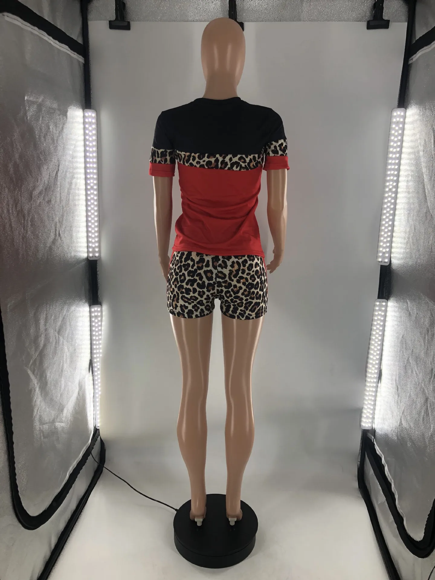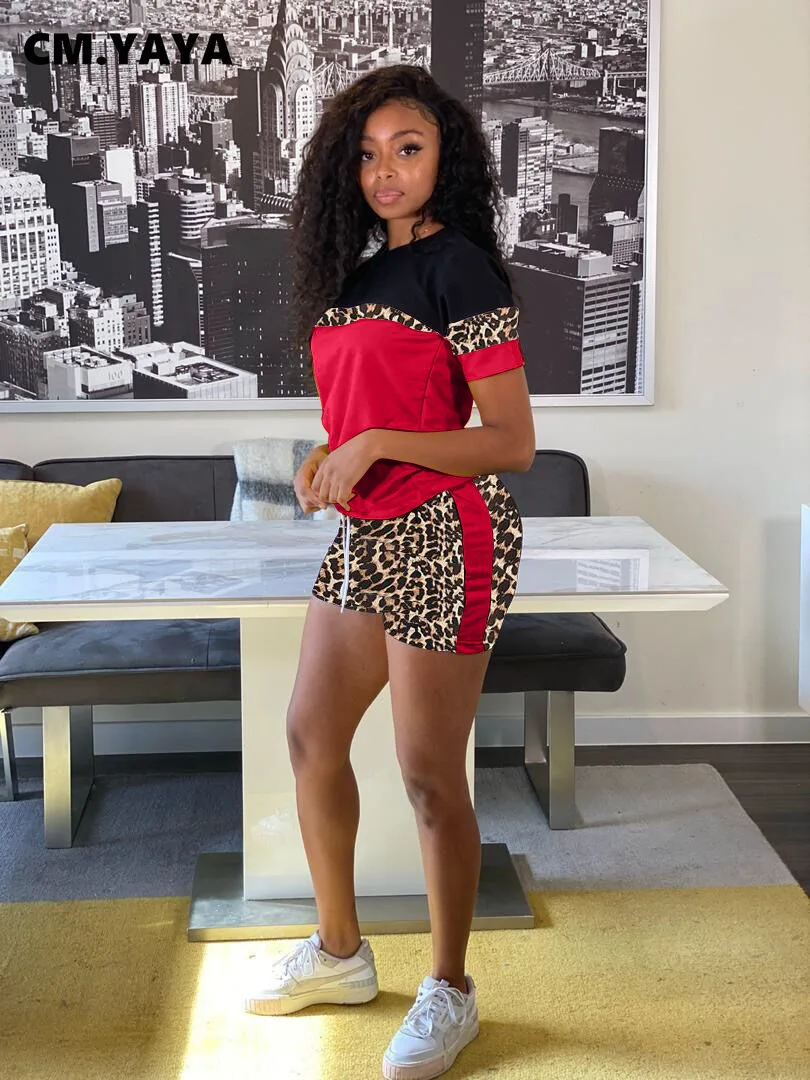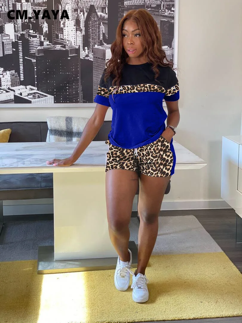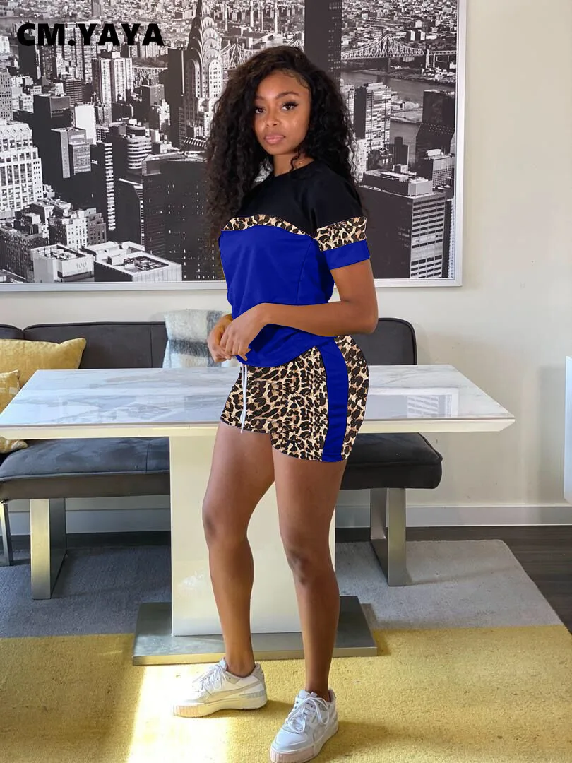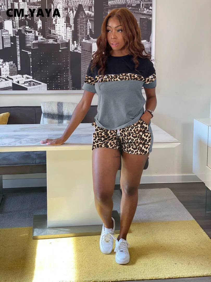 CM.YAYA Leopard Patchwork Women’s Set Sport Basic T-shirt and Shorts Matching Two 2 Piece Outfits Active Tracksuit Sweatsuit