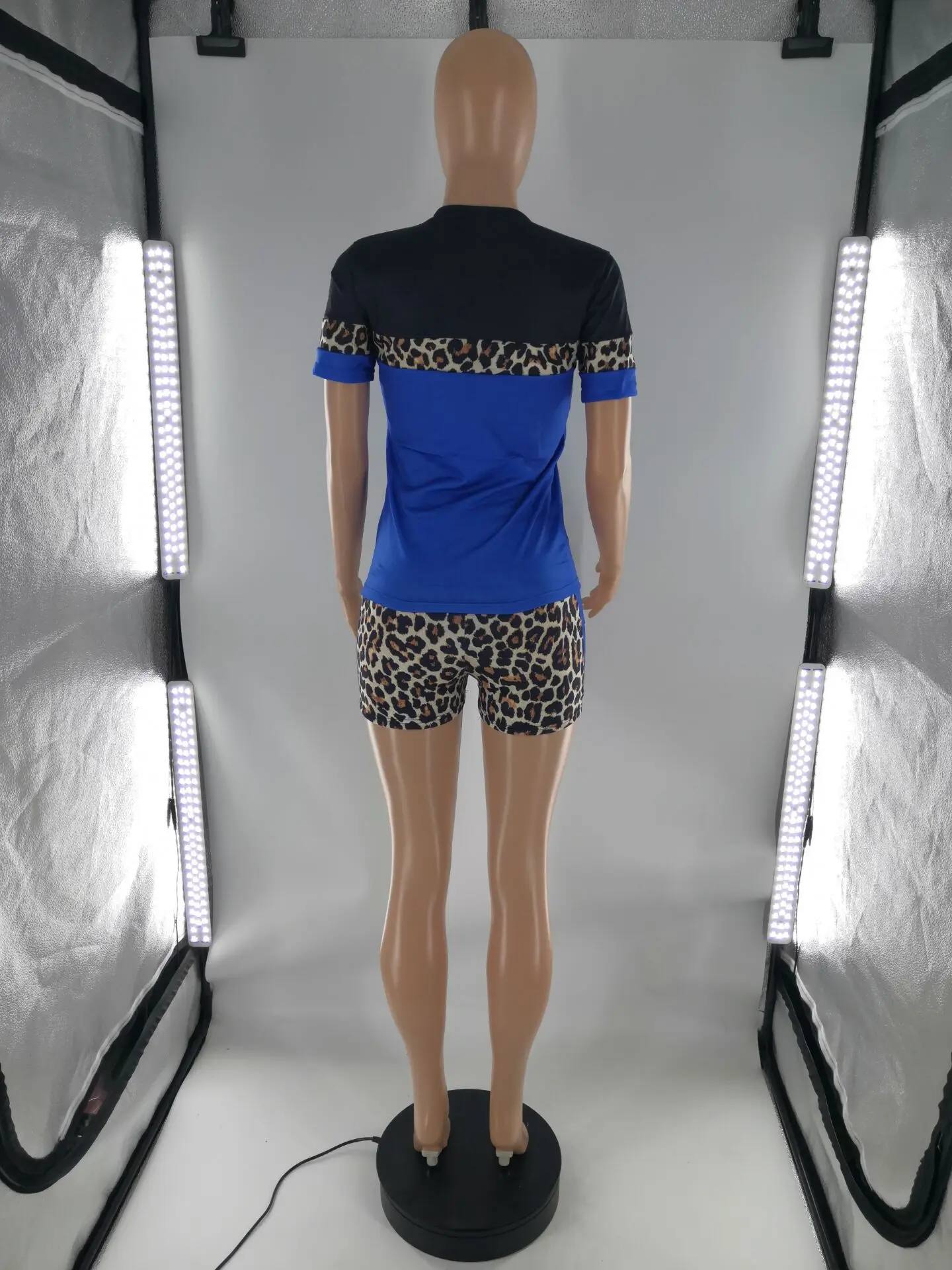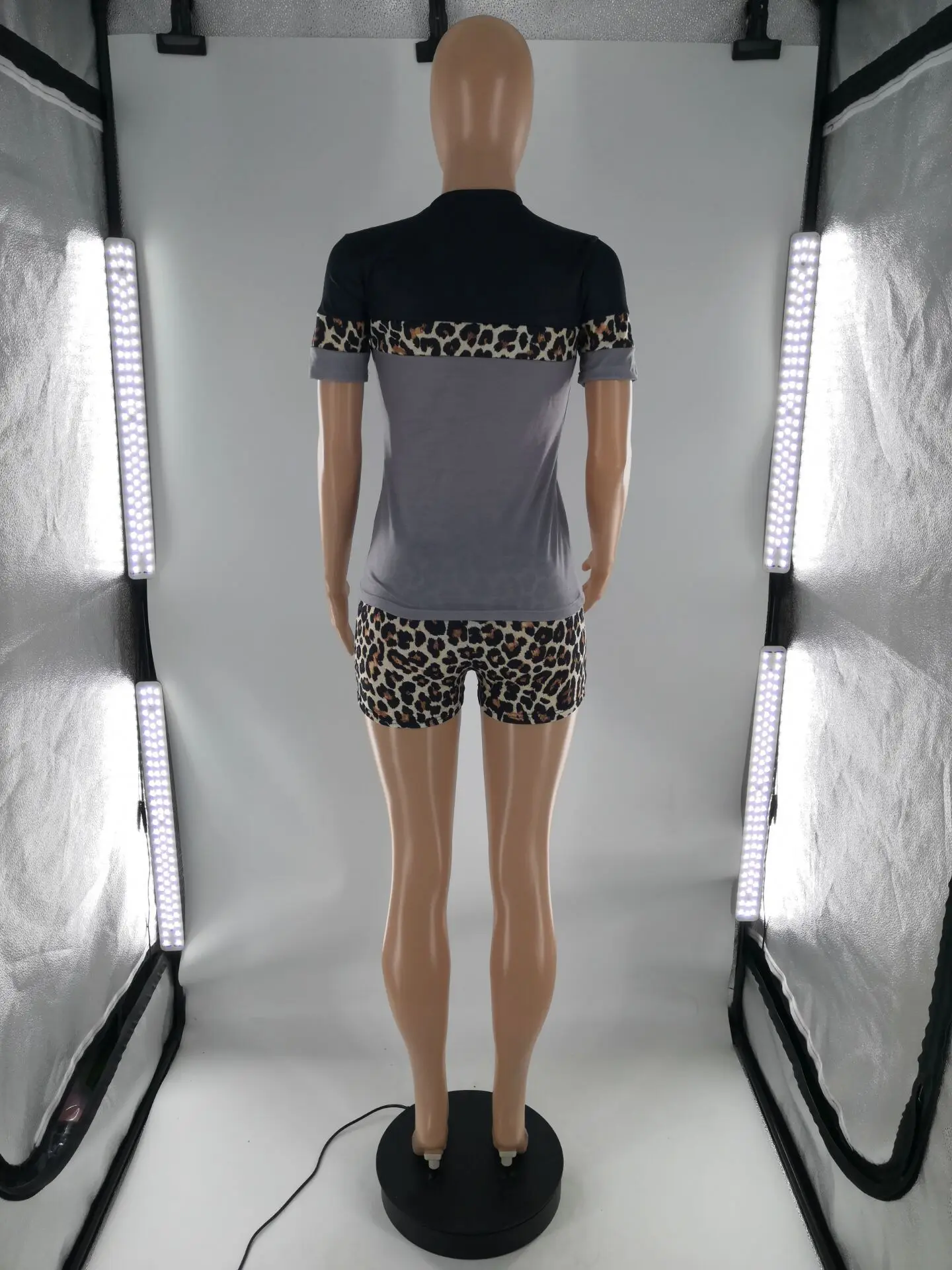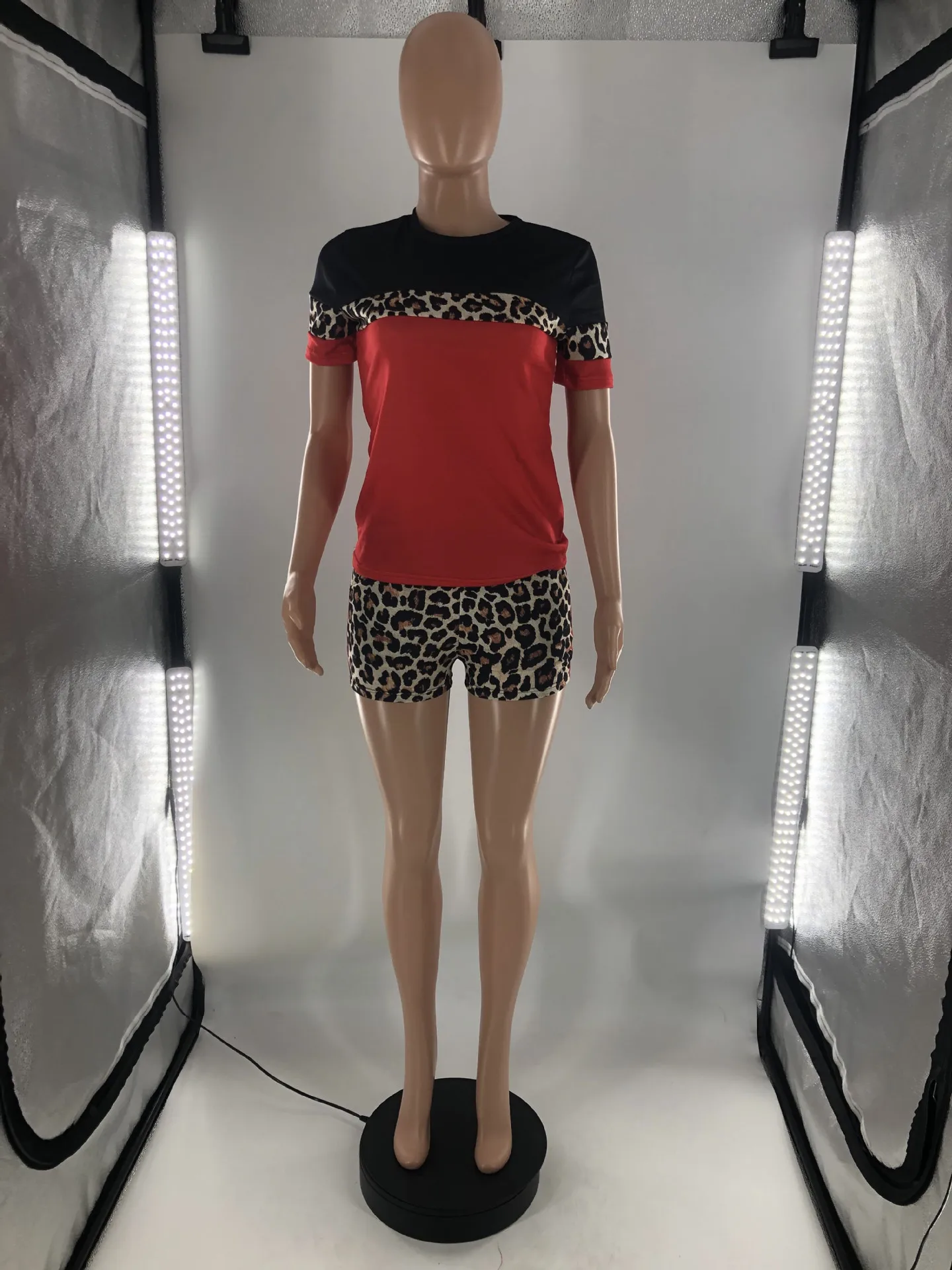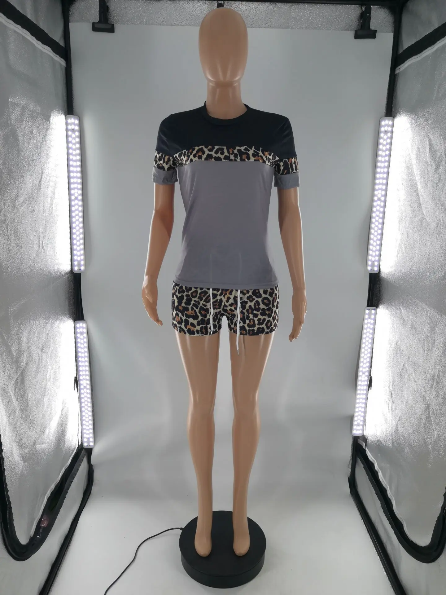 CM.YAYA Leopard Patchwork Women’s Set Sport Basic T-shirt and Shorts Matching Two 2 Piece Outfits Active Tracksuit Sweatsuit