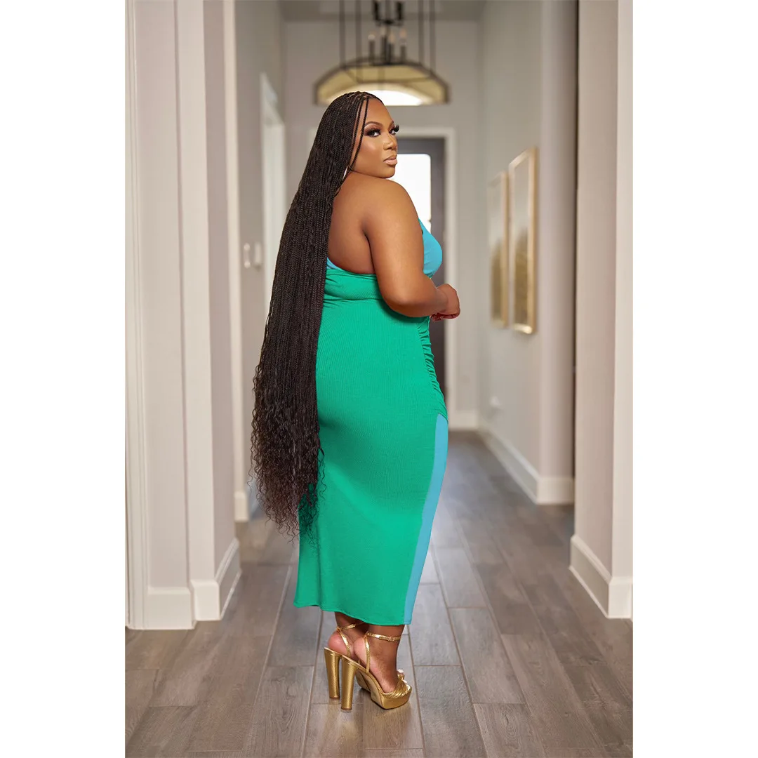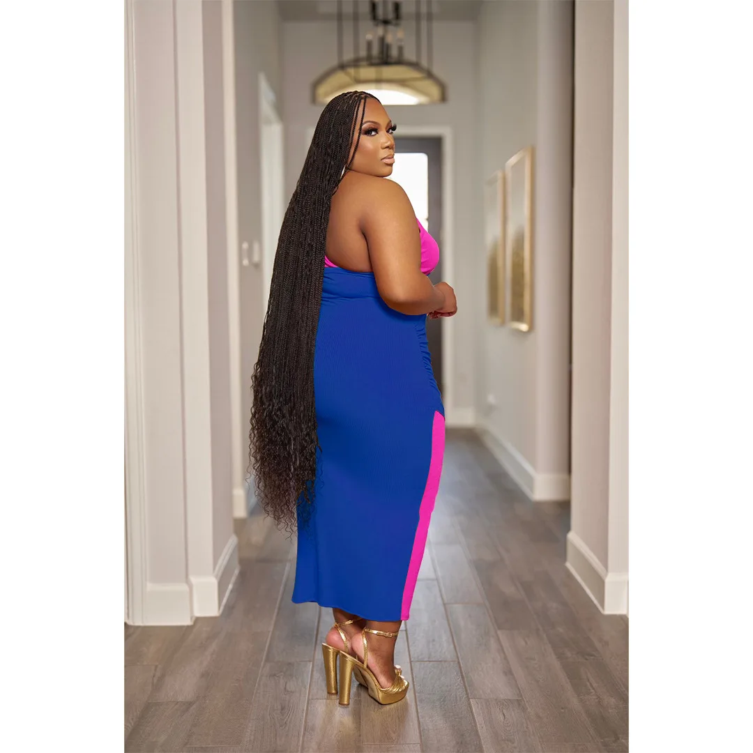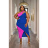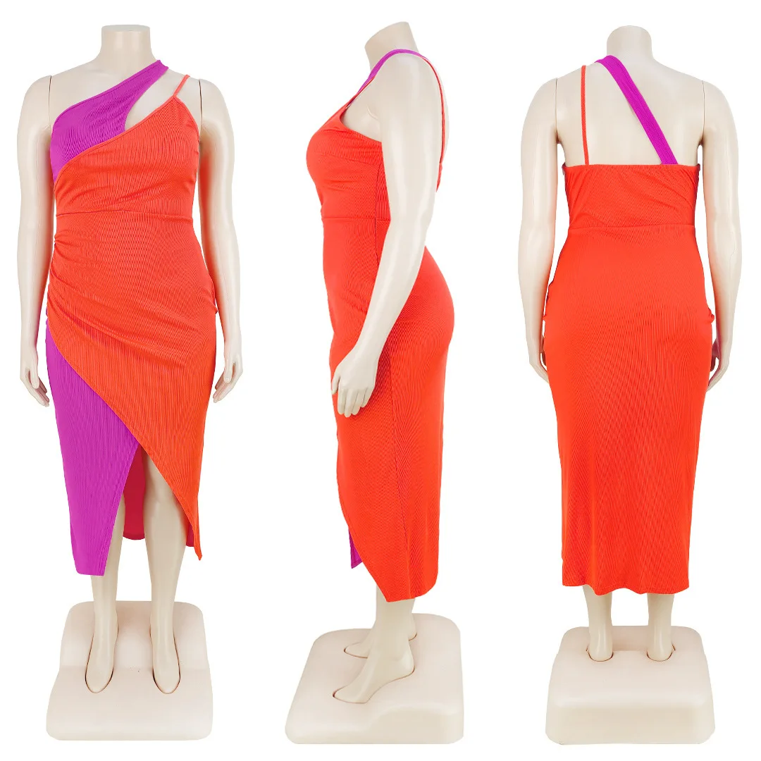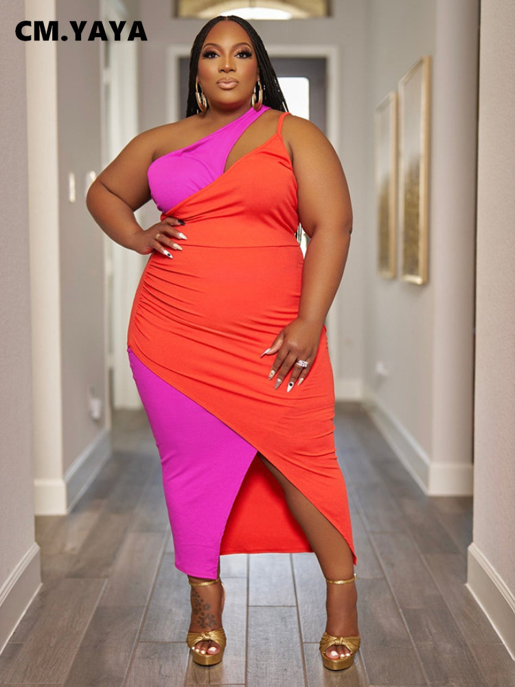 CM.YAYA Plus Size Women Patchwork One Shoulder Split Wrap Hem Sleeveless Midi Bodycon Maxi Long Dress 2023 Party Evening Dresses