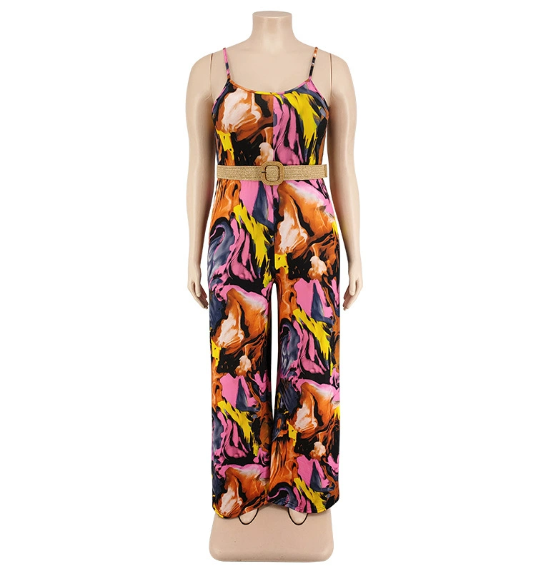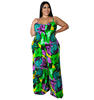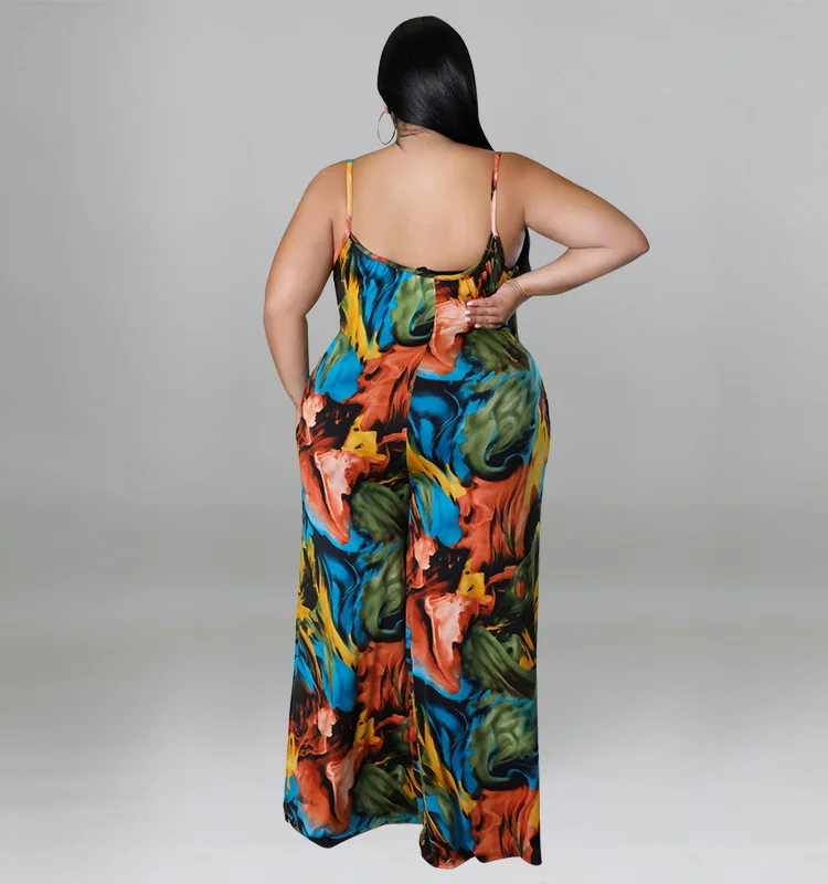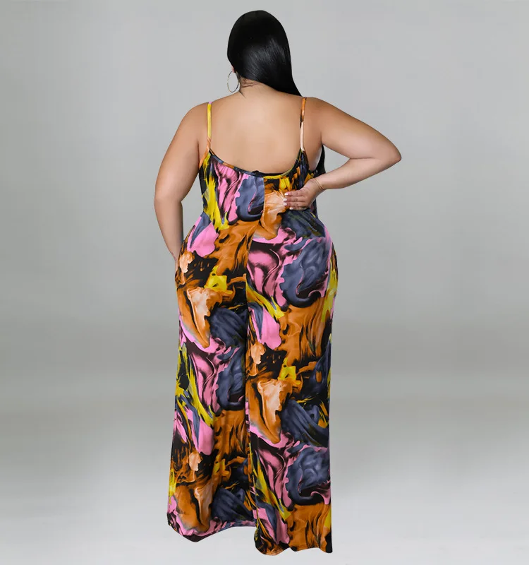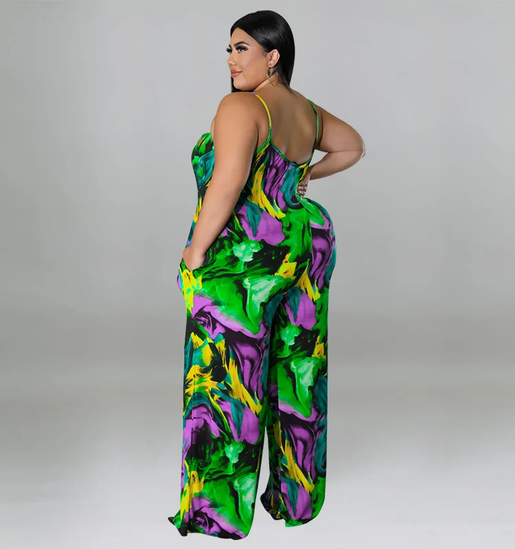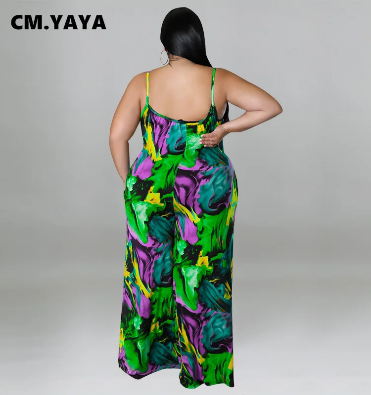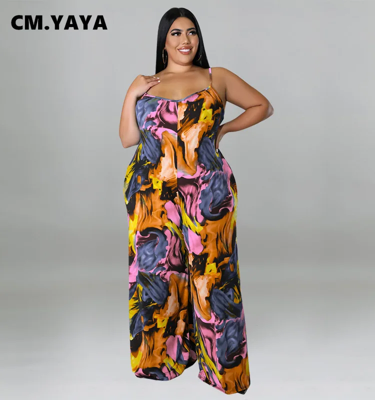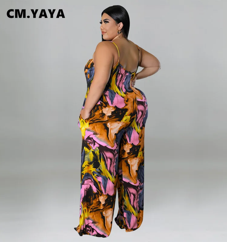 CM.YAYA Plus Size Women Tie Dye Wave Spaghetti Strap Wide Leg Loose Jumpsuit 2022 Summer Sleeveless Streetwear Retro Playsuit
