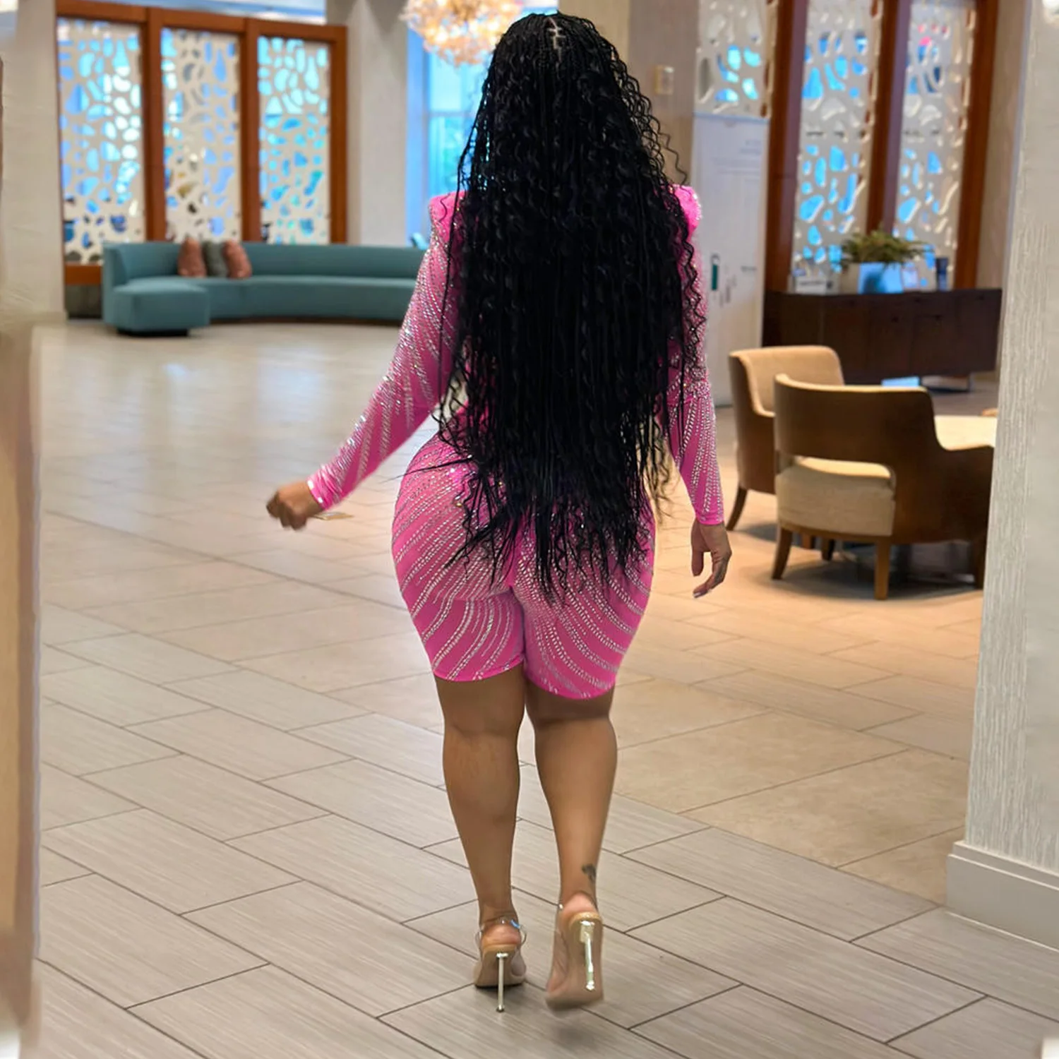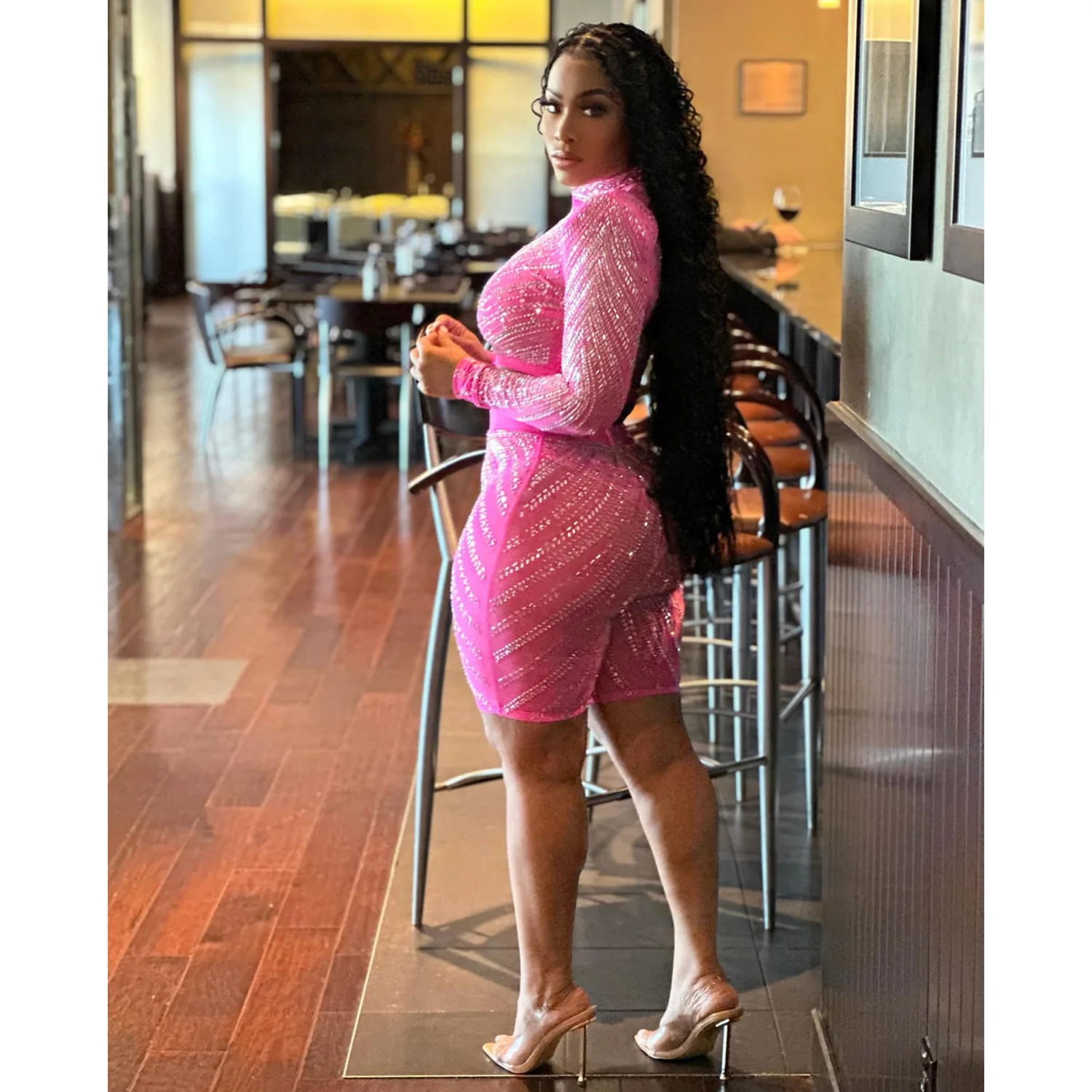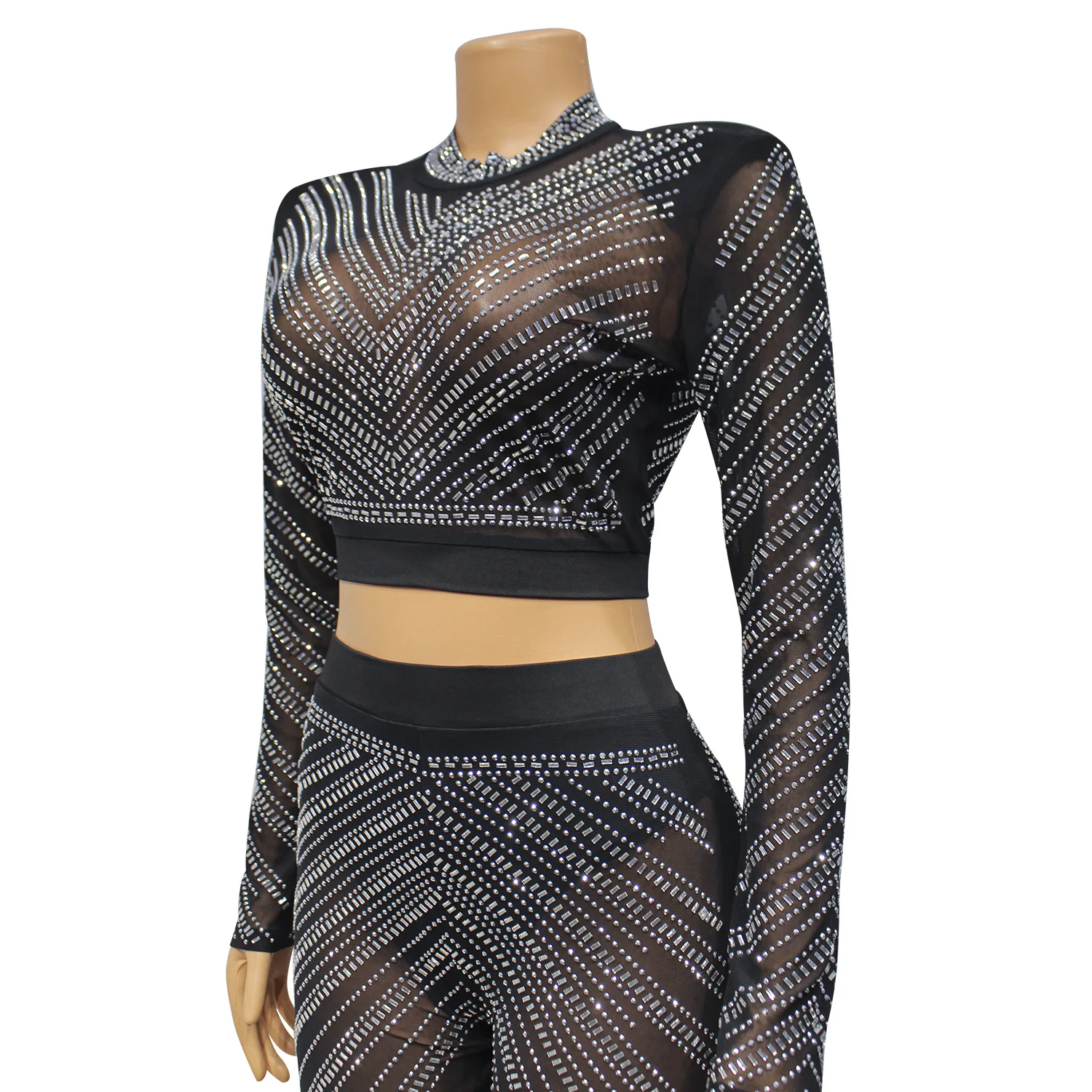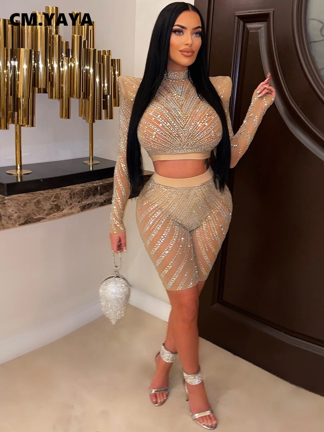 CM.YAYA Sext Party Diamonds Hot Rhinestones Women’s Set Long Sleeve T-shirt + Knee Length Pants Suit 2023 Two 2 Piece Set Outfit