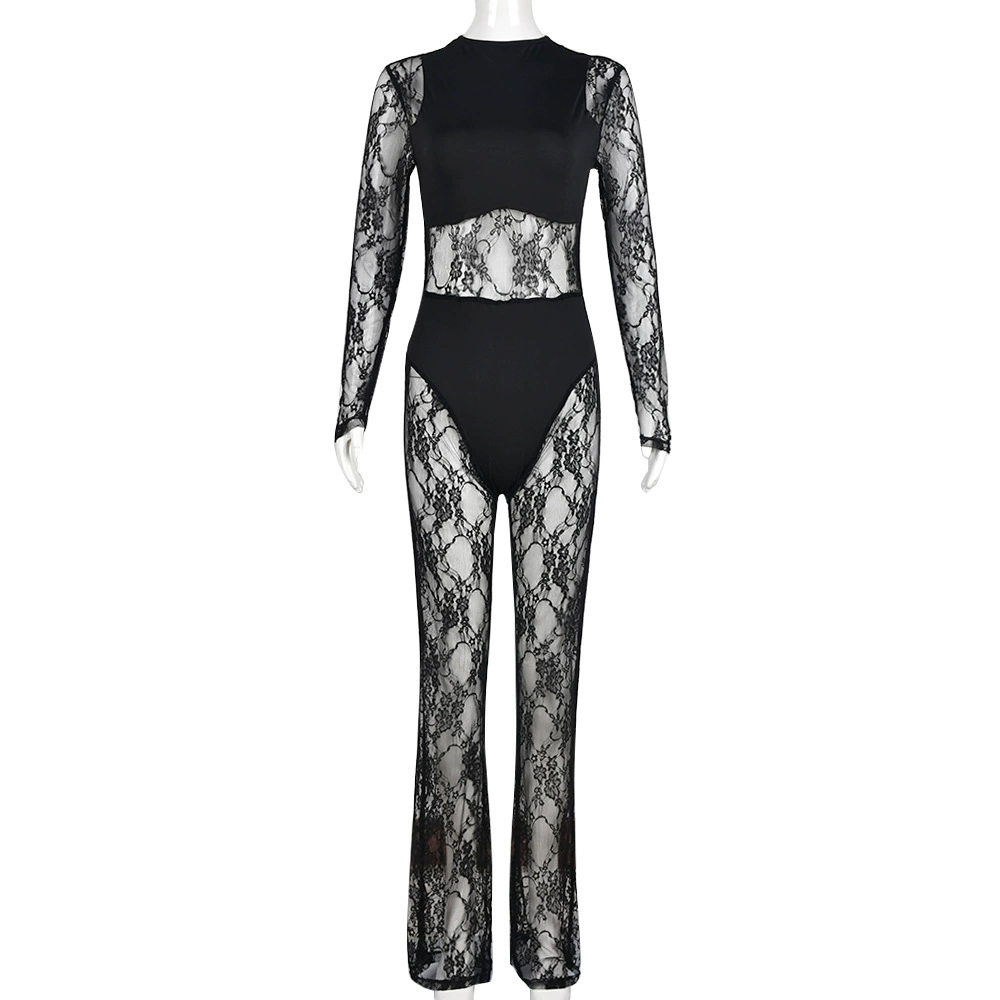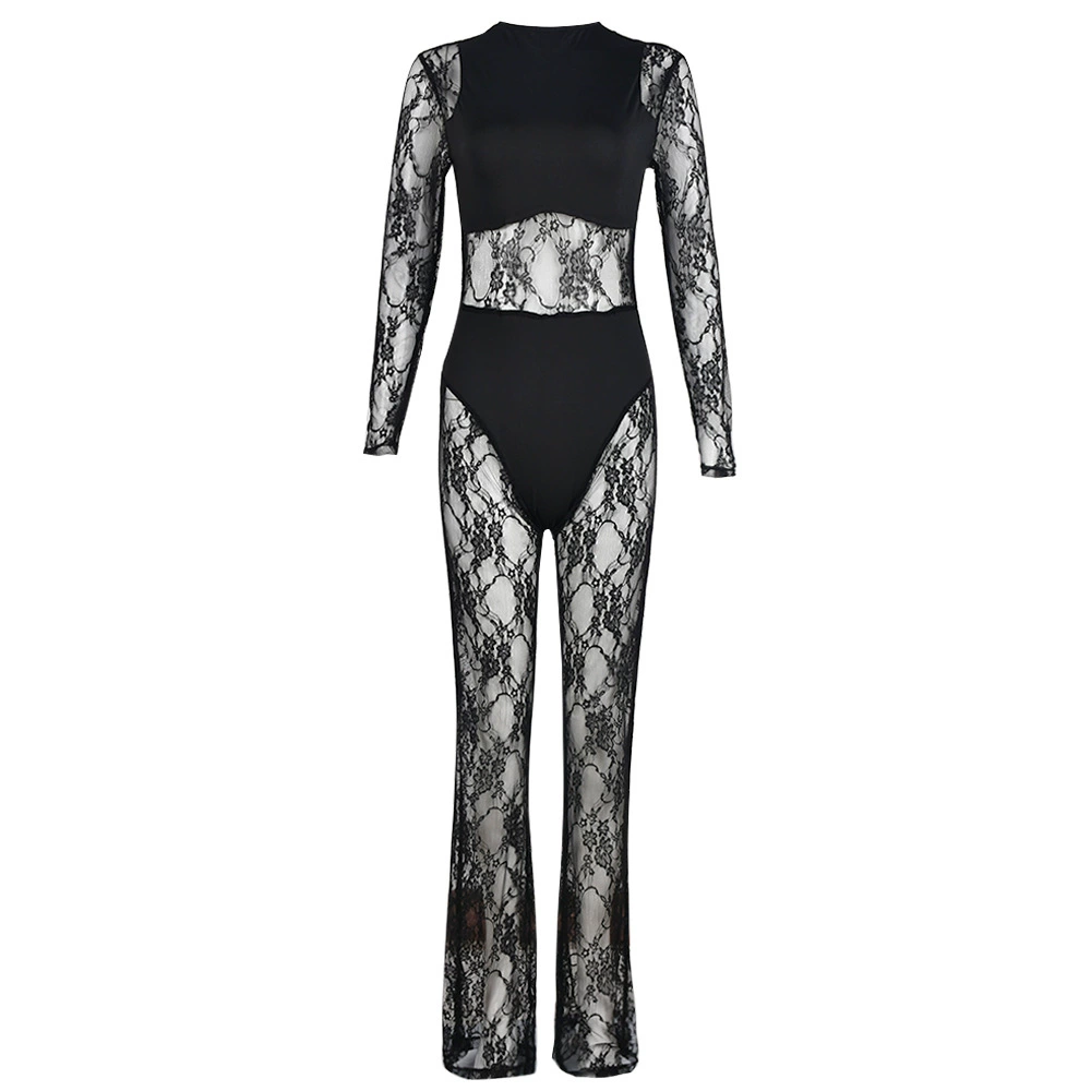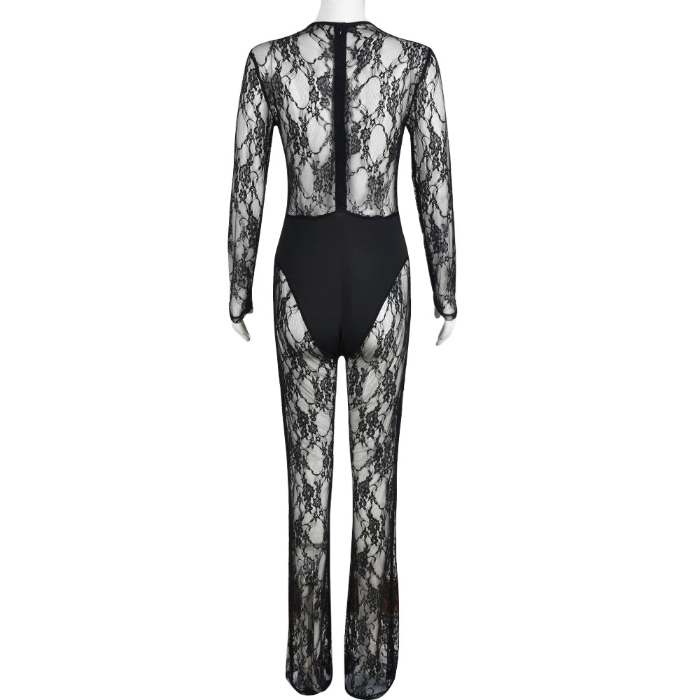 CM.YAYA Sexy O-neck Knitted Women Bodysuit Black Lace See-through Tight Slim Party Nightclub Bodysuits Women Jumpsuit