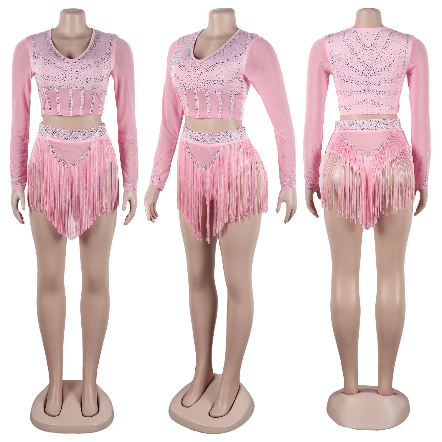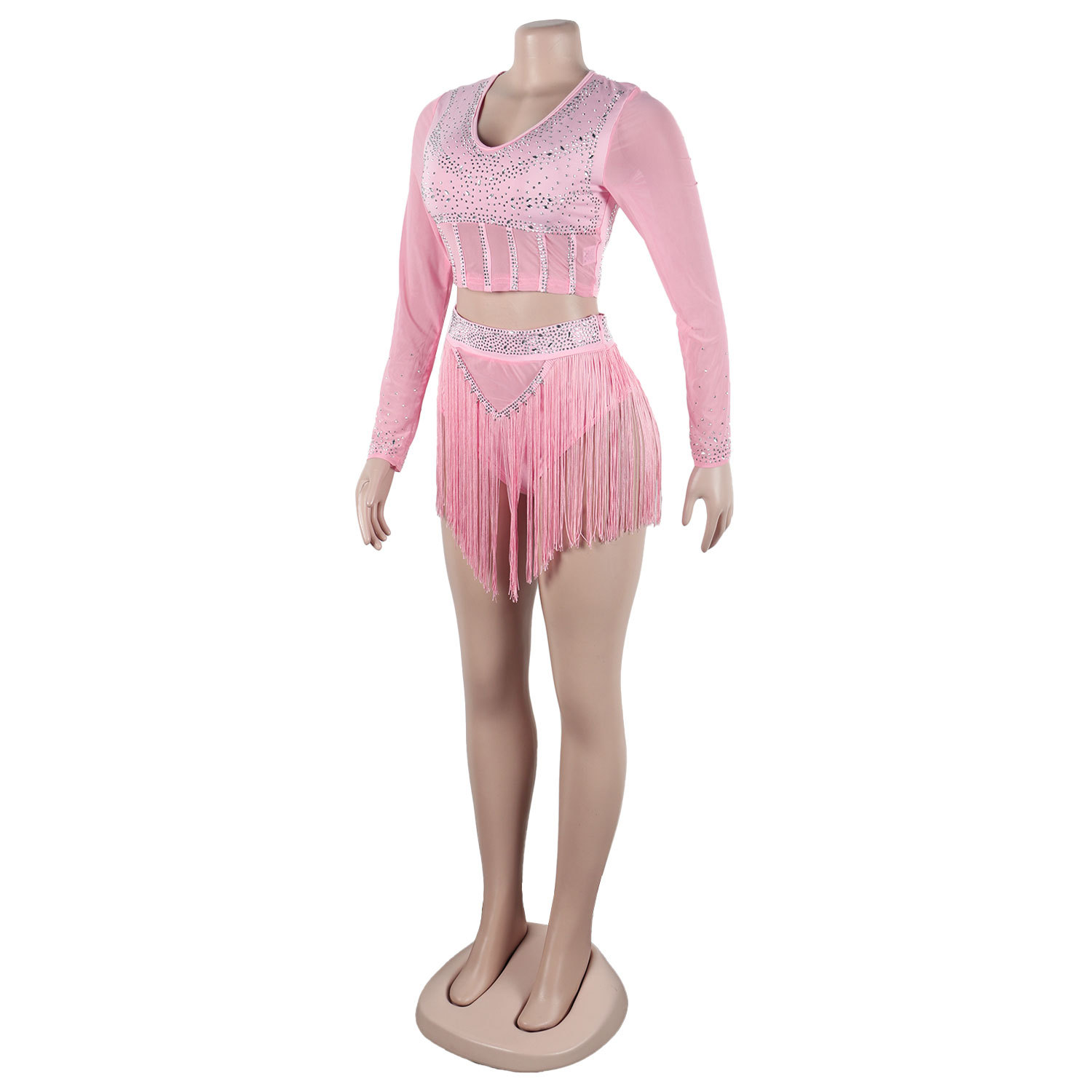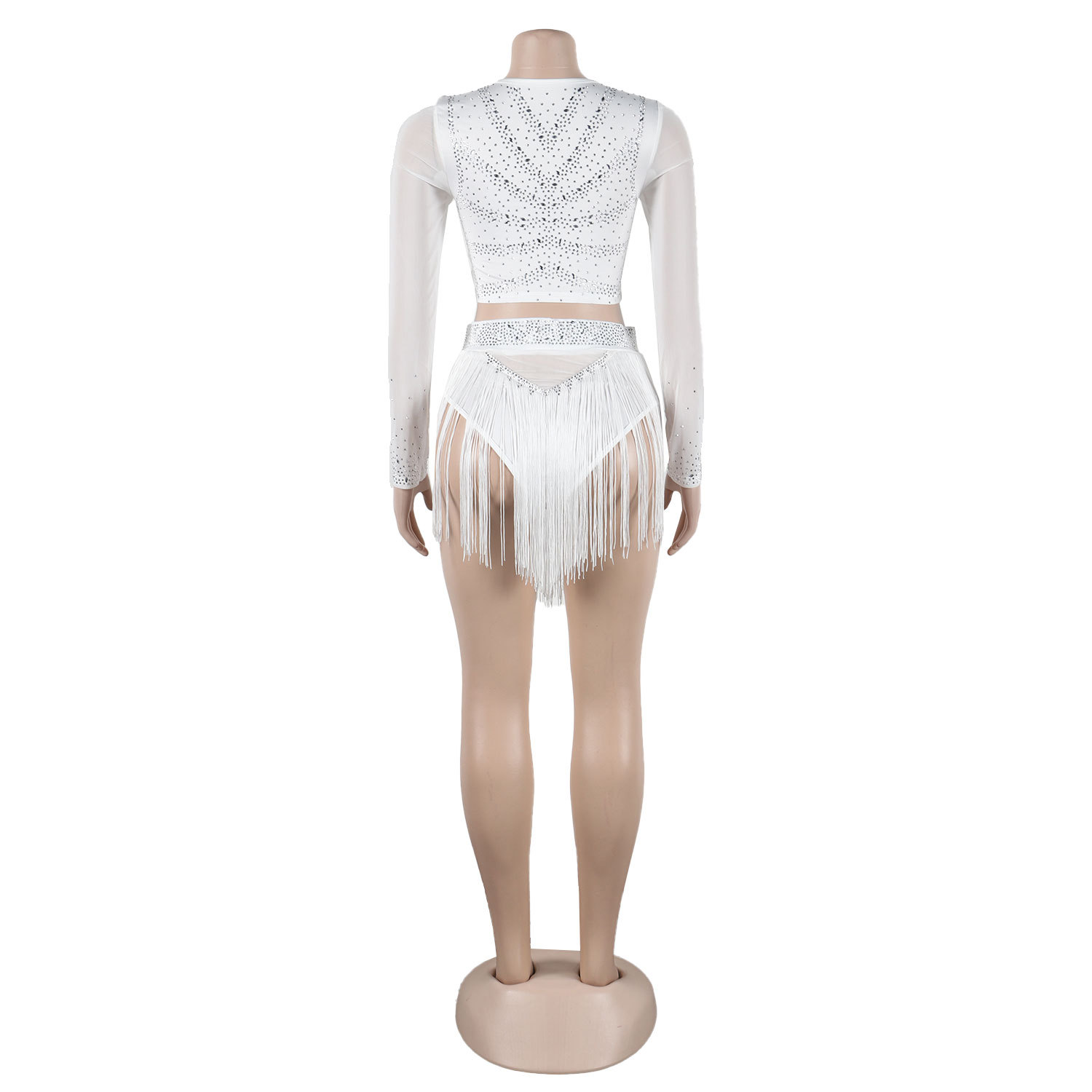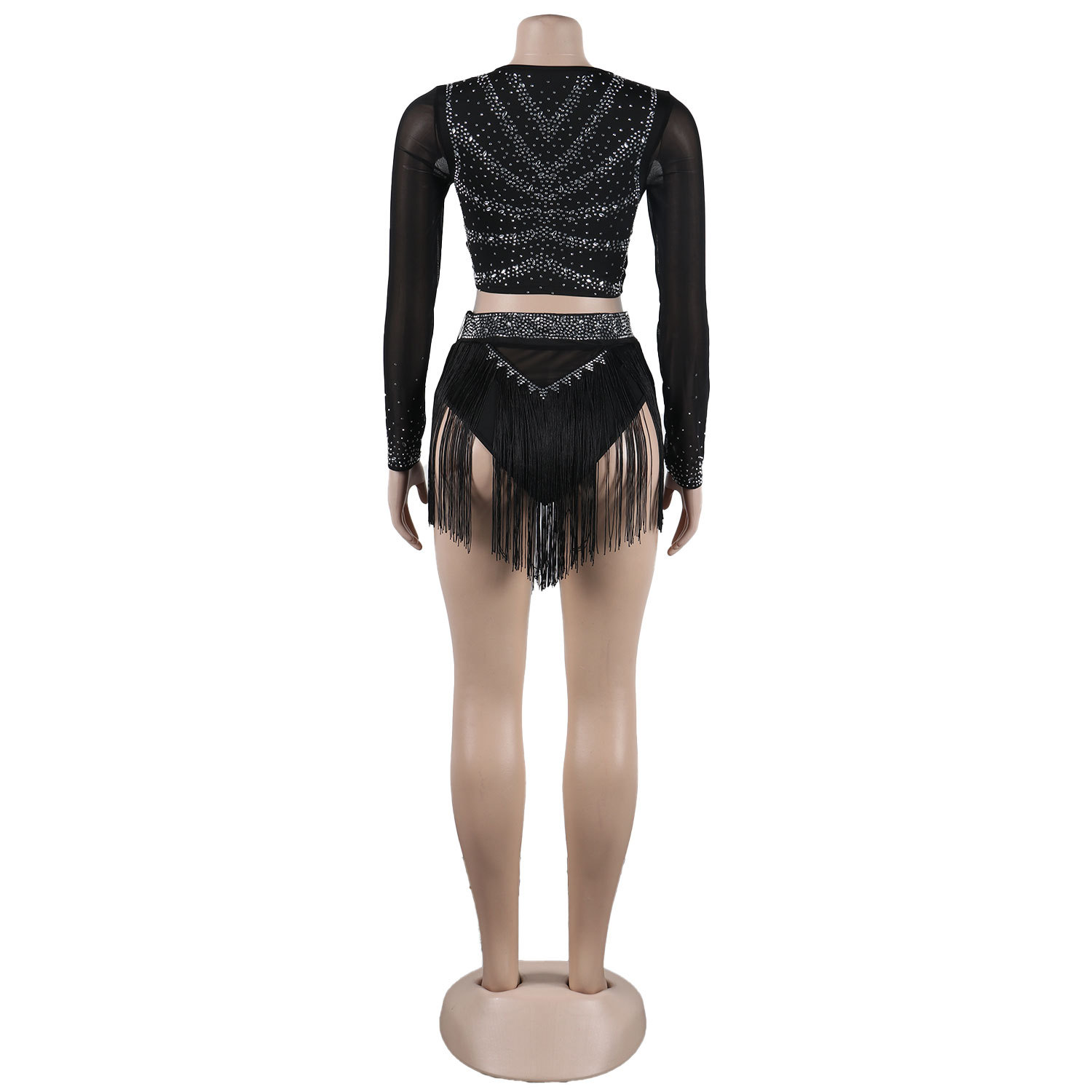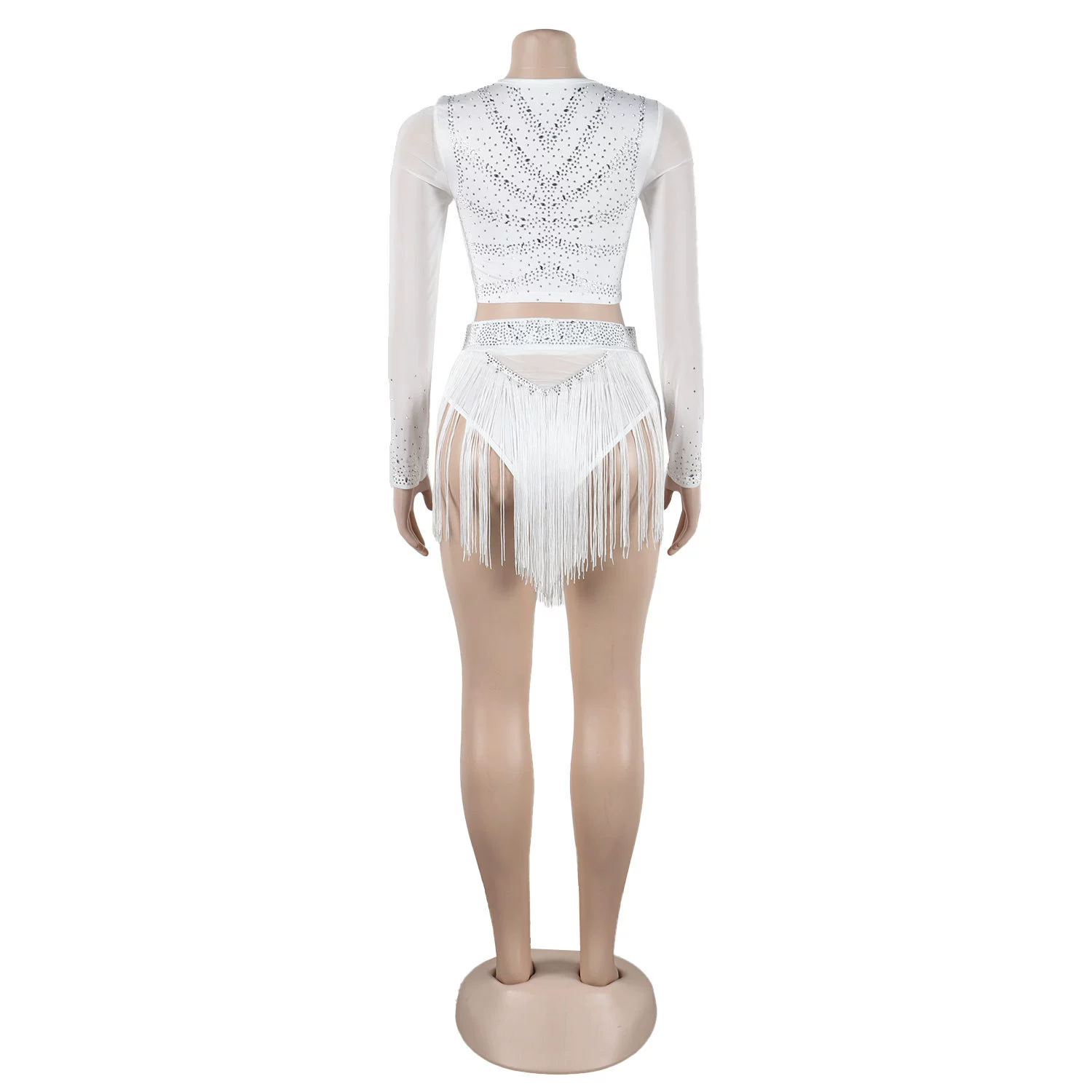 CM.YAYA Sexy Party Women’s Set Mesh Long Sleeve Dimonds Hot Drill Tee Top + Tassel Shortst 2023 Two 2 Piece Set Outfit Tracksuit