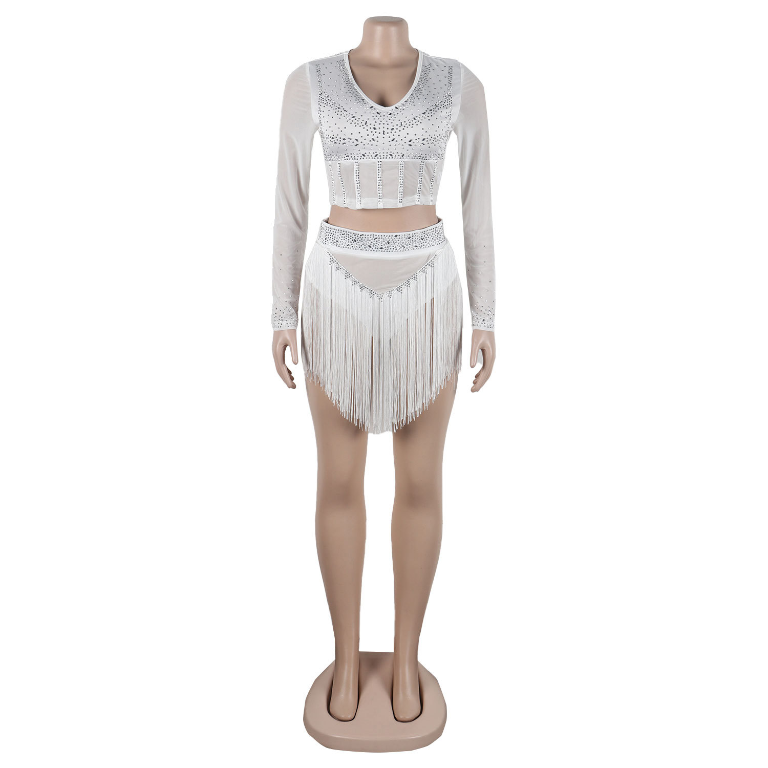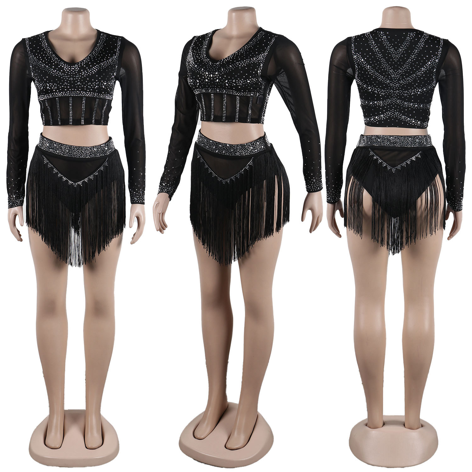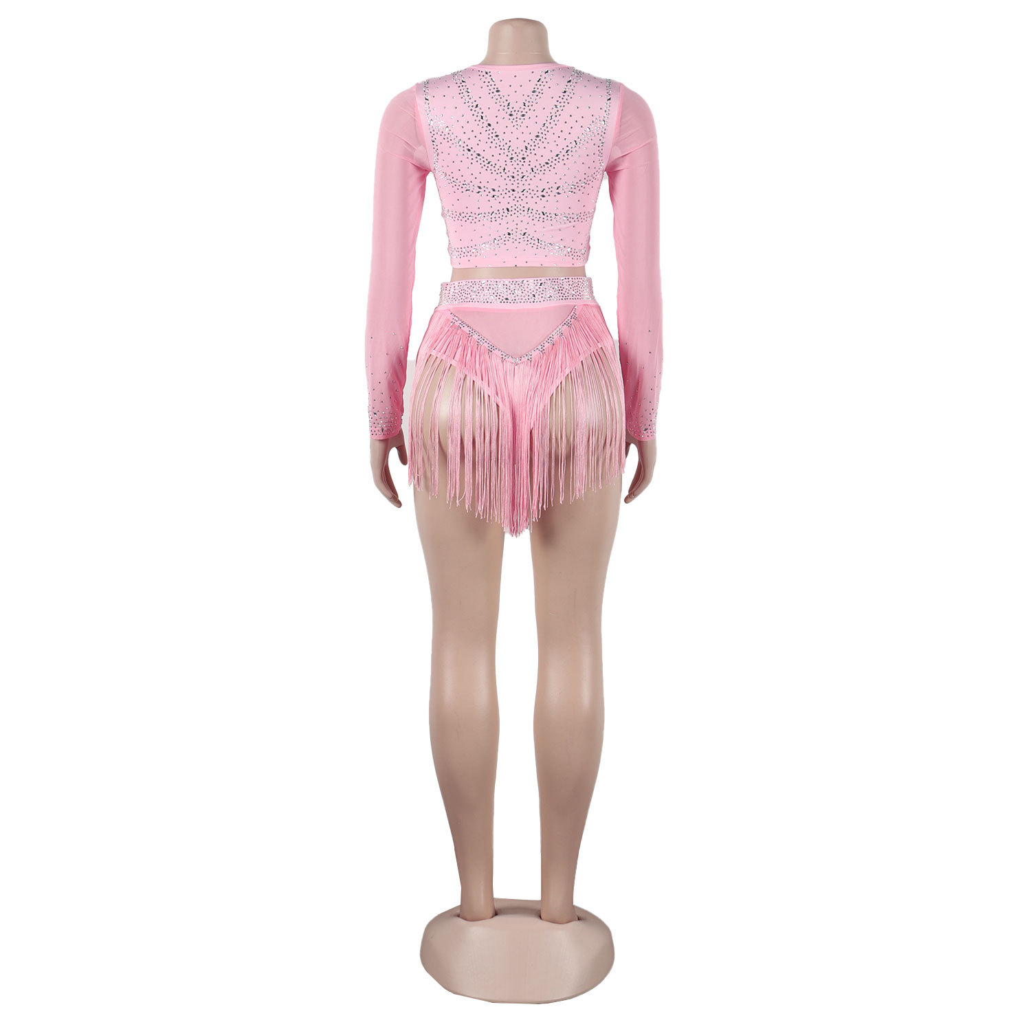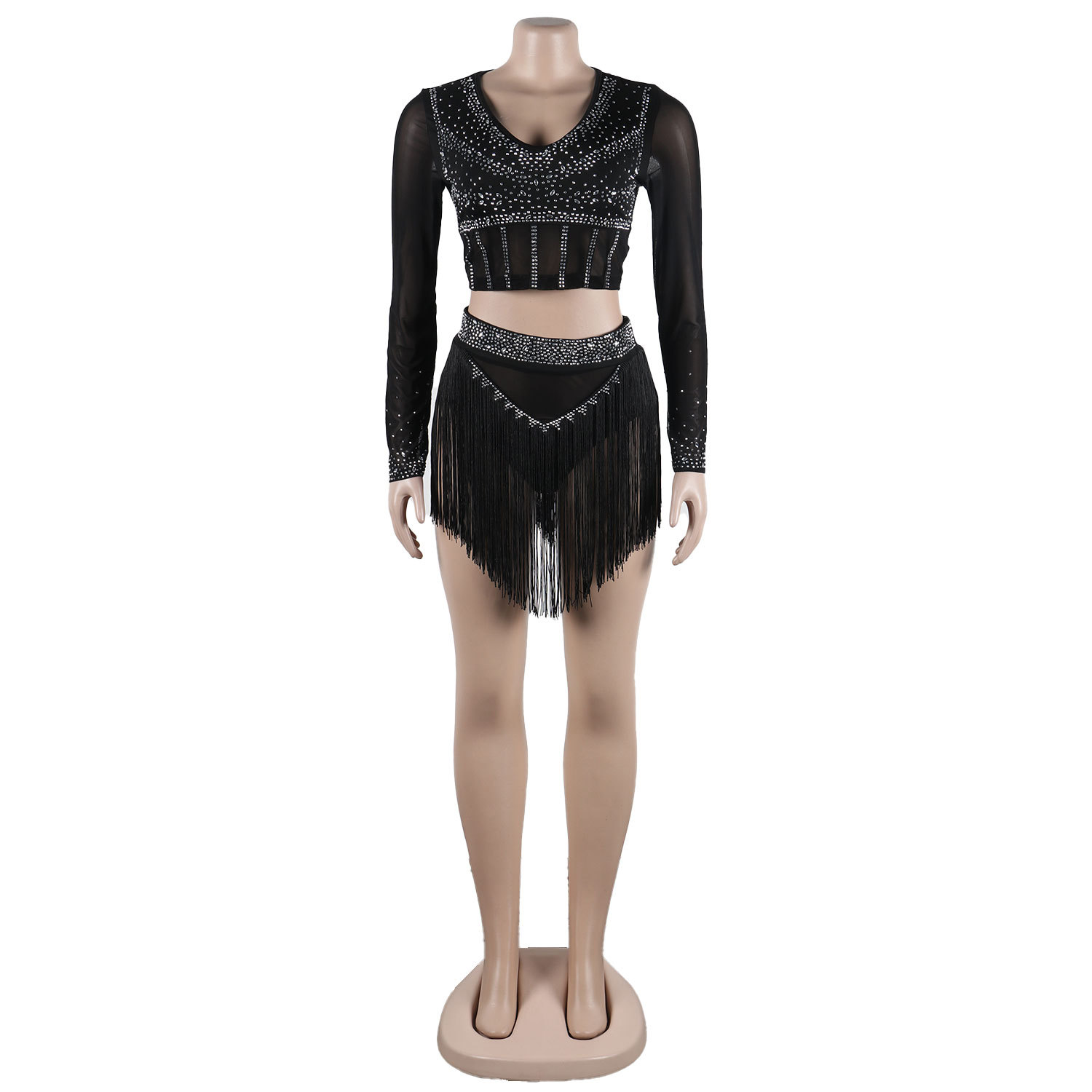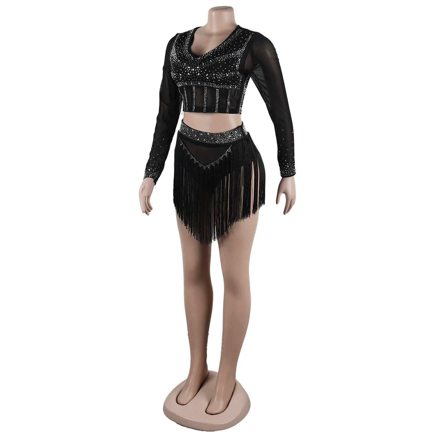 CM.YAYA Sexy Party Women’s Set Mesh Long Sleeve Dimonds Hot Drill Tee Top + Tassel Shortst 2023 Two 2 Piece Set Outfit Tracksuit