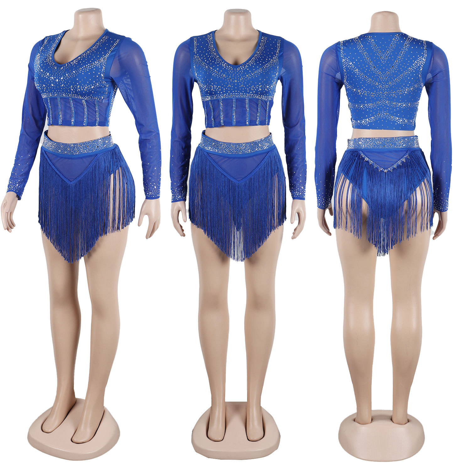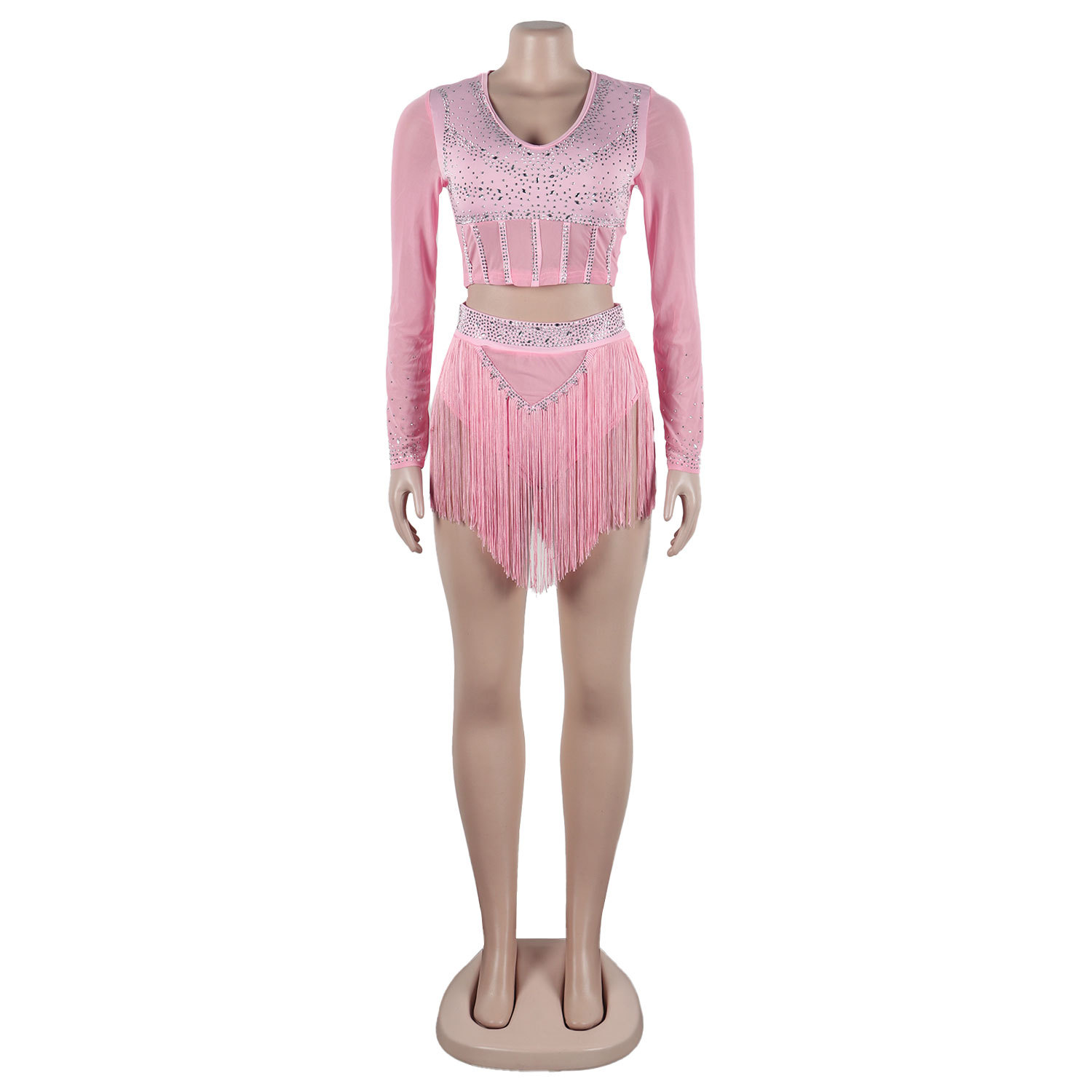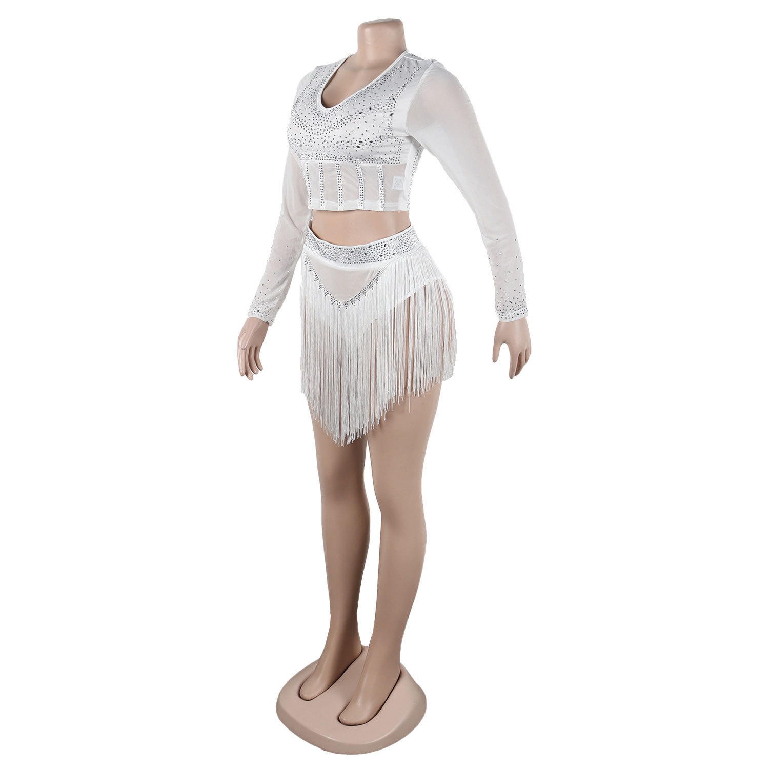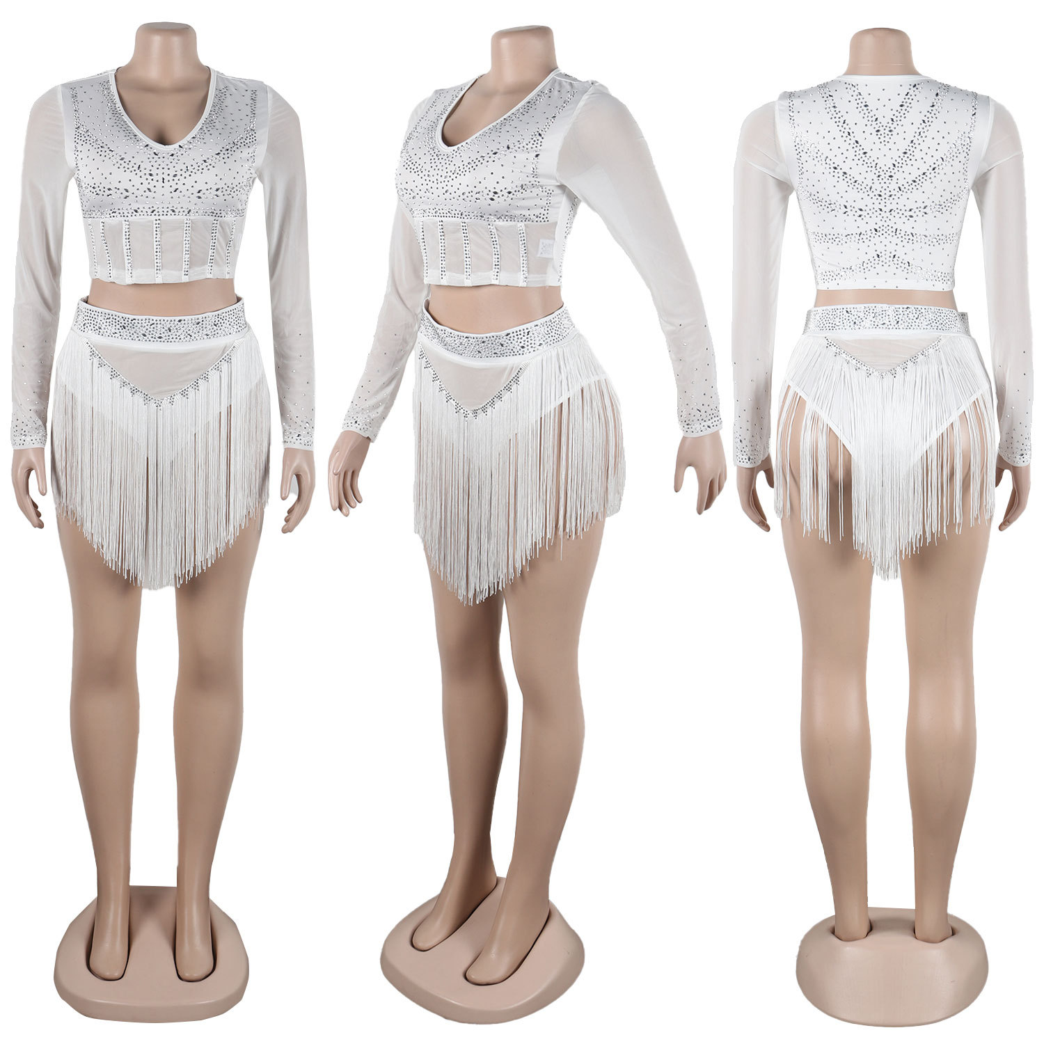 CM.YAYA Sexy Party Women’s Set Mesh Long Sleeve Dimonds Hot Drill Tee Top + Tassel Shortst 2023 Two 2 Piece Set Outfit Tracksuit