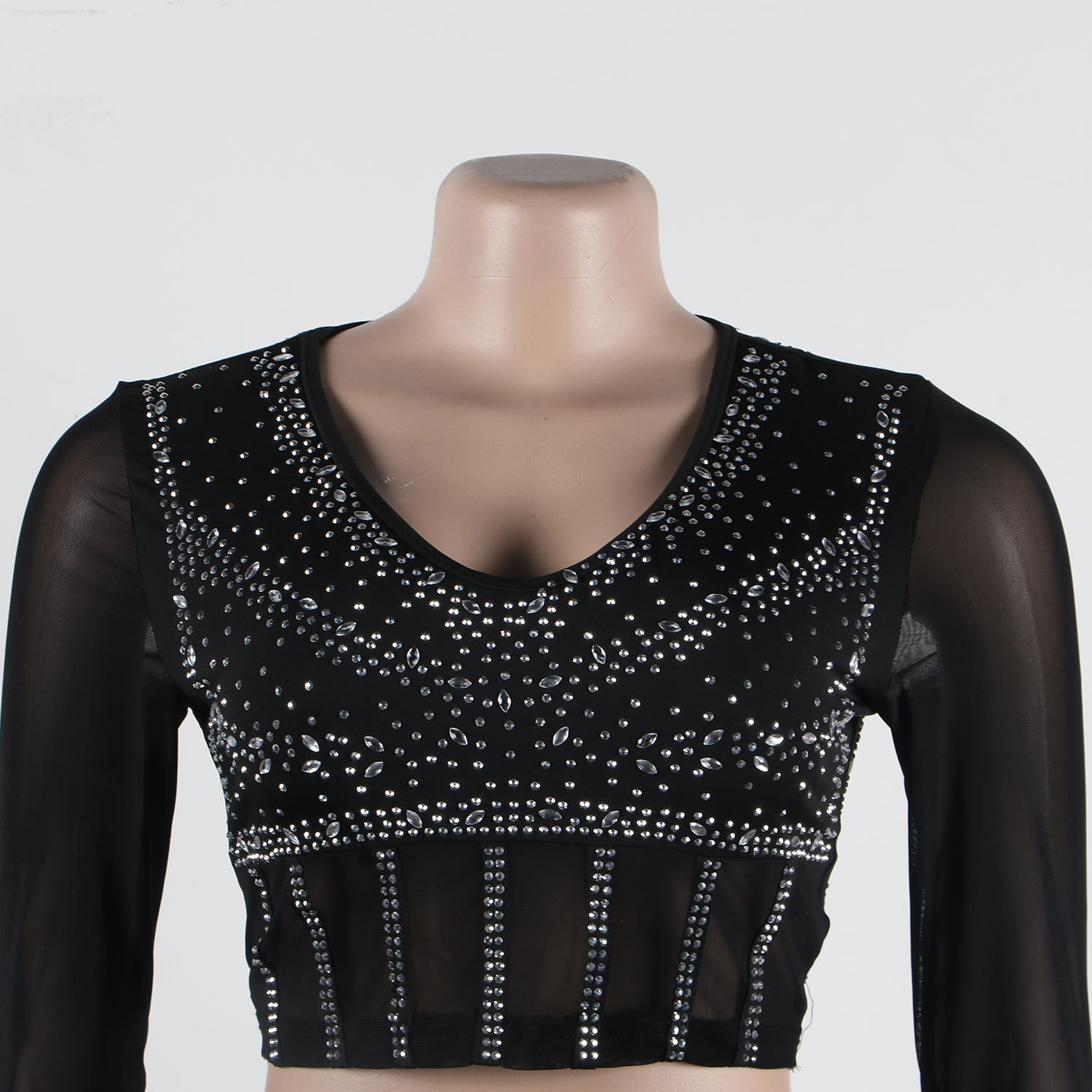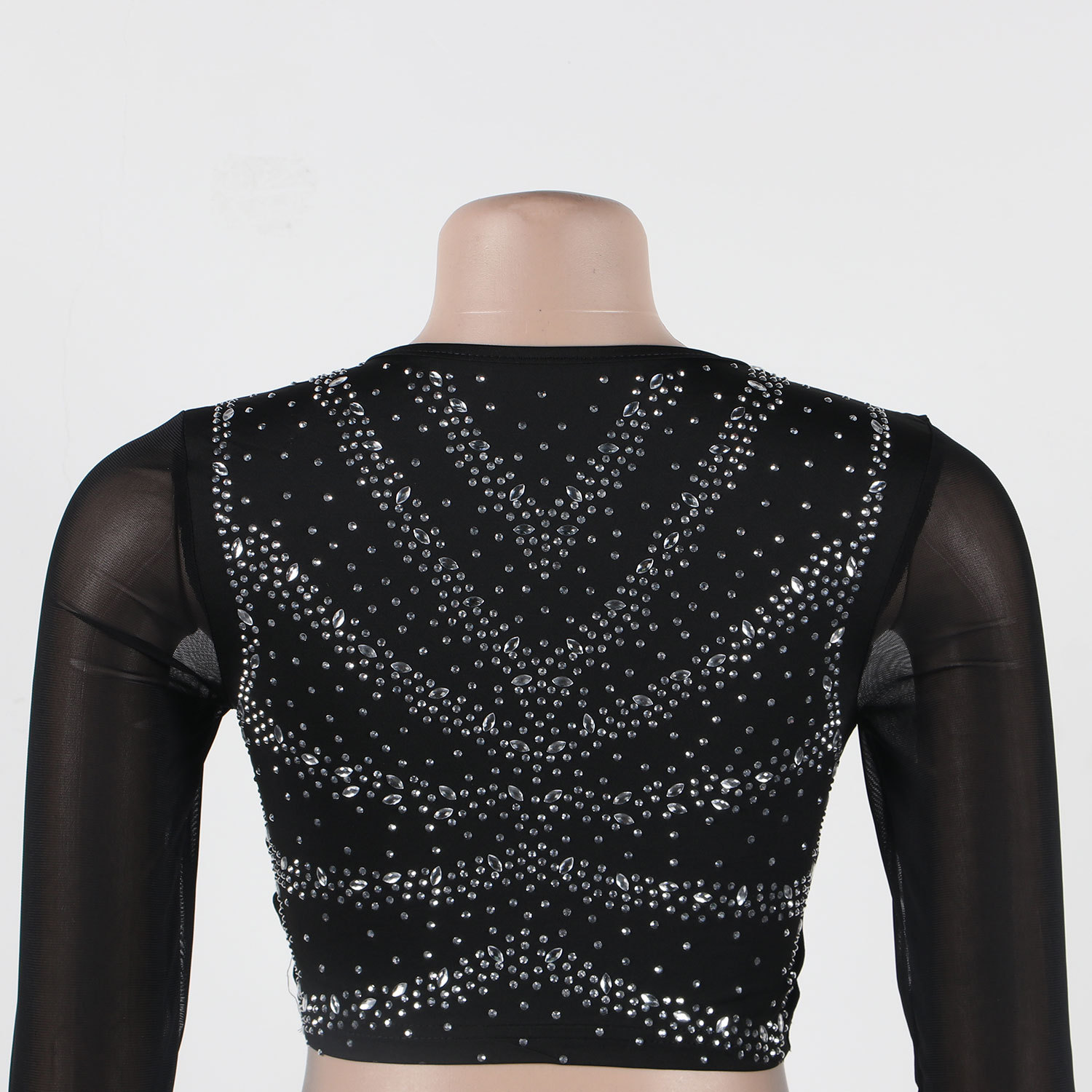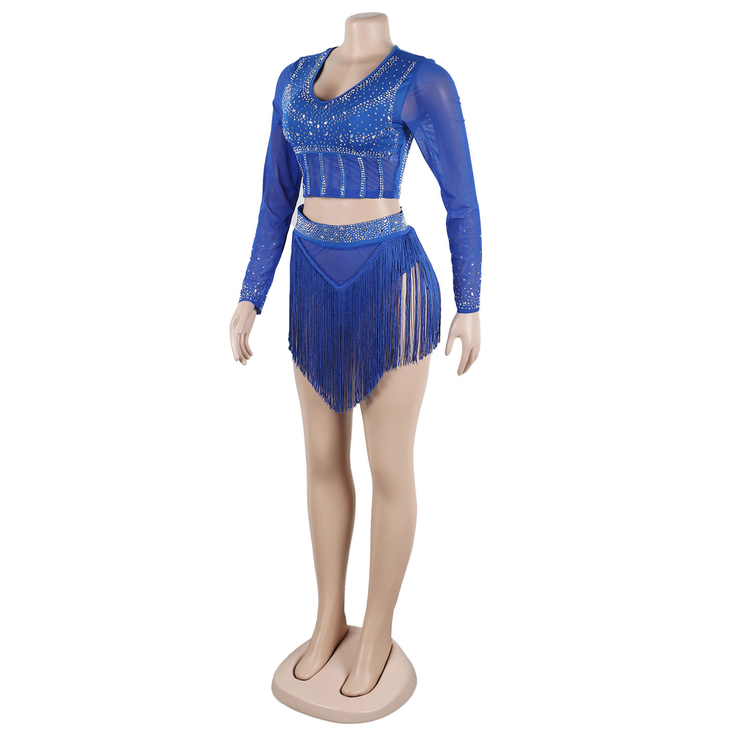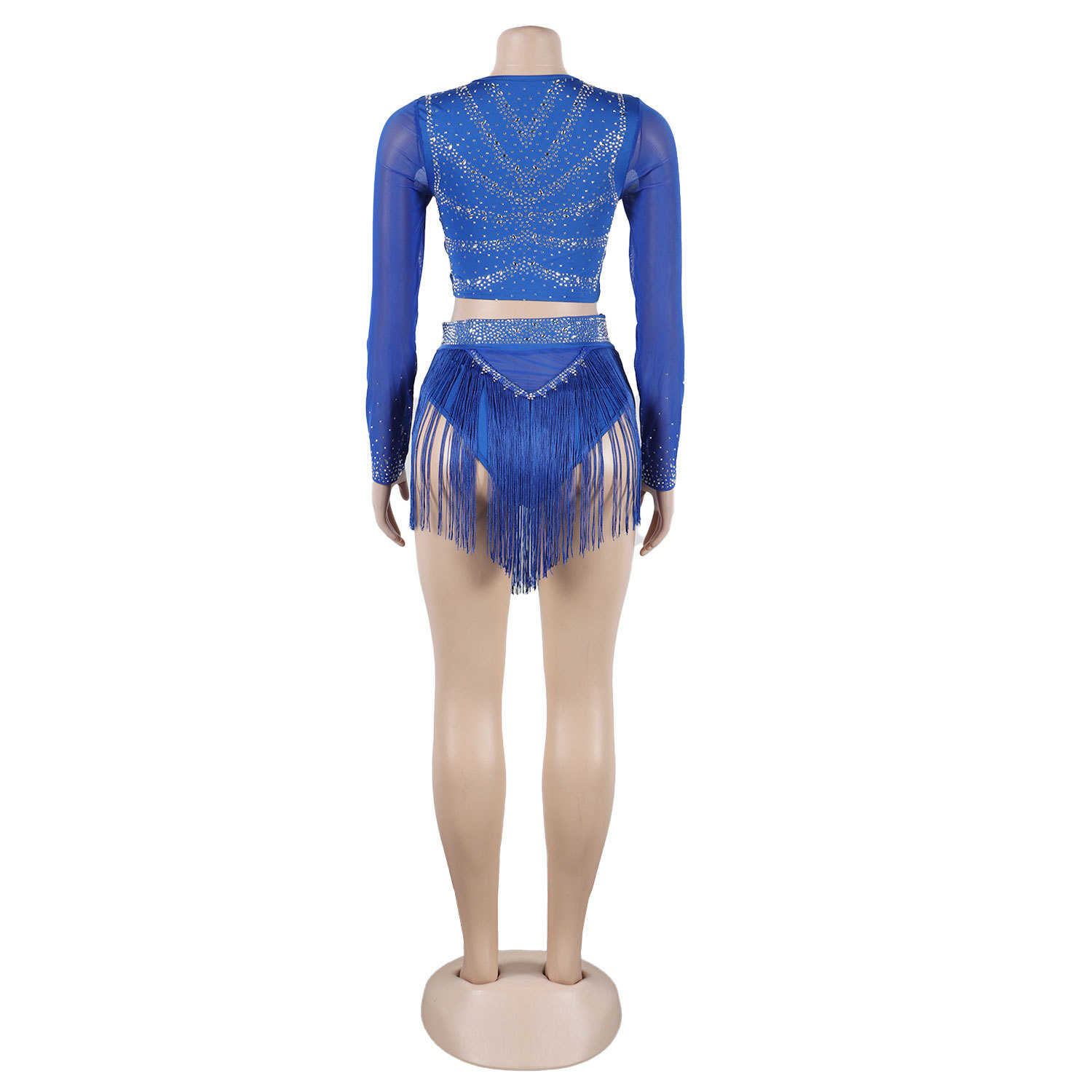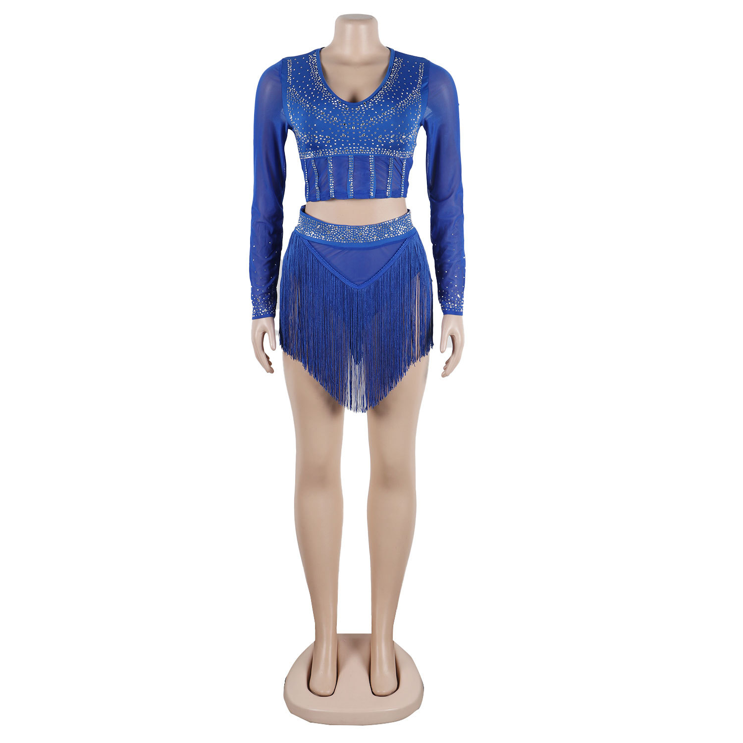 CM.YAYA Sexy Party Women’s Set Mesh Long Sleeve Dimonds Hot Drill Tee Top + Tassel Shortst 2023 Two 2 Piece Set Outfit Tracksuit