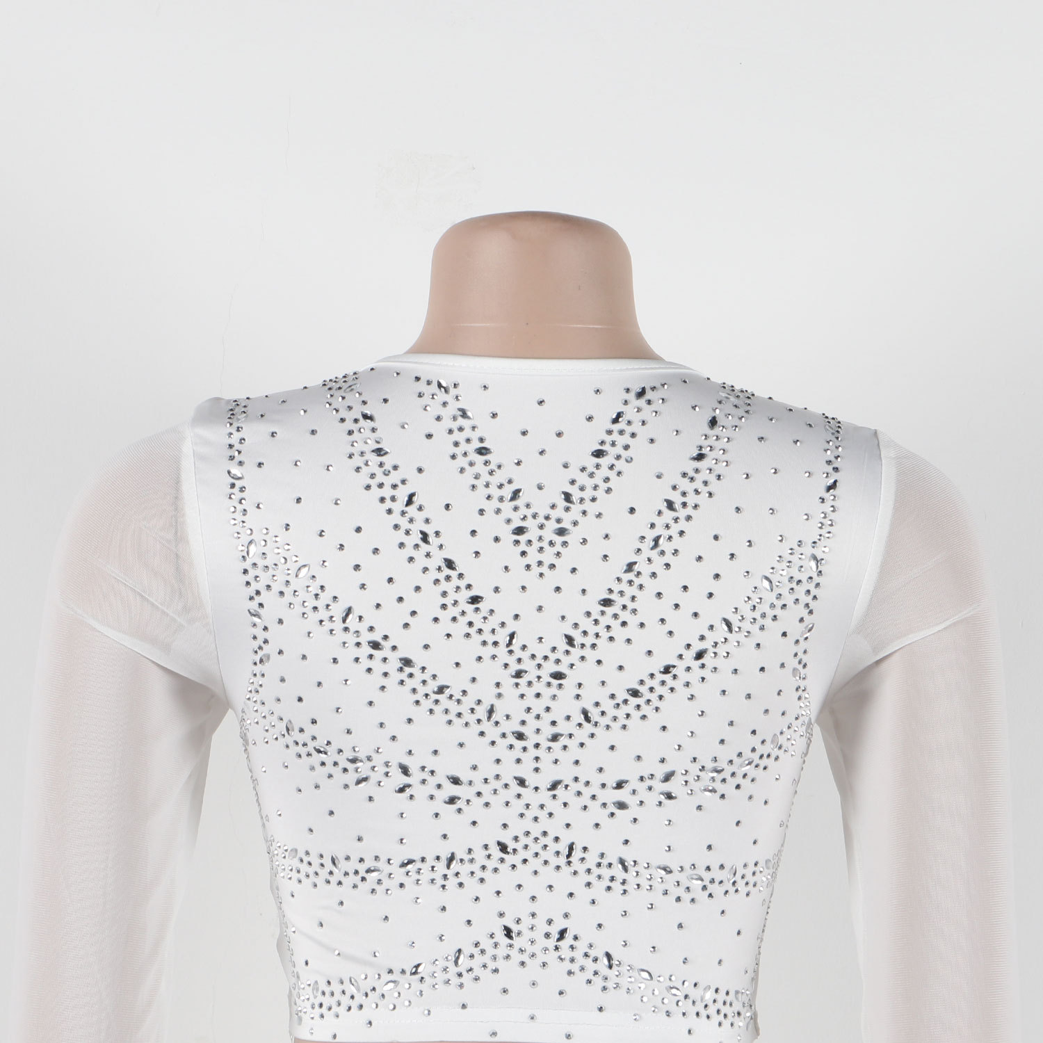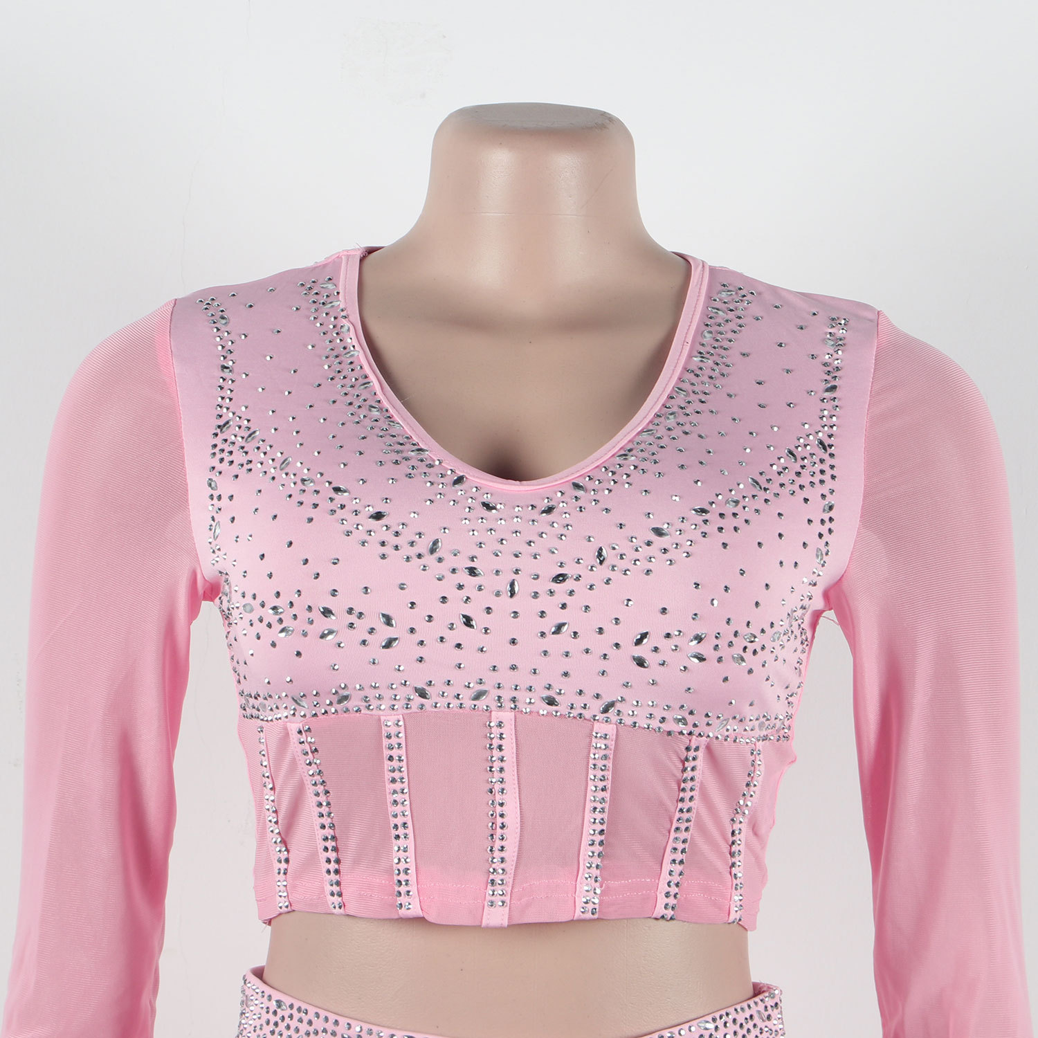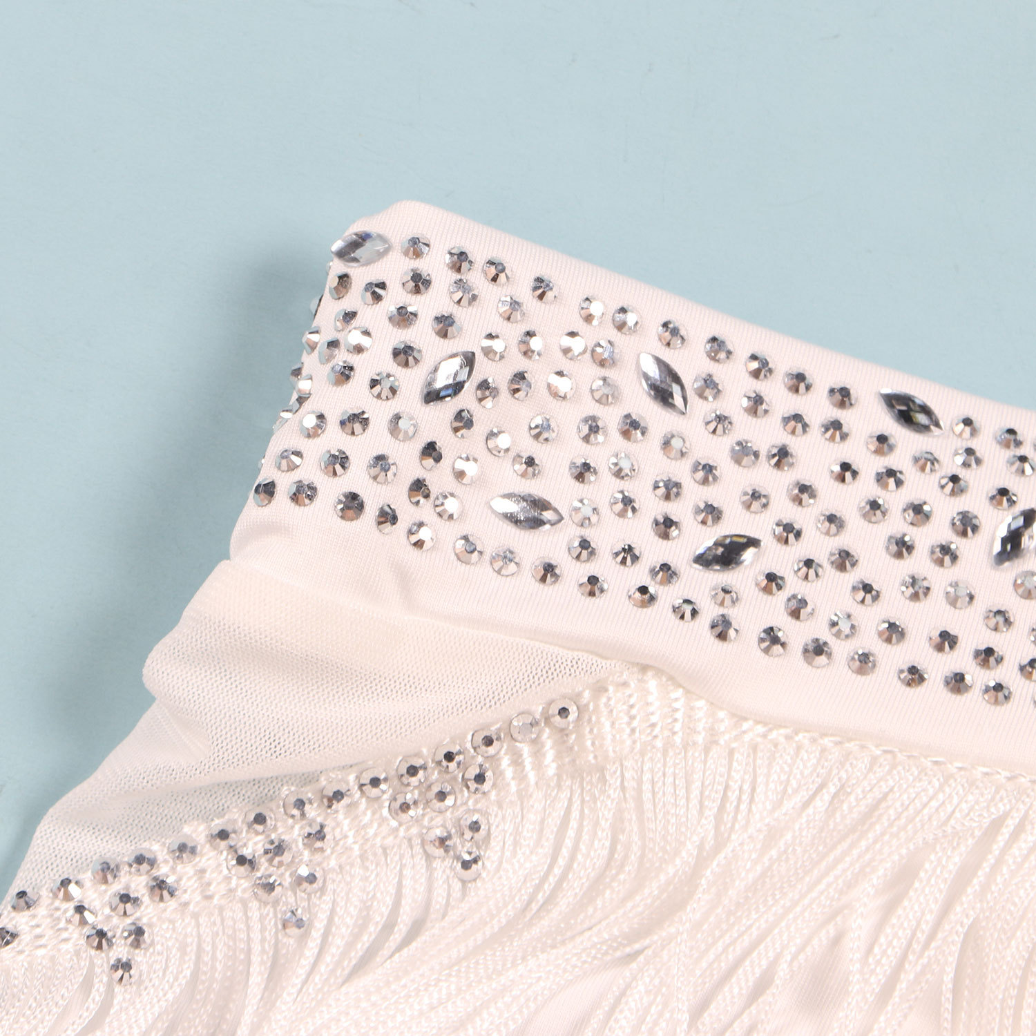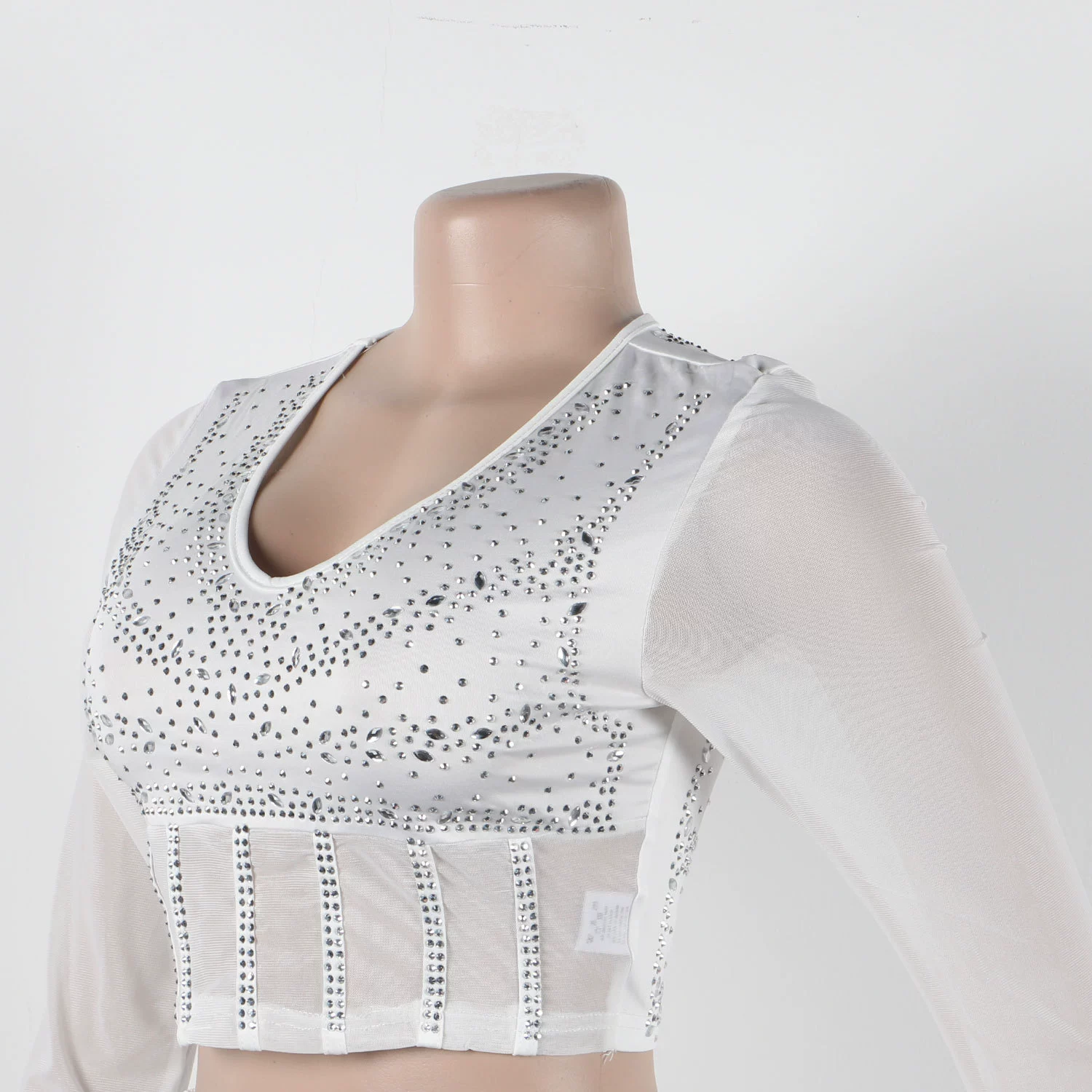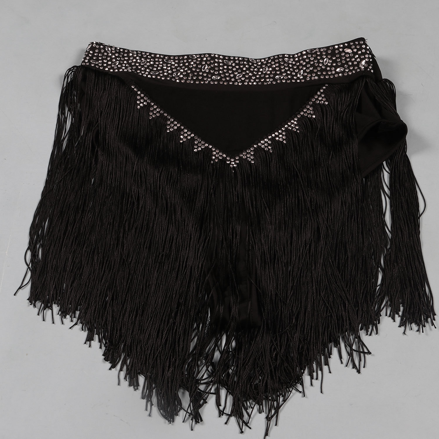 CM.YAYA Sexy Party Women’s Set Mesh Long Sleeve Dimonds Hot Drill Tee Top + Tassel Shortst 2023 Two 2 Piece Set Outfit Tracksuit