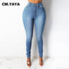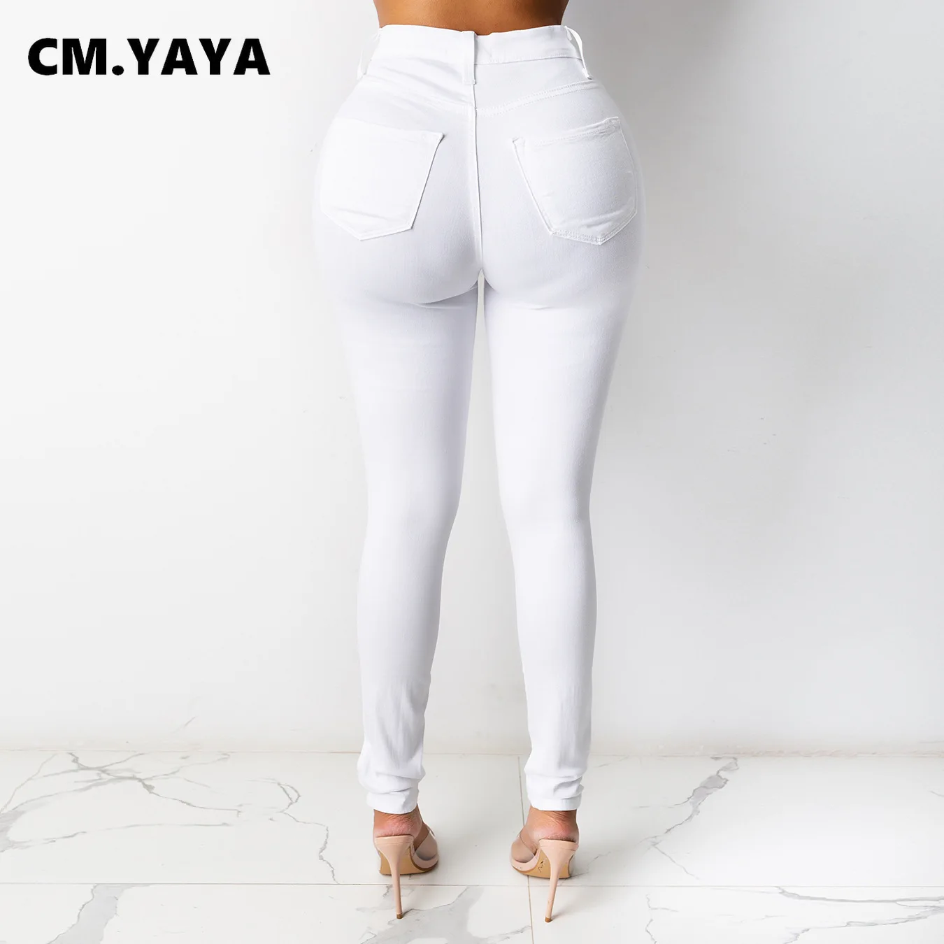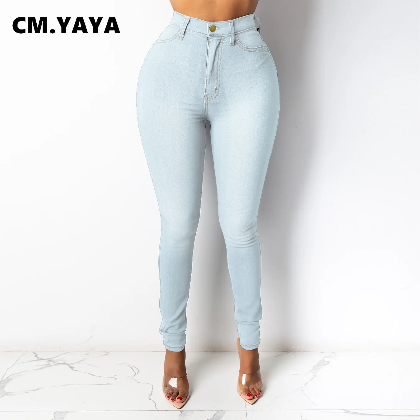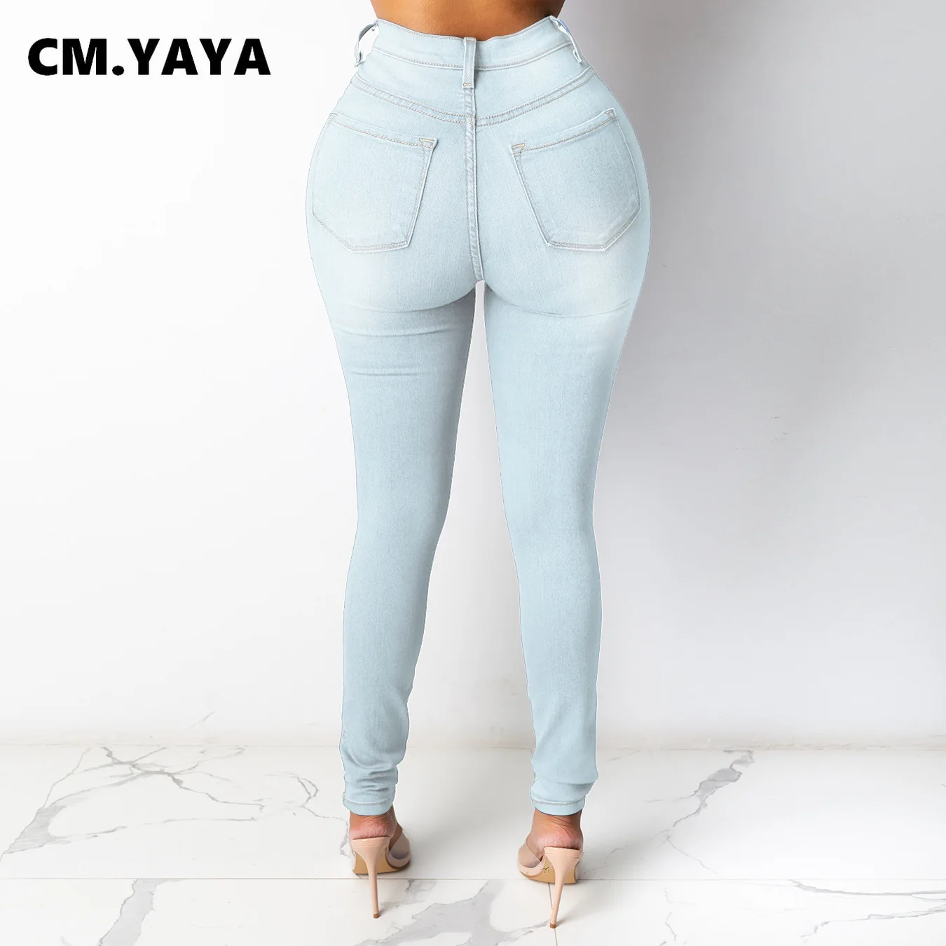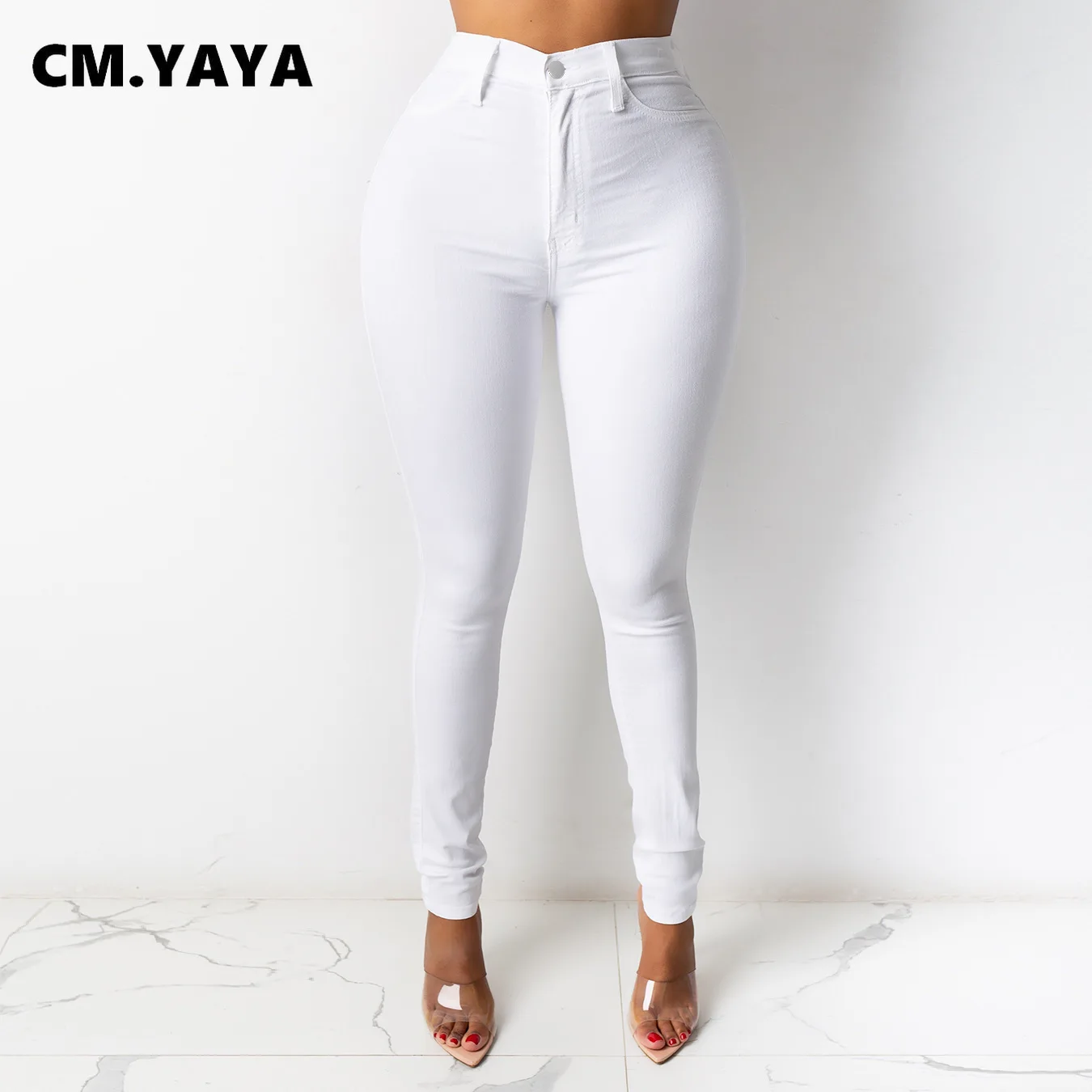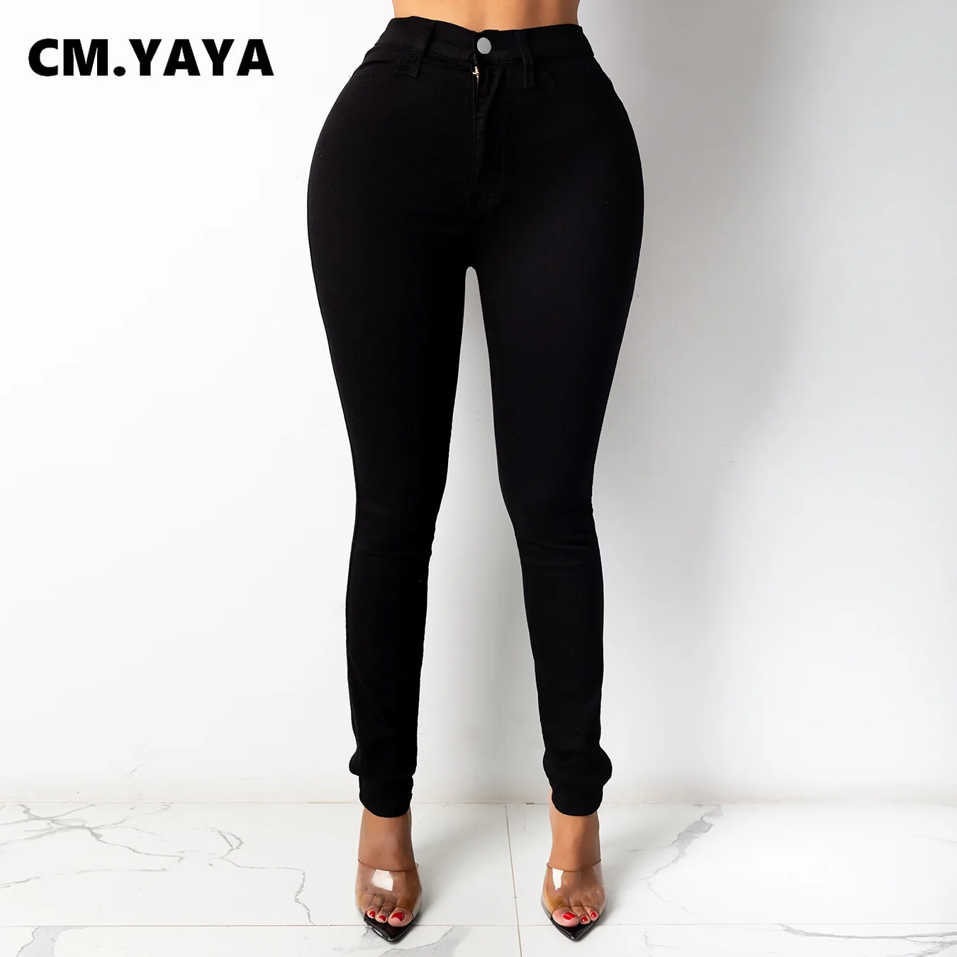 CM.YAYA Solid Full Length Women Jeans Fake Zippers Skinny Elastic High Waist Jeans with Pockets Women High Street Pencil Pants