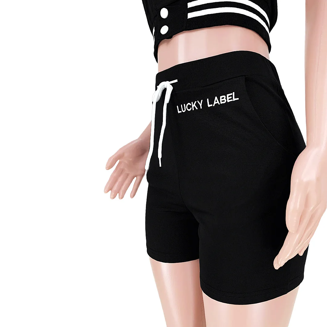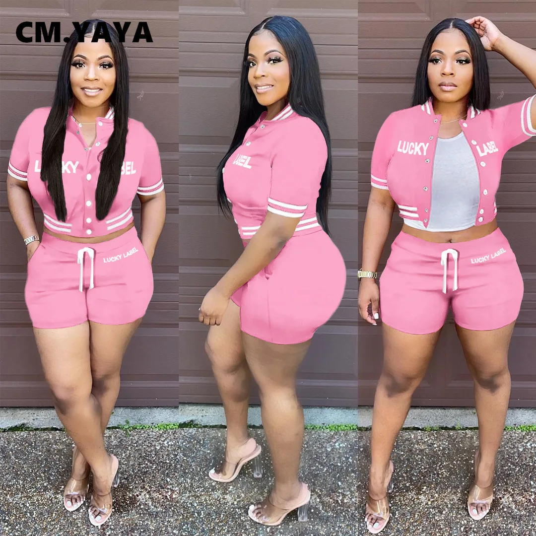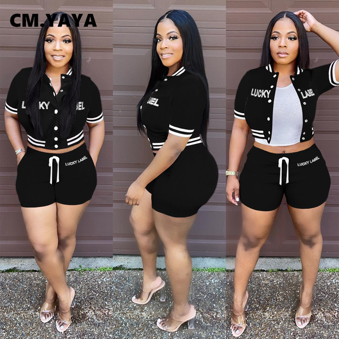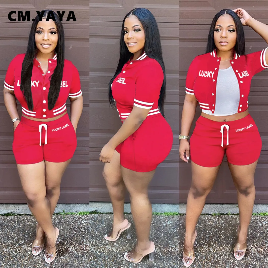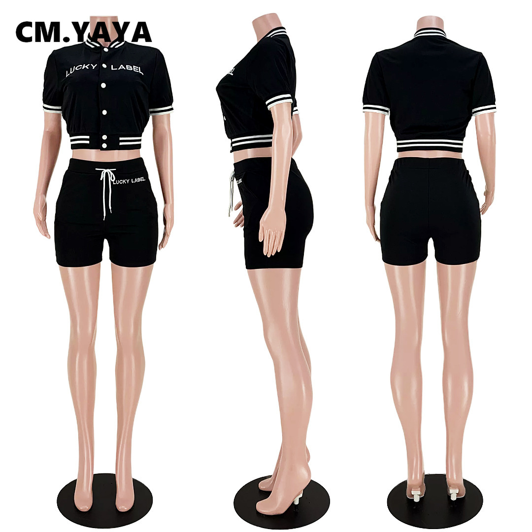 CM.YAYA Sport Baseball Lucky Label Women Two 2 Piece Set Outfit 2022 Summer Shorts and Short Sleeve Track Top Active Tracksuit