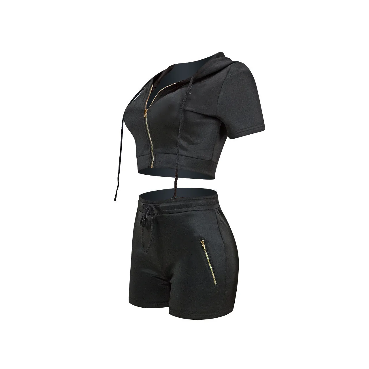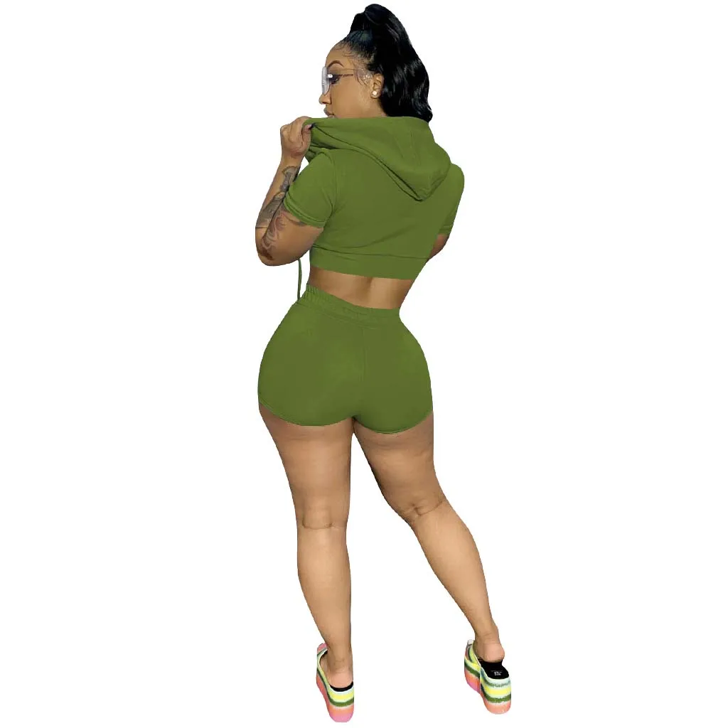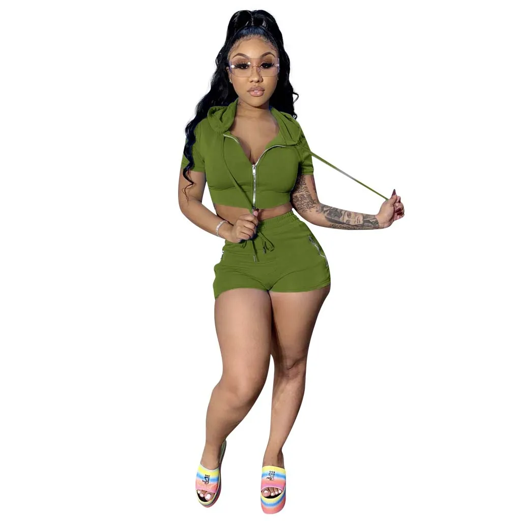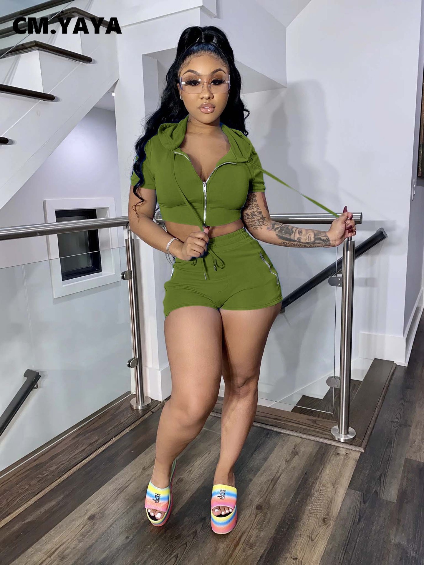 CM.YAYA Sport Solid Color Women Two Piece Set Tracksuits Hooded Zipper Tops Shorts Jogger Suit Outfits Matching Set Outfits