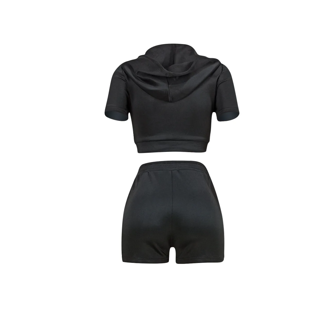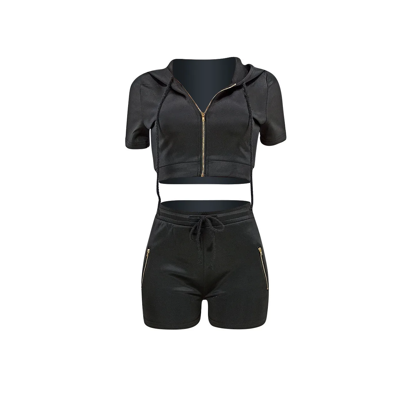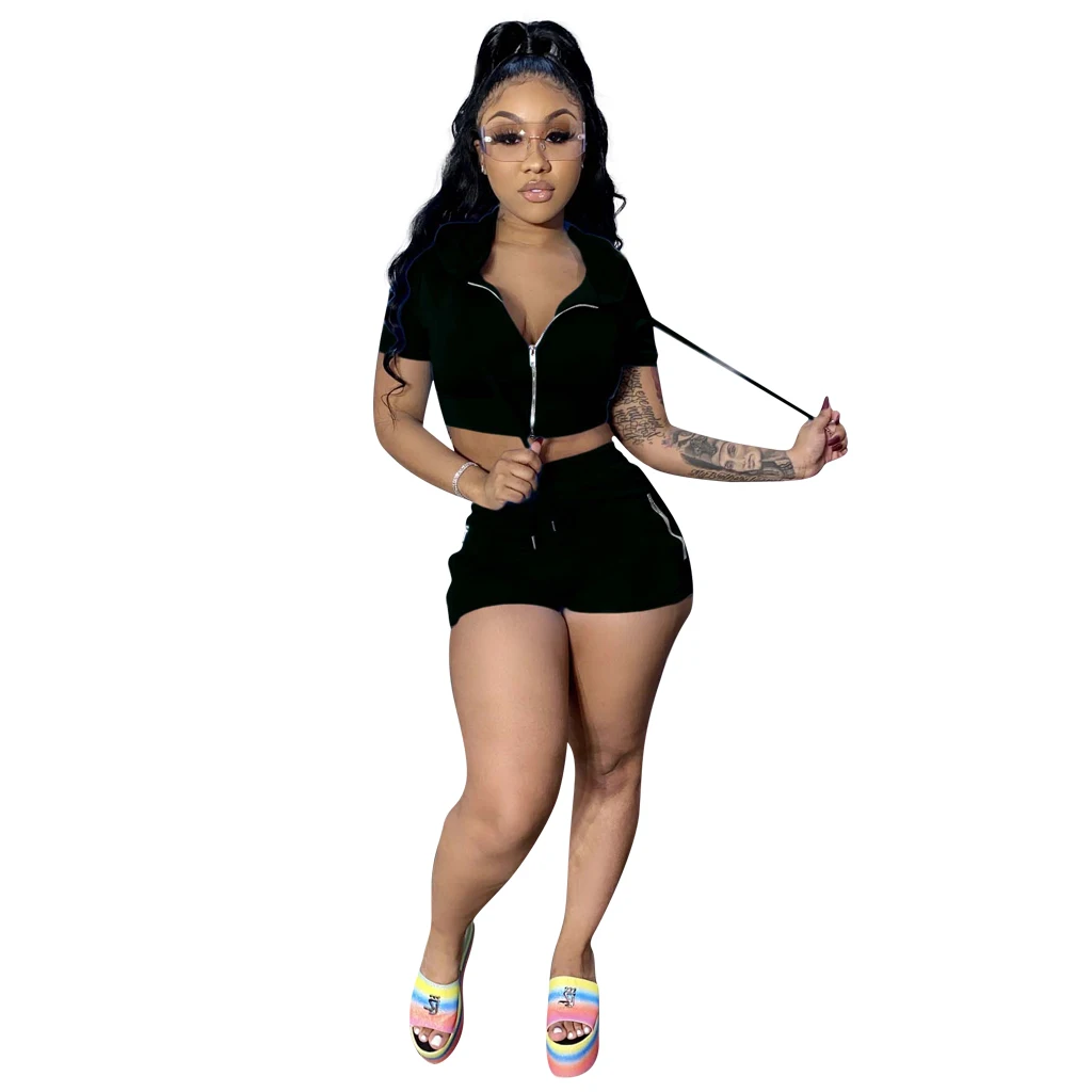 CM.YAYA Sport Solid Color Women Two Piece Set Tracksuits Hooded Zipper Tops Shorts Jogger Suit Outfits Matching Set Outfits