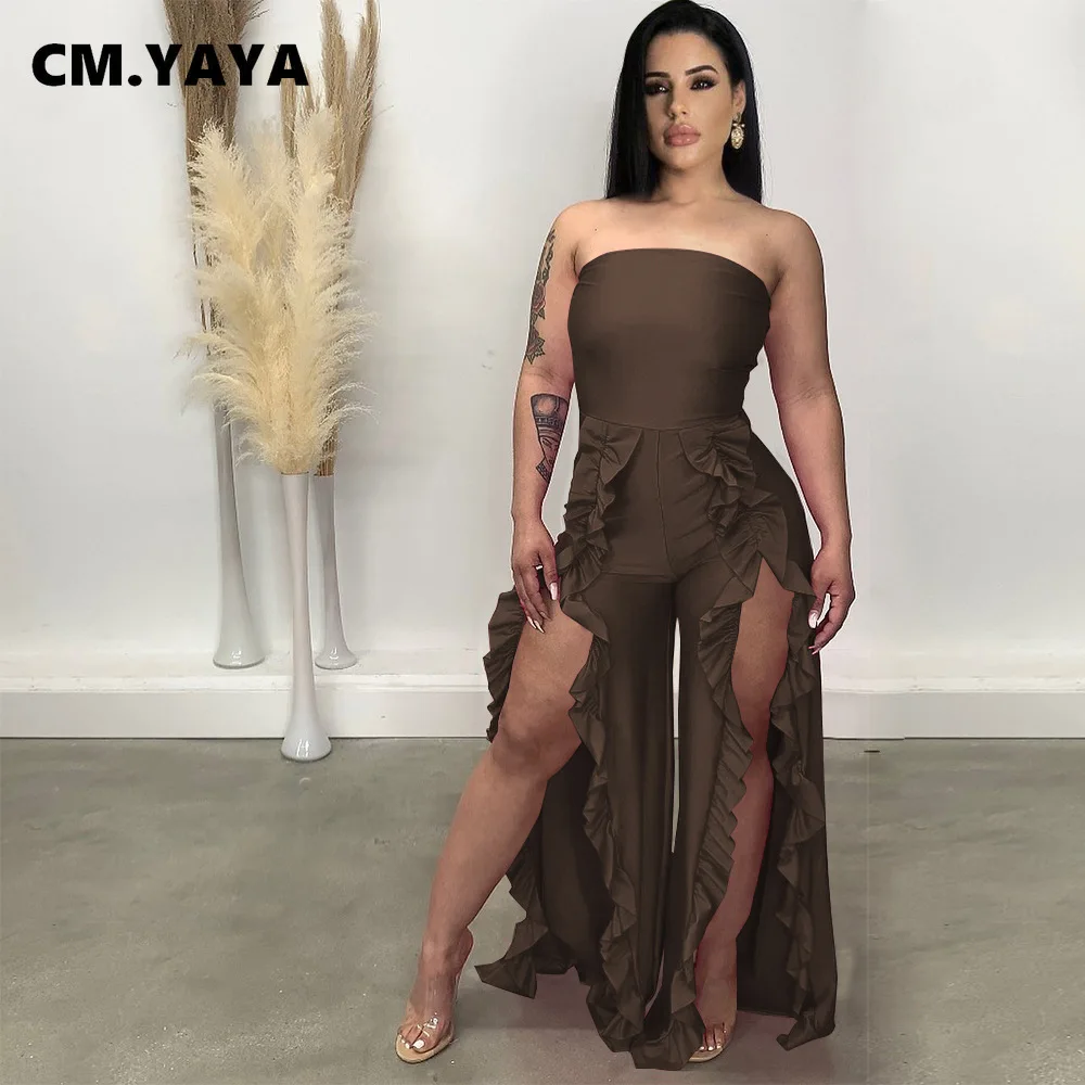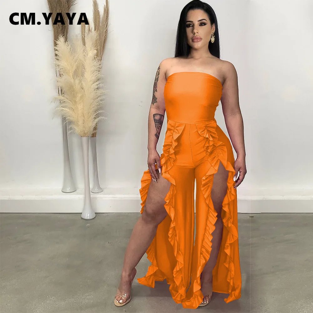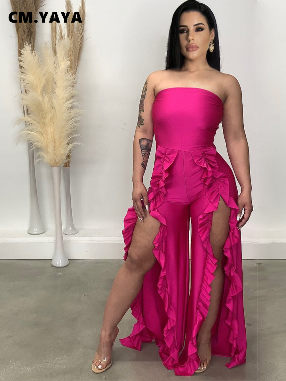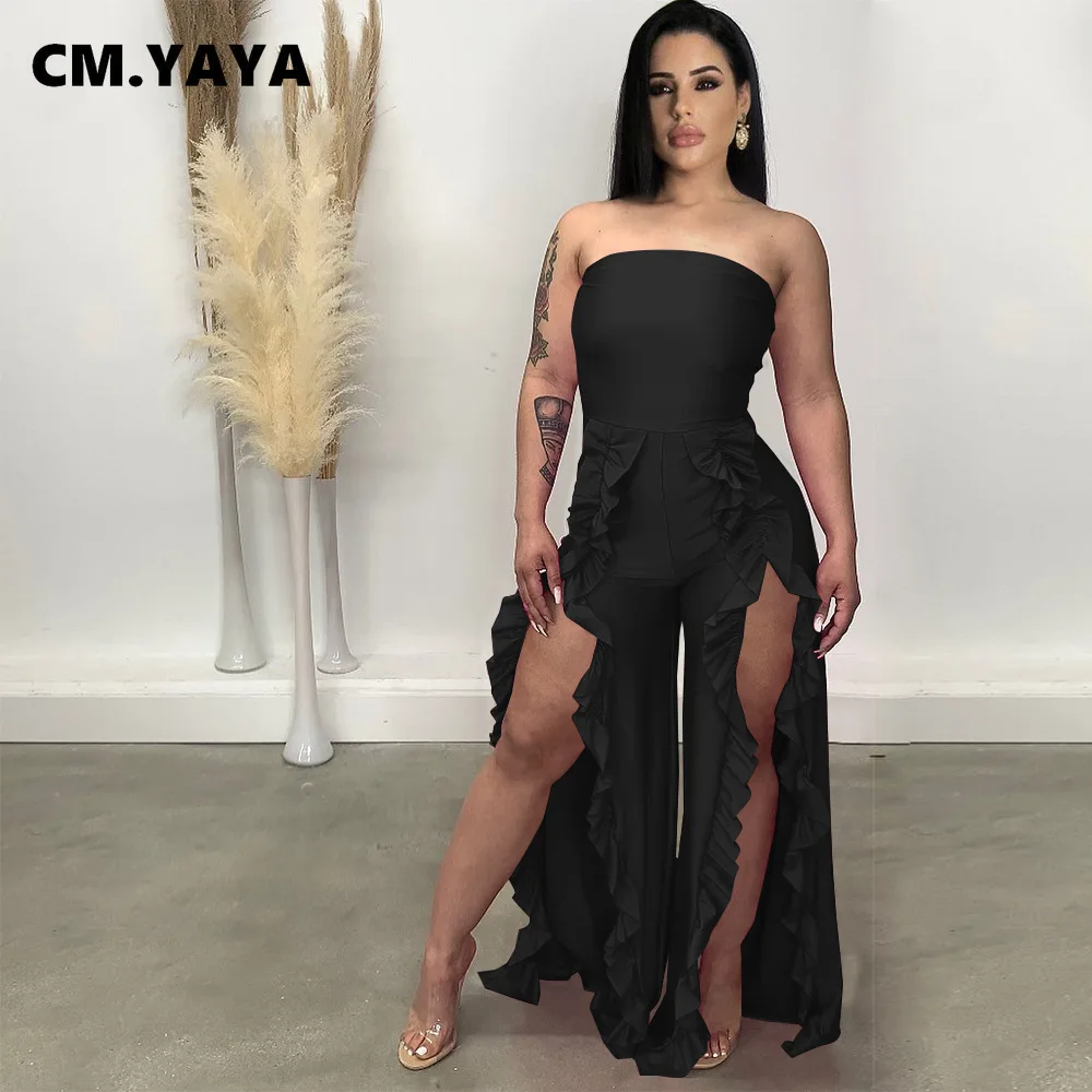 CM.YAYA Strapless Ruffles Edible Tree Fungus High Split Sexy Party Jumpsuit for Women 2022 Summer Elastic Overall Romper