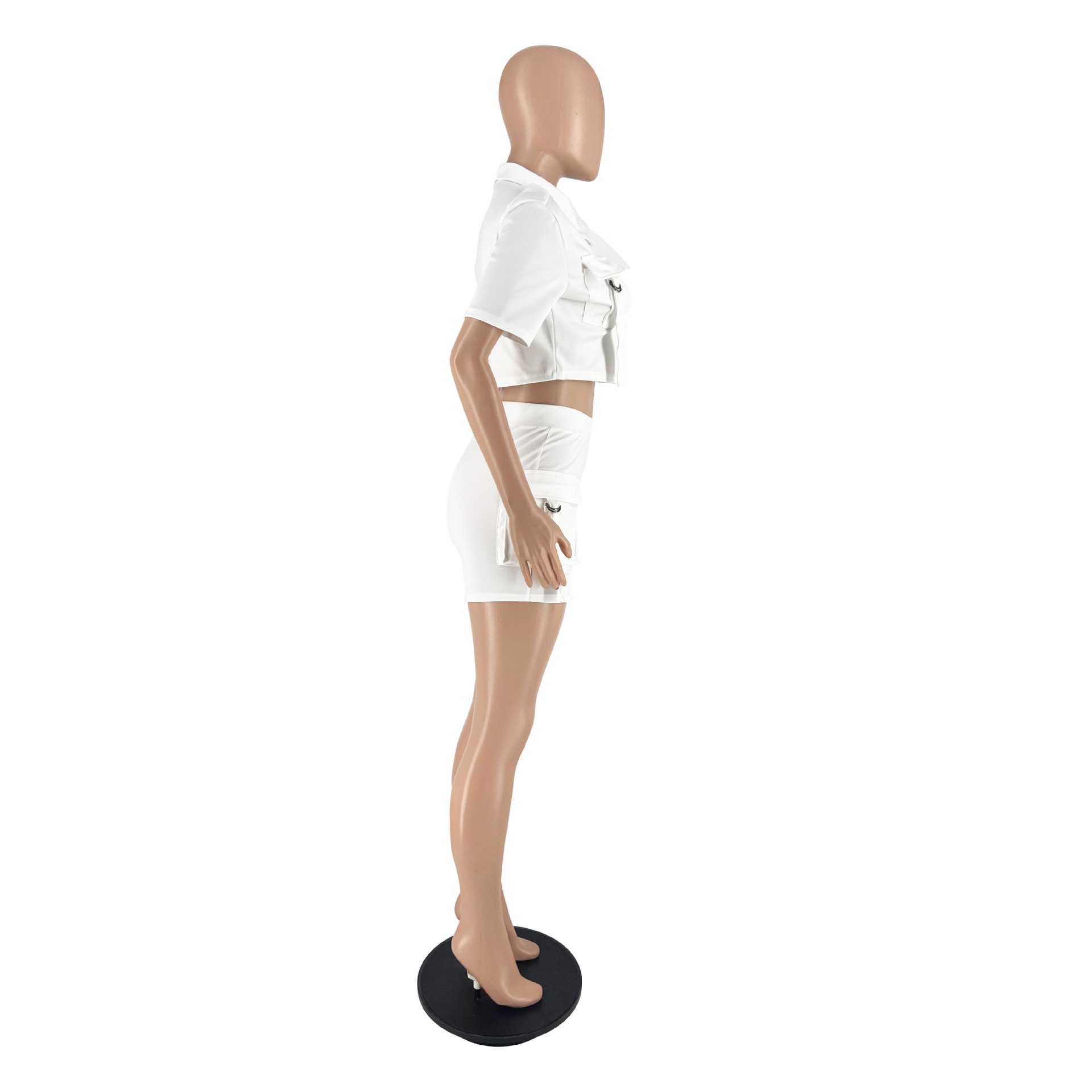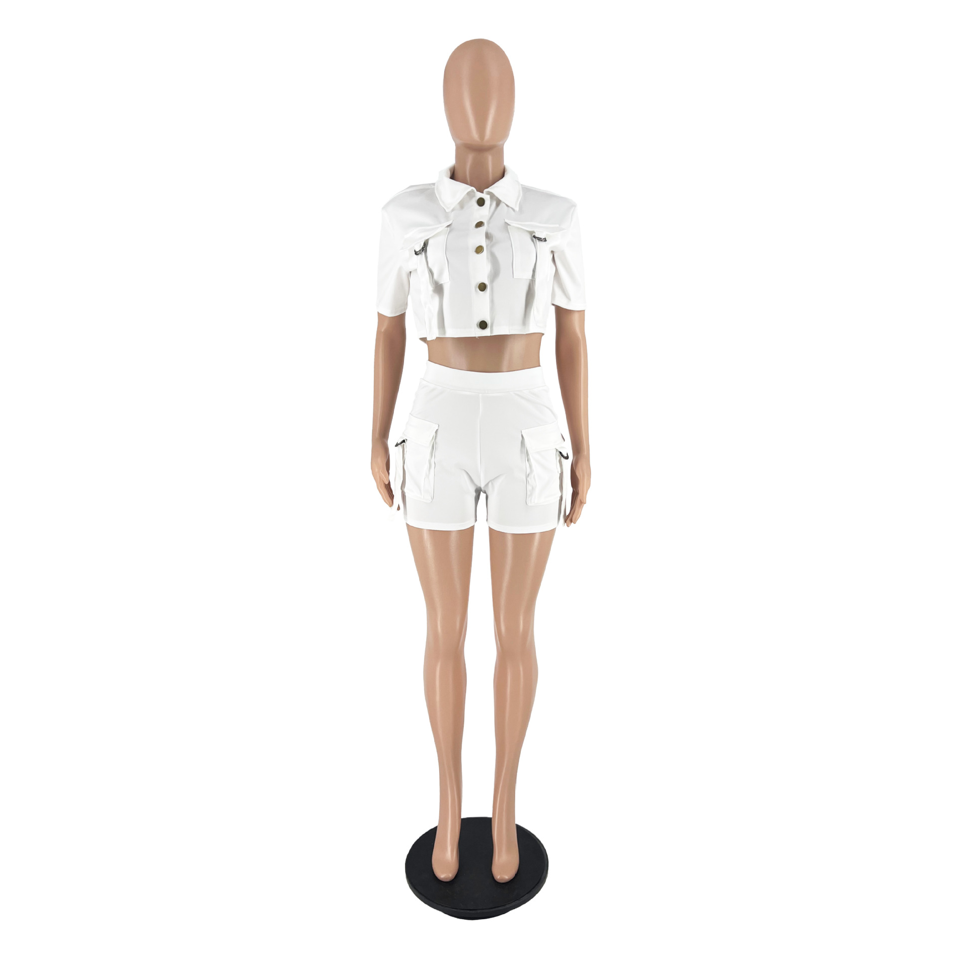CM.YAYA Street Cargo Style Women’s Set Pocket Shirt and Safari Style Shorts 2023 INS Sweatsuit Two 2 Piece Set Outfit Tracksuit