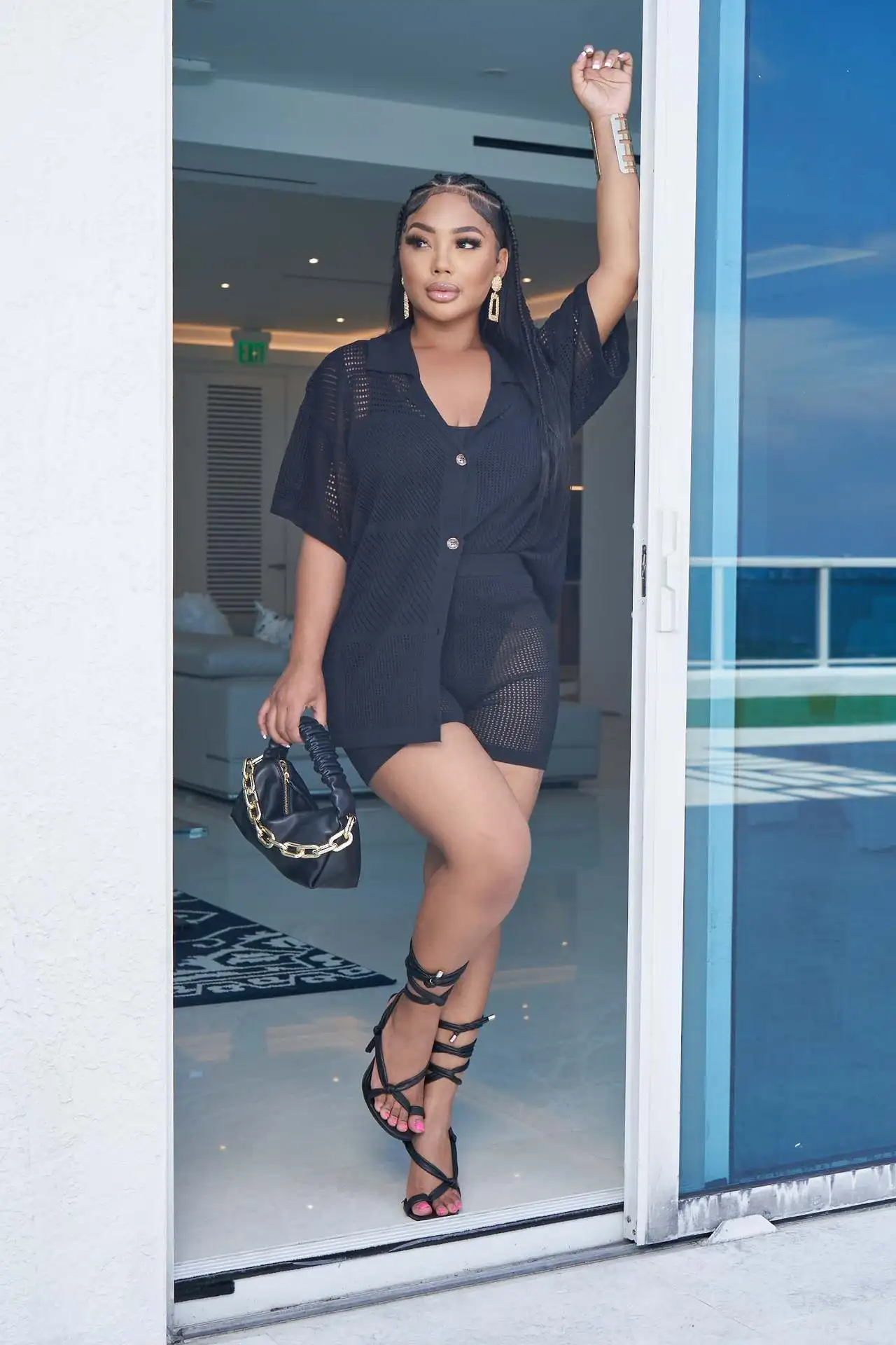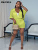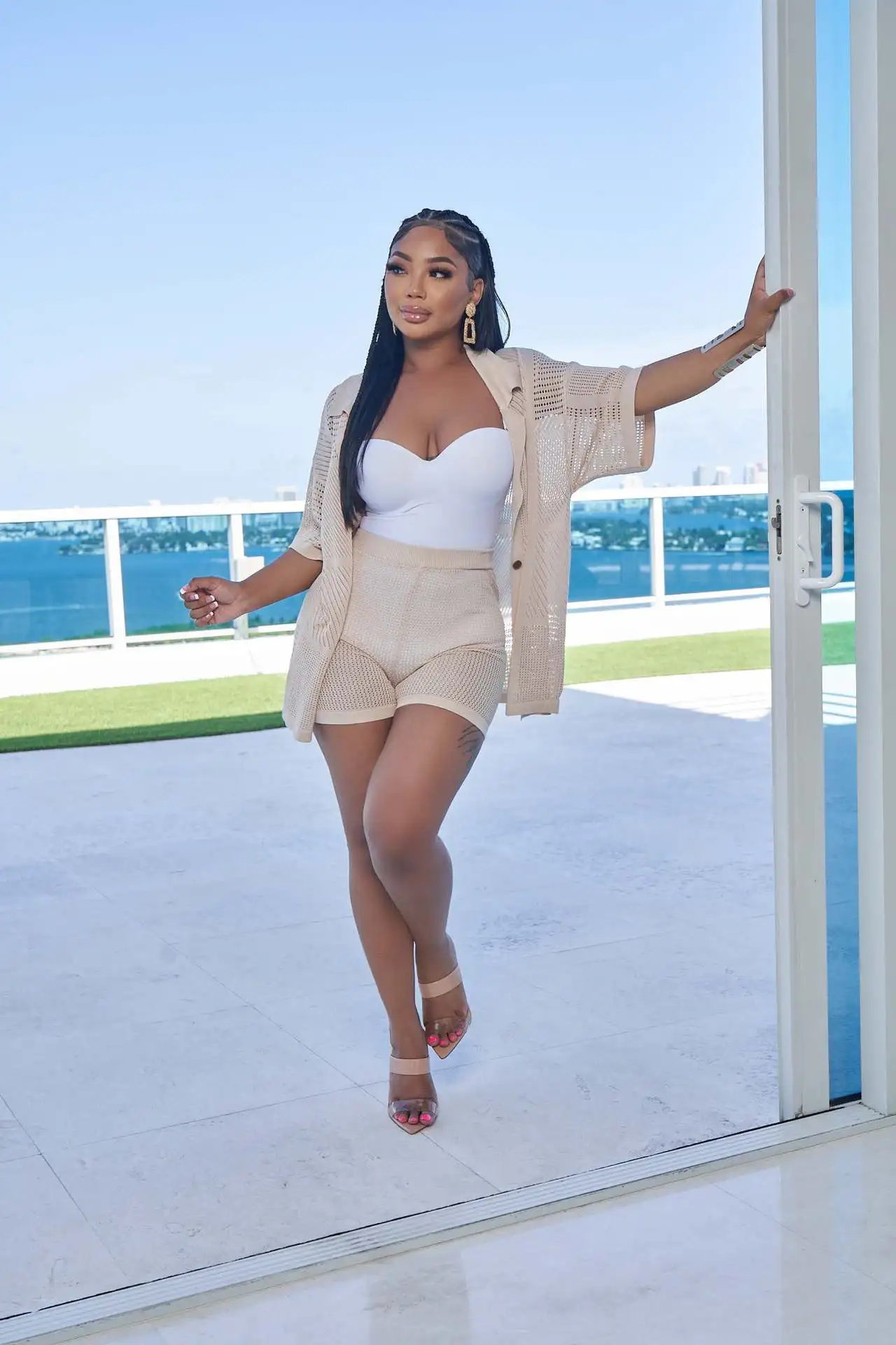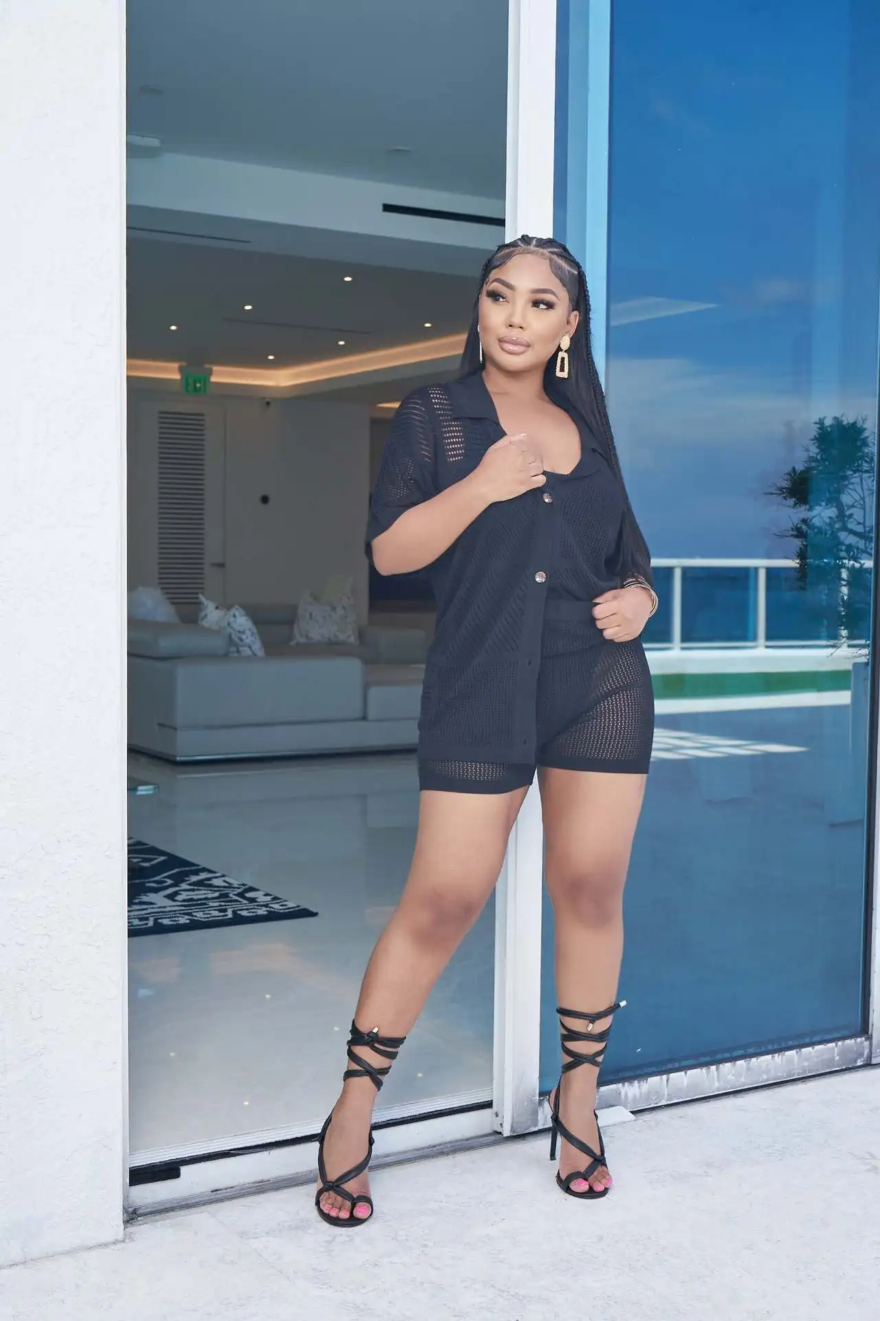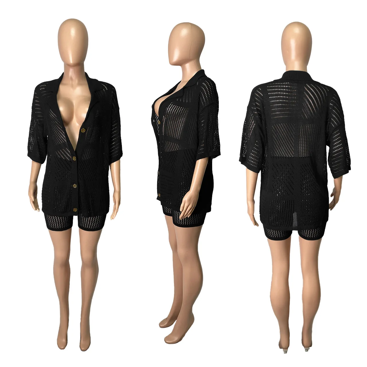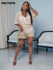CM.YAYA Street Knit Ribbed Women Set Short Sleeve Lapel Collar Sweater Top and Shorts Suit Tracksuit Two Piece Set Chic Outfit