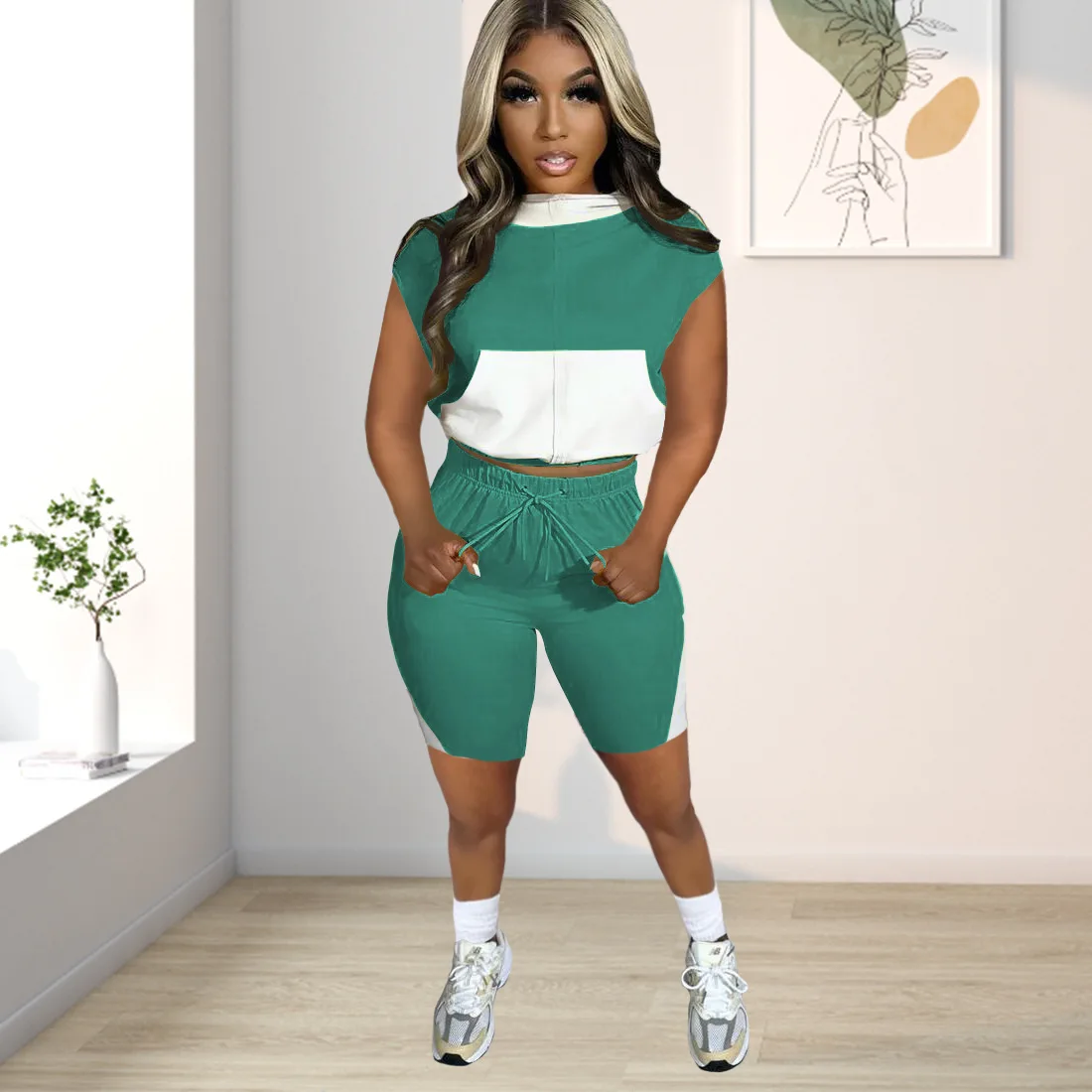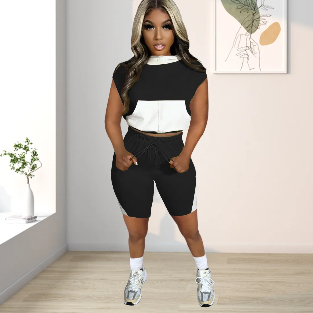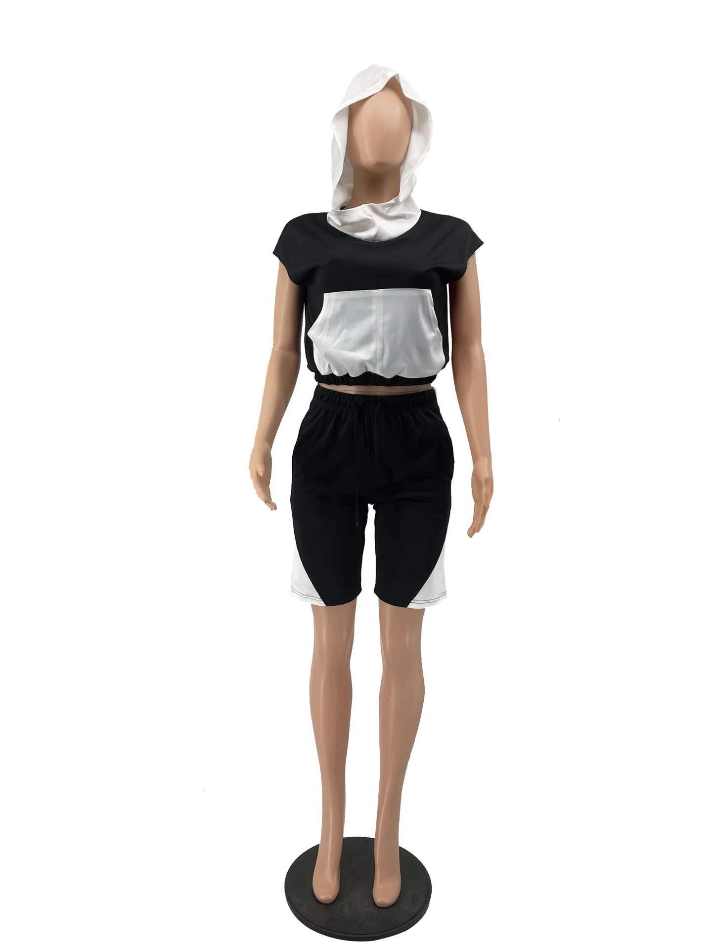 CM.YAYA Street Patchwork Women’s Set Hooded Sleeveless Sweatshirt + Knee Length Pants INS 2023 Two 2 Piece Set Outfit Tracksuit